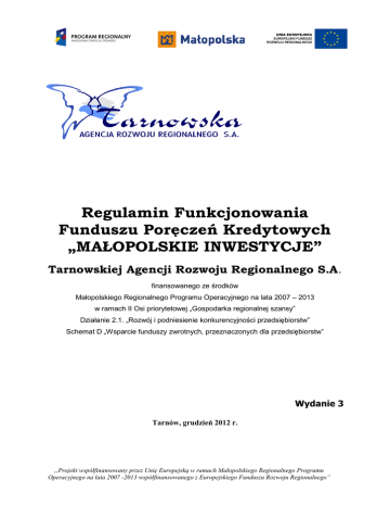 Regulamin Funkcjonowania Funduszu Poręczeń Kredytowych „MAŁOPOLSKIE INWESTYCJE” Tarnowskiej Agencji Rozwoju Regionalnego S.A. finansowanego ze środków Małopolskiego Regionalnego Programu Operacyjnego na lata 2007 – 2013 w ramach II Osi priorytetowej „Gospodarka regionalnej szansy” Działanie 2.1. „Rozwój i podniesienie konkurencyjności przedsiębiorstw” Schemat D „Wsparcie funduszy zwrotnych, przeznaczonych dla przedsiębiorstw” Wydanie 3 Tarnów, grudzień 2012 r. „Projekt współfinansowany przez Unię Europejską w ramach Małopolskiego Regionalnego Programu Operacyjnego na lata 2007 -2013 współfinansowanego z Europejskiego Funduszu Rozwoju Regionalnego” WSTĘP Niniejszy Regulamin określa zasady funkcjonowania oraz procedury stosowane w Funduszu Poręczeń Kredytowych „Małopolskie Inwestycje” prowadzonego w ramach Tarnowskiej Agencji Rozwoju Regionalnego S.A. w Tarnowie. Głównym celem Działania 2.1 „Rozwój i podniesienie konkurencyjności przedsiębiorstw” jest stworzenie silnego i konkurencyjnego sektora małopolskich przedsiębiorstw poprzez bezpośrednią pomoc finansową dla MŚP, jak również poprzez wsparcie finansowe rozbudowy systemu zewnętrznych źródeł finansowania działalności przedsiębiorstw, w tym wsparcie tworzenia nowych i wzmacniania istniejących funduszy poręczeniowych. Celem Funduszu Poręczeń Kredytowych „Małopolskie Inwestycje” jest ułatwienie przedsiębiorcom dostępu do zewnętrznego finansowania działalności gospodarczej. Fundusz Poręczeń Kredytowych – Małopolskie Inwestycje poręcza zobowiązania finansowe mikro, małych i średnich przedsiębiorstw, które posiadają zdolność kredytową, lecz nie posiadają wymaganych przez banki i inne instytucje finansujące zabezpieczeń lub nie chcą ich wykorzystać. Fundusz Poręczeń Kredytowych „Małopolskie Inwestycje” został powołany Uchwałą nr 4/2010/N Nadzwyczajnego Walnego Zgromadzenia Tarnowskiej Agencji Rozwoju Regionalnego S.A. z dnia 29.10.2010 roku, jako wyodrębniony księgowo fundusz osoby prawnej. Spółka Tarnowska Agencja Rozwoju Regionalnego S.A. uznaje funkcjonowanie Funduszu Poręczeń Kredytowych „Małopolskie Inwestycje” za istotny instrument wspierania działalności gospodarczej i traktuje go jako ważny element działalności statutowej Spółki na rzecz rozwoju gospodarczego regionu. Tarnowska Agencja Rozwoju Regionalnego S.A. spełnia wymogi normy PN-EN ISO 9001:2001 (identycznej z ISO 9001:2000), co potwierdza Certyfikat Systemu Zarządzania Jakością w zakresie „realizacja przedsięwzięć stymulujących rozwój społeczny i gospodarczy regionu”. W Spółce obowiązuje Księga Jakości określająca Politykę Jakości i organizację Spółki oraz prezentująca elementy wdrożonego systemu zarządzania jakością w oparciu o zidentyfikowane obszary działalności –procesy. Rozdział 1 . Postanowienia ogólne. § 1. 1. Ilekroć w Regulaminie jest mowa o: 1) Funduszu Poręczeń Kredytowych- Małopolskie Inwestycje (zwanym dalej Funduszem) należy przez to rozumieć wyodrębniony księgowo fundusz Tarnowskiej Agencji Rozwoju Regionalnego S.A. służący zabezpieczeniu kredytów i pożyczek, 2) Zarządzie – należy przez to rozumieć Zarząd Tarnowskiej Agencji Rozwoju Regionalnego S.A., 3) Radzie Nadzorczej – należy przez to rozumieć Radę Nadzorczą Tarnowskiej Agencji Rozwoju Regionalnego S.A., 4) TARR S.A. - należy przez to rozumieć Tarnowską Agencję Rozwoju Regionalnego S.A., 5) Komisji do Spraw Poręczeń i Pożyczek (zwanej dalej Komisją) - należy przez to rozumieć stałą Komisję działającą w ramach Tarnowskiej Agencji Rozwoju Regionalnego S.A. w Tarnowie dokonującą ostatecznej analizy składanych wniosków o udzielenie 2 „Projekt współfinansowany przez Unię Europejską w ramach Małopolskiego Regionalnego Programu Operacyjnego na lata 2007 -2013 współfinansowanego z Europejskiego Funduszu Rozwoju Regionalnego” poręczenia, 6) Zespole ds. Funduszy Pożyczkowych i Poręczeniowych (zwanym dalej Zespołem) – należy przez to rozumieć Zespół działający w ramach Tarnowskiej Agencji Rozwoju Regionalnego S.A., zajmujący się wstępną weryfikacją składanych wniosków o udzielenie poręczenia, 7) Wnioskodawcy – należy przez to rozumieć przedsiębiorcę składającego wniosek o udzielenie poręczenia przez TARR S.A., 8) Mikro, małym, średnim przedsiębiorcy / przedsiębiorstwie (zwanymi dalej łącznie MŚP) – należy przez to rozumieć odpowiednio mikro, małe lub średnie przedsiębiorstwo spełniające warunki określone w Załączniku I do Rozporządzenia Komisji (WE) Nr 800/2008 z dnia 6 sierpnia 2008 roku uznającego niektóre rodzaje pomocy za zgodne ze wspólnym rynkiem w zastosowaniu art. 87 i 88 Traktatu (ogólne rozporządzenie w sprawie wyłączeń blokowych), (Dz.Urz. UE L214 z 09.08.2008, PL t.51, s.3), 9) Regulaminie – należy przez to rozumieć Regulamin Funduszu Poręczeń Kredytowych – Małopolskie Inwestycje działającego w ramach Tarnowskiej Agencji Rozwoju Regionalnego S.A. 10) Projekcie – należy przez to rozumieć projekt realizowany przez TARR S.A. w ramach umowy zawartej na podstawie wniosku o dofinansowanie projektów ze środków Małopolskiego Regionalnego Programu Operacyjnego na lata 2007 – 2013 w ramach II Osi priorytetowej „Gospodarka regionalnej szansy”, Działanie 2.1 „Rozwój i podniesienie konkurencyjności przedsiębiorstw”, Schemat D „Wsparcie funduszy zwrotnych, przeznaczonych dla przedsiębiorstw”. 11) Umowie o udzielenie poręczenia – umowa zawierana przez TARR S.A. z przedsiębiorcą/wnioskodawcą określająca warunki poręczenia oraz zobowiązania wnioskodawcy, po spełnieniu których TARR S.A. udzieli poręczenia . 2. Określone powyżej terminy mają zastosowanie do całości dokumentacji formalnoprawnej dotyczącej udzielania poręczeń przez TARR S.A. w ramach Funduszu. 3. Wzory dokumentów o ja