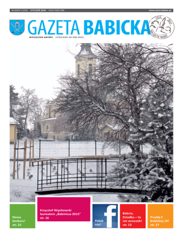 Numer 1 (233) styczEŃ 2016 ISSN 1428-1198 www.stare-babice.pl Miesięcznik Gminny istniejemy od 1990 roku Nowy konkurs! str. 23 Krzysztof Wąsikowski laureatem „Babinicza 2015” str. 16 Polub nas! Babciu, Dziadku – to nie wnuczek! str. 13 Przybij 5 Babickiej 10! str. 27 ↓ w numerze na okładce fot. Piotr Kabała gmina, urząd, teren 2016 i kolejne lata – o planach budżetowych i nie tylko 7 Gmina Stare Babice czuje luz Z Sesji Rady Gminy 8 Nowa szkoła – nowe inicjatywy Szanowni mieszkańcy gminy! 9 Wspomnienie o Adolfie Jarkowcu „Nie umiera ten, kto trwa w sercach i pamięci naszej” Odchodzący sołtysi docenieni 10 „Było nas mało, ale załoga żyła jak w rodzinie” 11 Nowym autobusem szybciej do szkoły Pierwszy miliard? Jesteśmy blisko… 12 Spotkanie w sprawie nowej inwestycji gazowej skarbu państwa 3 bezpieczna gmina 13 Babicka Komenda Policji otrzymała nowe radiowozy BABCIU, DZIADKU – to nie wnuczek, to nie policjant! KULTURA 14 Ikony w gimnazjum 15 „Jasełka” tradycyjnie w przedszkolu w Starych Babicach Świątecznie i ekologicznie 16 Gala wręczania „Babickich Oscarów” już za nami! 18 Noworoczne spotkanie seniorów 2016 19 Zagraliśmy w Starych Babicach razem z Wielką Orkiestrą Świątecznej Pomocy! Żyj kolorowo, czyli rodzinne kolędowanie w Bliznem dla mieszkańca 20 Zatrzymać młodość 22Fizjoterapia 23 Krzyżówka babicka Nr 9 Konkurs dla spostrzegawczych 24 Co i gdzie? Prezentujemy gminny niezbędnik 2016 25 Rozgrzewający imbir idealny na zimę sport 26 Piotr Paziński leci do Rio! 27 Nowa impreza biegowa w Starych Babicach! Kibicuj z nami! 28 II Młodzieżowe Mistrzostwa Polski w Carrom Otwarte Mistrzostwa Łodzi Karate WKF Medale dla babickich karateków informacje 29 Ogłoszenia gminne i inne redakcja adres redakcji: 05-082 Stare Babice, ul. Rynek 32, tel.: 22 730 80 30, 798 944 982, 798 944 953 [email protected] wydawca: Urząd Gminy Stare Babice, ul. Rynek 32 , 05-082 Stare Babice zespół redakcyjny: Jolanta Pieńkowska, Malwina Fabianowicz, Piotr Kabała projekt graficzny: woznkt.com skład i druk: OMIKRON Sp. z o.o. reklama: [email protected] www.omikron.net.pl Redakcja nie zwraca materiałów, nie odpowiada za treść reklam i ogłoszeń. Redakcja zastrzega sobie prawo do dokonywania skrótów i redagowania tekstów. 2 aktualności Kibicujemy Biegaczom I Dziesiątki Babickiej Bieg na dystansie 10 km wystartuje w sobotę 9 kwietnia br. o godzinie 10:00. Start i meta biegu zlokalizowane są na rynku w Starych Babicach, a trasa przebiega przez trzy miejscowości: Stare Babice, Lipków i Zielonki Parcela, ulicami Sienkiewicza, Mościckiego, Paschalisa Jakubowicza, Sportową i Białej Góry. Szczegółowe informacje na str. 27 Bezpieczne Gospodarstwo Rolne XIV edycja Ogólnokrajowego Konkursu Bezpieczne Gospodarstwo Rolne ma na celu promocję zasad ochrony zdrowia i życia w gospodarstwach rolnych. Organizatorami konkursu są: Ministerstwo Rolnictwa i Rozwoju Wsi, Kasa Rolniczego Ubezpieczenia Społecznego, Państwowa Inspekcja Pracy, inne instytucje, organizacje i instytuty naukowo-badawcze działające na rzecz poprawy bezpieczeństwa pracy w gospodarstwach rolnych oraz producenci maszyn i urządzeń rolniczych (po zadeklarowaniu udziału w organizacji Konkursu). W konkursie mogą brać udział osoby pełnoletnie prowadzące produkcyjną działalność rolniczą, ubezpieczone w KRUS. Rolnicy zainteresowani udziałem w Konkursie powinni wypełnić formularz zgłoszeniowy dostępny w placówkach terenowych Kasy oraz na stronie internetowej www.krus.gov.pl. Wypełniony i podpisany formularz należy złożyć do najbliższej Placówki Terenowej KRUS Błonie, ul. Targowa 3 B, w nieprzekraczalnym terminie do 31 marca 2016 r. Ferie blisko. Weekendowe połączenia kolejowe Spółka „Koleje Mazowieckie – KM” uruchomiła weekendowe połączenia Warszawy z Trójmiastem – pociąg „Słoneczny” oraz z Krakowem – pociąg „Dragon”. Pociągi te kursują w soboty i niedziele do 12 marca 2016 r. na trasach Warszawa Zachodnia – Gdynia Główna – Warszawa Zachodnia oraz Warszawa Wschodnia – Kraków Główny – Warszawa Wschodnia. Szczegółowy rozkład jazdy dostępny jest na stronie www.mazowieckie.com.pl. „Słoneczny” oraz „Dragon” składają się z nowoczesnych wagonów piętrowych i lokomotywy Traxx wyprodukowanych przez firmę Bombardier. Ich prędkość maksymalna to 160 km/h. Pomoc dla bezdomnych Mazowiecki Urząd Wojewódzki w Warszawie informuje, że dzwoniąc na bezpłatną infolinię 987 można uzyskać informacje dotyczące pomocy dla bezdomnych. Pracownicy centrum zarządzania kryzysowego udzielają informacji na temat możliwych form wsparcia – wskazują najbliższe schroniska, jadłodajnie, czy punkty pomocy medycznej. Testy HIV dla seniorów bezpłatnie i anonimowo w punktach konsultacyjno-diagnostycznych • Wojewódzka Stacja Sanitarno-Epidemiologiczna: ul. Nowogrodzka 82 wejście B (II piętro), pon. – pt. 16–20, ul. Żelazna 79, pon. – pt. 16–19 • Laboratorium Analiz Lekarskich IZIS: ul. Chmielna 4, tel. (22) 826 81 62, pon. – czw. 15–19, pt. 10–16 • Specjalistyczna Przychodnia Internistyczna: ul. Jagiellońska 34 (pok. 103 i 105, I piętro) pon. i czw. 15.30–19 • Poradnia Profilaktyczno-Lecznicza dla osób żyjących z HIV/AIDS: ul. Wolska 37, tel. (22) 33 58 101, 33 58 102, pon. – wt. 10–14 • Oddział Obserwacyjno-Zakaźny Wojewódzkiego Szpitala Zespolonego w Płocku: ul. Medyczna 19, (24) 364 64 04, czw. 15–18 Zrób badanie min. po 6 tygodniach od potencjalnego zakażenia. Badanie polega na pobraniu próbki krwi. Nie trzeba być na czczo. Każdy wynik testu należy skonsultować ze specjalistą. Telefon zaufania HIV/AIDS: 22 692 82 26, 0 801 888 448, pon. – pt. 9–21 Więcej na www.aids.gov.pl Chcesz być na bieżąco? Zapisz się do gminnego newslettera! Możesz to zrobić na stronie www.stare-babice.pl lub w Urzędzie Gminy Stare Babice w Referacie Rozwoj