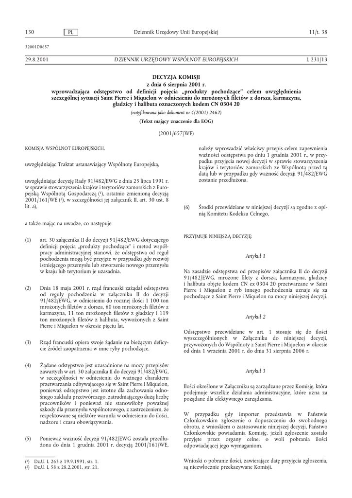130 PL Dziennik Urzędowy Unii Europejskiej 11/t. 38 DZIENNIK URZĘDOWY WSPÓLNOT EUROPEJSKICH L 231/13 32001D0657 29.8.2001 DECYZJA KOMISJI z dnia 6 sierpnia 2001 r. wprowadzająca odstępstwo od definicji pojęcia „produkty pochodzące” celem uwzględnienia szczególnej sytuacji Saint Pierre i Miquelon w odniesieniu do mrożonych filetów z dorsza, karmazyna, gładzicy i halibuta oznaczonych kodem CN 0304 20 (notyfikowana jako dokument nr C(2001) 2462) (Tekst mający znaczenie dla EOG) (2001/657/WE) należy wprowadzić właściwy przepis celem zapewnienia ważności odstępstwa po dniu 1 grudnia 2001 r., w przypadku przyjęcia nowej decyzji w sprawie stowarzyszenia krajów i terytoriów zamorskich ze Wspólnotą przed tą datą lub w przypadku gdy ważność decyzji 91/482/EWG zostanie przedłużona. KOMISJA WSPÓLNOT EUROPEJSKICH, uwzględniając Traktat ustanawiający Wspólnotę Europejską, uwzględniając decyzję Rady 91/482/EWG z dnia 25 lipca 1991 r. w sprawie stowarzyszenia krajów i terytoriów zamorskich z Europejską Wspólnotą Gospodarczą (1), ostatnio zmienioną decyzją 2001/161/WE (2), w szczególności jej załącznik II, art. 30 ust. 8 lit. a), (6) Środki przewidziane w niniejszej decyzji są zgodne z opinią Komitetu Kodeksu Celnego, a także mając na uwadze, co następuje: (1) (2) art. 30 załącznika II do decyzji 91/482/EWG dotyczącego definicji pojęcia „produkty pochodzące” i metod współpracy administracyjnej stanowi, że odstępstwa od reguł pochodzenia mogą być przyjęte w przypadku gdy rozwój istniejącego przemysłu lub stworzenie nowego przemysłu w kraju lub terytorium je uzasadnia. Dnia 18 maja 2001 r. rząd francuski zażądał odstępstwa od reguły pochodzenia w załączniku II do decyzji 91/482/EWG, w odniesieniu do rocznej ilości 1 100 ton mrożonych filetów z dorsza, 60 ton mrożonych filetów z karmazyna, 11 ton mrożonych filetów z gładzicy i 119 ton mrożonych filetów z halibuta, wywożonych z Saint Pierre i Miquelon w okresie pięciu lat. (3) Rząd francuski opiera swoje żądanie na bieżącym deficycie źródeł zaopatrzenia w inne ryby pochodzące. (4) Żądane odstępstwo jest uzasadnione na mocy przepisów zawartych w art. 30 załącznika II do decyzji 91/482/EWG, w szczególności w odniesieniu do ważnego charakteru przetwarzania odbywającego się w Saint Pierre i Miquelon, ponieważ odstępstwo jest istotne dla zachowania odnośnego zakładu przetwórczego, zatrudniającego dużą liczbę pracowników i ponieważ nie stanowiłoby poważnej szkody dla przemysłu wspólnotowego, z zastrzeżeniem, że respektowane są niektóre warunki w odniesieniu do ilości, nadzoru i czasu obowiązywania. (5) Ponieważ ważność decyzji 91/482/EWG została przedłużona do dnia 1 grudnia 2001 r. decyzją 2001/161/WE, (1) Dz.U. L 263 z 19.9.1991, str. 1. (2) Dz.U. L 58 z 28.2.2001, str. 21. PRZYJMUJE NINIEJSZĄ DECYZJĘ: Artykuł 1 Na zasadzie odstępstwa od przepisów załącznika II do decyzji 91/482/EWG, mrożone filety z dorsza, karmazyna, gładzicy i halibuta objęte kodem CN ex 0304 20 przetwarzane w Saint Pierre i Miquelon z ryb innego pochodzenia uznaje się za pochodzące z Saint Pierre i Miquelon na mocy niniejszej decyzji. Artykuł 2 Odstępstwo przewidziane w art. 1 stosuje się do ilości wyszczególnionych w Załączniku do niniejszej decyzji, przywożonych do Wspólnoty z Saint Pierre i Miquelon w okresie od dnia 1 września 2001 r. do dnia 31 sierpnia 2006 r. Artykuł 3 Ilości określone w Załączniku są zarządzane przez Komisję, która podejmuje wszelkie działania administracyjne, które uzna za pożądane dla efektywnego zarządzania. W przypadku gdy importer przedstawia w Państwie Członkowskim zgłoszenie o dopuszczeniu do swobodnego obrotu, z wnioskiem o zastosowanie niniejszej decyzji, Państwo Członkowskie powiadamia Komisję, jeżeli zgłoszenie zostało przyjęte przez organy celne, o woli pobrania ilości odpowiadającej jego wymaganiom. Wnioski o pobranie ilości, zawierające datę przyjęcia zgłoszenia, są niezwłocznie przekazywane Komisji. 11/t. 38 Dziennik Urzędowy Unii Europejskiej PL Ilości do pobrania są przyznawane przez Komisję według daty przyjmowania zgłoszeń o dopuszczeniu do swobodnego obrotu przez organy celne Państw Członkowskich, pod warunkiem że pozwala na to bieżący bilans. 131 — Excepción — Decisión no … — Undtagelse — afgørelse nr. … — Abweichung — Beschluss Nr … Jeżeli Państwo Członkowskie nie wykorzysta ilości do pobrania, zwraca je jak najszybciej do odpowiedniego kontyngentu. Jeżeli żądania przekroczą dostępny bilans danych kontyngentów, ilości są rozdzielane proporcjonalnie. Komisja informuje Państwa Członkowskie o wycofaniu kontyngentów. — Παρέκκλιση — Απόφαση αριθ. … — Derogation — Decision No … — Dérogation — Décision no … — Deroga — decisione n. … — Afwijking — Besluit nr. … Każde Państwo Członkowskie zapewnia importerom ciągły i równy dostęp do dostępnych ilości, tak długo jak pozwala na to saldo ilości kontyngentu. — Derrogação — Decisão n.o … — Poikkeus — Päätös N:o … — Undantag — beslut nr. … wskazujące numer niniejszej decyzji. Artykuł 4 Artykuł 6 Organy celne Saint Pierre i Miquelon stosują odpowiednie środki w celu przeprowadzenia ilościowych kontroli wywozu produktów określonych w art. 1. W tym celu wszystkie świadectwa, które są przez nie wydawane na mocy niniejszej decyzji, zawierają odniesienie do niej. Właściwe organy Saint Pierre i Miquelon przesyłają co trzy miesiące do Komisji deklarację ilości, w odniesieniu do których są wydawane świadectwa przewozowe EUR1 na mocy niniejszej decyzji, oraz numery seryjne tych świadectw. Niniejszą decyzję stosuje się od dnia 1 września do dnia 30 listopada 2001 r. Jednakże jeśli po tej dacie przyjęty będzie nowy system preferencji zastępujący decyz