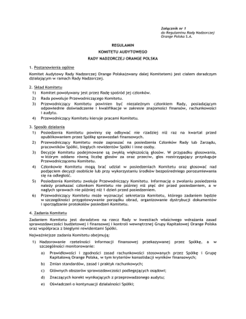 Załącznik nr 1 do Regulaminu Rady Nadzorczej Orange Polska S.A. REGULAMIN KOMITETU AUDYTOWEGO RADY NADZORCZEJ ORANGE POLSKA 1. Postanowienia ogólne Komitet Audytowy Rady Nadzorczej Orange Polska(zwany dalej Komitetem) jest ciałem doradczym działającym w ramach Rady Nadzorczej. 2. Skład Komitetu 1) Komitet powoływany jest przez Radę spośród jej członków. 2) Rada powołuje Przewodniczącego Komitetu. 3) Przewodniczący Komitetu powinien być niezależnym członkiem Rady, posiadającym odpowiednie doświadczenie i kwalifikacje w zakresie znajomości finansów, rachunkowości i audytu. 4) Przewodniczący Komitetu kieruje pracami Komitetu. 3. Sposób działania 1) Posiedzenia Komitetu powinny się odbywać nie rzadziej niż raz na kwartał przed opublikowaniem przez Spółkę sprawozdań finansowych. 2) Przewodniczący Komitetu może zapraszać na posiedzenia Członków Rady lub Zarządu, pracowników Spółki, biegłych rewidentów Spółki i inne osoby. 3) Decyzje Komitetu podejmowane są zwykłą większością głosów. W przypadku głosowania, w którym oddano równą liczbę głosów za oraz przeciw, głos rozstrzygający przysługuje Przewodniczącemu Komitetu. 4) Członkowie Komitetu mogą brać udział w posiedzeniach Komitetu oraz głosować nad podjęciem decyzji osobiście lub przy wykorzystaniu środków bezpośredniego porozumiewania się na odległość. 5) Posiedzenia Komitetu zwołuje Przewodniczący Komitetu. Informację o zwołaniu posiedzenia należy przekazać członkom Komitetu nie później niż pięć dni przed posiedzeniem, a w nagłych sprawach nie później niż 1 dzień przed posiedzeniem. 6) Przewodniczący Komitetu może wyznaczyć sekretarza Komitetu, którego zadaniem będzie w szczególności przygotowywanie porządku obrad, organizowanie dystrybucji dokumentów i sporządzanie protokołów posiedzeń Komitetu. 4. Zadania Komitetu Zadaniem Komitetu jest doradztwo na rzecz Rady w kwestiach właściwego wdrażania zasad sprawozdawczości budżetowej i finansowej i kontroli wewnętrznej Grupy Kapitałowej Orange Polska oraz współpraca z biegłymi rewidentami Spółki. Najważniejsze zadania Komitetu obejmują: 1) Nadzorowanie rzetelności informacji szczególności monitorowanie: finansowej przekazywanej przez Spółkę, a w a) Prawidłowości i zgodności zasad rachunkowości stosowanych przez Spółkę i Grupę Kapitałową Orange Polska, w tym kryteriów konsolidacji wyników finansowych; b) Zmian standardów, zasad i praktyk rachunkowych; c) Głównych obszarów sprawozdawczości podlegających osądowi; d) Znaczących korekt wynikających z przeprowadzonego audytu; e) Oświadczeń o kontynuacji działalności Spółki; f) Zgodności z obowiązującymi przepisami o rachunkowości; 2) Przegląd, co najmniej raz w roku, systemu kontroli wewnętrznej i zarządzania ryzykiem Grupy Kapitałowej Orange Polska w celu dokonania oceny, w możliwym zakresie, czy najważniejsze ryzyka (w tym związane ze zgodnością z obowiązującymi przepisami i regulacjami) są prawidłowo identyfikowane, zarządzane i prezentowane; 3) Coroczny przegląd programu prac Audytu Wewnętrznego, w tym przegląd niezależności funkcji Audytu Wewnętrznego, jego budżetu, jak również koordynację prac pomiędzy audytorami wewnętrznymi i biegłymi rewidentami; 4) Analizę raportów audytorów wewnętrznych Spółki i głównych wniosków z innych badań wewnętrznych, jak również odpowiedzi Zarządu na zgłoszone rekomendacje; 5) Przedstawianie rekomendacji dotyczących zatrudnienia, rozwiązania umowy o pracę, oceny oraz wynagradzania dyrektora Audytu Wewnętrznego; 6) Analizę i opiniowanie dla Zarządu i / lub do Rady (zgodnie ze wskazaniem) istotnych transakcji z podmiotami powiązanymi, zgodnie z wewnętrznymi regulacjami; 7) Monitorowanie pracy biegłych rewidentów Spółki pod kątem niezależności i obiektywności i przedstawianie Radzie rekomendacji, co do wyboru i wynagrodzenia biegłych rewidentów Spółki, ze szczególnym uwzględnieniem wynagrodzenia za dodatkowe usługi; 8) Analizę przyczyn rezygnacji biegłego rewidenta; 9) Omawianie z biegłymi rewidentami Spółki, przed rozpoczęciem każdego badania rocznego sprawozdania finansowego, charakteru i zakresu badania oraz monitorowanie prac biegłych rewidentów Spółki; 10) Omawianie (z udziałem lub bez udziału Zarządu Spółki) wszelkich problemów lub zastrzeżeń zidentyfikowanych przez biegłego rewidenta podczas badania sprawozdań finansowych; 11) Analizę skuteczności procesu badania sprawozdania finansowego przez biegłego rewidenta oraz odpowiedzi Zarządu na sformułowane zalecenia; 12) Rozpatrywanie wszelkich innych kwestii, na które zwrócił uwagę Komitet lub Rada; 13) Regularne informowanie Rady o wszelkich znaczących kwestiach leżących w zakresie działalności Komitetu; 14) Przedstawienie Radzie rocznego sprawozdania z działalności Komitetu Audytowego i wyników tej działalności. 5. Uprawnienia Komitetu 1) Komitet jest uprawniony do: a) badania wszelkiej działalności Spółki istotnej z punktu widzenia zadań Komitetu; b) żądania od Zarządu i pracowników Spółki wszelkich informacji, sprawozdań i wyjaśnień, przeglądania ksiąg i dokumentów oraz bezpośredniego sprawdzania stanu majątkowego Spółki oraz kontrolowania działalności zakładów; c) żądania od Zarządu Spółki, w razie potrzeby, zlecenia ekspertom opracowania ekspertyz lub opinii. 2) Pracownicy Spółki są zobowiązani do podjęcia współpracy z Komitetem w zakresie niezbędnym do realizacji jego zadań.