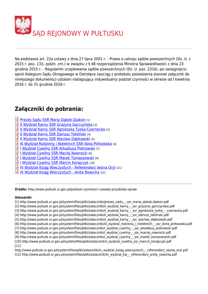 SĄD REJONOWY W PUŁTUSKU Na podstawie art. 22a ustawy z dnia 27 lipca 2001 r. - Prawo o ustroju sądów powszechnych (Dz. U. z 2015 r. poz. 133, zpóźn. zrn.) w związku z § 48 rozporządzenia Ministra Sprawiedliwości z dnia 23 grudnia 2015 r. - Regulamin urzędowania sądów powszechnych (Dz. U. poz. 2316), po zasięgnięciu opinii Kolegium Sądu Okręgowego w Ostrołęce (wyciąg z protokołu posiedzenia stanowi załącznik do niniejszego dokumentu) ustalam następujący indywidualny podział czynności w okresie od I kwietnia 2016 r. do 31 grudnia 2016 r. Załączniki do pobrania: Prezes Sądu SSR Maria Dąbek-Djakon [1] II Wydział Karny SSR Grażyna Gorczyńska [2] II Wydział Karny SSR Agnieszka Tyska-Czarnecka [3] II Wydział Karny SSR Dariusz Tekliński [4] II Wydział Karny SSR Wacław Dąbkowski [5] III Wydział Rodzinny i Nieletnich SSR Ilona Pińkowska [6] I Wydział Cywilny SSR Arkadiusz Piotrowski [7] I Wydział Cywilny SSR Maciej Nawrocki [8] I Wydział Cywilny SSR Marek Tomaszewski [9] I Wydział Cywilny SSR Marcin Korajczyk [10] IV Wydział Ksiąg Wieczystych - Referendarz Iwona Oryl [11] IV Wydział Ksiąg Wieczystych - Anita Nowicka [12] Źródło: http://www.pultusk.sr.gov.pl/podzial-czynnosci-i-zasady-przydzialu-spraw Odnośniki [1] http://www.pultusk.sr.gov.pl/system/files/pliki/zalaczniki/prezes_sadu_-_ssr_maria_dabek-djakon.pdf [2] http://www.pultusk.sr.gov.pl/system/files/pliki/zalaczniki/ii_wydzial_karny_-_ssr_grazyna_gorczynska.pdf [3] http://www.pultusk.sr.gov.pl/system/files/pliki/zalaczniki/ii_wydzial_karny_-_ssr_agnieszka_tyska_-_czarnecka.pdf [4] http://www.pultusk.sr.gov.pl/system/files/pliki/zalaczniki/ii_wydzial_karny_-_ssr_dariusz_teklinski.pdf [5] http://www.pultusk.sr.gov.pl/system/files/pliki/zalaczniki/ii_wydzial_karny_-_ssr_waclaw_dabkowski.pdf [6] http://www.pultusk.sr.gov.pl/system/files/pliki/zalaczniki/iii_wydzial_rodzinny_i_nieletnich_-_ssr_ilona_pinkowska.pdf [7] http://www.pultusk.sr.gov.pl/system/files/pliki/zalaczniki/i_wydzial_cywilny_-_ssr_arkadiusz_piotrowski.pdf [8] http://www.pultusk.sr.gov.pl/system/files/pliki/zalaczniki/i_wydzial_cywilny_-_ssr_maciej_nawrocki.pdf [9] http://www.pultusk.sr.gov.pl/system/files/pliki/zalaczniki/i_wydzial_cywilny_-_ssr_marek_tomaszewski.pdf [10] http://www.pultusk.sr.gov.pl/system/files/pliki/zalaczniki/i_wydzial_cywilny_ssr_marcin_korajczyk.pdf [11] http://www.pultusk.sr.gov.pl/system/files/pliki/zalaczniki/iv_wydzial_ksiag_wieczystych_-_referendarz_iwona_oryl.pdf [12] http://www.pultusk.sr.gov.pl/system/files/pliki/zalaczniki/iv_wydzial_kw_-_referendarz_anita_nowicka.pdf