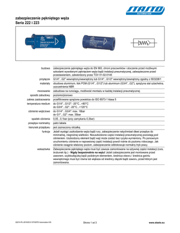 zabezpieczenie pękniętego węża Seria 222 i 223 budowa zabezpieczenie pękniętego węża do EN 983, chroni pracowników i otoczenie przed możliwymi szkodami wywołanymi pęknięciem węża bądź instalacji pneumatycznej, zabezpieczone przed przestawieniem, zatwierdzony przez TÜV 01-02-0145 przyłącze G1/4"...G2" wewnętrzny/wewnętrzny lub G1/4"...G1/2" wewnętrzny/zewnętrzny zgodny z ISO228/1 materiały obudowa aluminium, tłok POM (G1/4"...G1/2") lub aluminium (G3/4"...G2"), sprężyna stal szlachetna, uszczelnienia NBR mocowanie sposób zabudowy zabudowa na rurociągu, możliwość montażu w każdej instalacji pneumatycznej poziomo/pionowo zakres zastosowania przefiltrowane sprężone powietrze do ISO 8573-1 klasa 5 temperatura medium do G1/4"...G1/2": -20°C...+80°C do G3/4"...G2": -20°C...+120°C ciśnienie wejściowe spadek ciśnienia do G1/4"...G3/4": max. 18bar do G1"...G2": max. 35bar 0,05...0,1bar (przy zamykaniu 0,3bar) przepływ nominalny patrz tabela kierunek przepływu jest zaznaczony strzałką funkcja wskazówka 22214-PL-2016/02 © STASTO Automation KG Jeżeli wystąpi uszkodzenie węża bądź rury, zabezpieczenie natychmiast dławi przepływ do minimalnej, niegroźnej wielkości. Nieuszkodzone części instalacji pneumatycznej pozostają pod ciśnieniem. Uszkodzony element bądź wąż może zostać bez ryzyka wymieniony. Po ponownym uruchomieniu ciśnienie w naprawionej część instalacji powoli rośnie do poziomu roboczego. Jak ciśnienie osiągnie właściwy poziom, zabezpieczenie odblokowuje normalny tryb pracy. Zabezpieczenie pękniętego węża musi być zawsze zamontowane na sztywnej części instalacji (rura, śrubunek itp.) - Nigdy bezpośrednio na wężu! Jeżeli zabezpieczenie jest montowane przed zaworem, szybkozłączką bądź podobnym elementem, średnica otworu / średnica gwintu wewnętrznego musi być równa lub większa od średnicy złączki bądź zaworu, przed którym jest zamontowana. Strona 1 od 3 www.stasto.eu wymiary G1/4"..G1/2" wewnętrzny/zewnętrzny przyłącze G1/4"...G1/2" wewnętrzny/wewnętrzny przepływ nominalny średnica węża długość zabudowy zakres ciśnień [Nl/min] wew. [mm] A B ØC SW [bar] [mm] 0...20m* 0...10m* 10...20m* G3/4"...G2" wewnętrzny/wewnętrzny typ przyłącza 1/4" 58 49 - 22 0...18 480 7 8 wewnętrzny/zewnętrzny 3/8" 71 59 - 27 0...18 1100 10 12 1/2" 80 65 - 30 0...18 2000 12 14 1/4" 48 - - 22 0...18 480 7 3/8" 59 - - 27 0...18 1100 1/2" 65 - - 30 0...18 3/4" 76 - 36 30 0...18 1" 100 - 50 41 2" 130 - 80 70 max. przepływ ciężar przy 8bar [g] 3 [Nm /h] typ 42 36 222.14 wewnętrzny/zewnętrzny 66 62 222.38 wewnętrzny/zewnętrzny 156 85 222.12 8 wewnętrzny/wewnętrzny 42 30 223.14 10 12 wewnętrzny/wewnętrzny 66 58 223.38 2000 12 14 wewnętrzny/wewnętrzny 156 78 223.12 3800 18 20 wewnętrzny/wewnętrzny 252 107 223.34 0...35 6500 24 26 wewnętrzny/wewnętrzny 420 300 222.10 0...35 16000 45 50 wewnętrzny/wewnętrzny 1200 775 222.20 * długość węża wymiarowanie uwzględniające długość węża i średnica węża L...długość węża Q...przepływ przy 7bar DI...średnica węża wew. [mm] wybór optymalnej wielkości zabezpieczenia pękniętego węża 1 Zdefiniować średnicę wewnętrzną węża bądź rury (patrz dane średnica wewnętrzna węża w mm w niebieskim oknie, niebieska ukośna linia). 2 Określić długość węża bądź rury (długość węża w m). 3 Znaleźć punkt przecięcia między a i b oraz poprowadzić pionową linię na dół (w podanym przykładzie to czerwono/zielony punkt i zielona linia przerywana). 4 Najbliższa pionowa żółta linia leżąca po lewej stronie od wyznaczonego punktu, określa właściwą wielkość zabezpieczenia (w przykładzie zielona przerywana linia). 5 Uwaga: Dla przepływów wyższych od wartości wskazanej przez wyznaczoną wcześniej żółtą pionową linię zabezpieczenie zostanie aktywowane, gdy dojdzie do pęknięcia węża bądź rur. 6 przykład: Jaka wielkość zabezpieczenia powinna zostać użyta do 10 metrowego węża o średnicy wewnętrznej 8mm? Rozwiązanie: Znaleźć punkt przecięcia linii odpowiadającej długości 10m (czerwona) i średnicy 8mm (niebieska) i użyć najbliższej pionowej żółtej linii do odczytania wielkości zabezpieczeni. rezultat: Dla podanego przykładu odpowiednia wielkość zabezpieczenia to G3/8". 22214-PL-2016/02 © STASTO Automation KG Strona 2 od 3 www.stasto.eu Sposób funkcjonowania 1 Powietrze wpływa przez p1. 2 Strumień powietrza omija tłok (1) i przepływa przez gniazdo (3). 3 Prędkość przepływu powietrza jest wyhamowywana przez wyżłobienia znajdujące się na zewnętrznej części tłoka. 4 Przy nadmiernym przepływie powietrze nie może wystarczająco szybko ominąć tłoka i dociska go przeciw sprężynie (2) w kierunku gniazda. 5 Maksymalny przepływ pokazany jest na diagramie "wartości graniczne" 6 Jeżeli strumień przekroczy maksymalną wartość dopływ powietrza zostaje automatycznie blokowany. wartości graniczne (w ujęciu tabelarycznym) do 1/4"...1/2" do 3/4"...2" rysunki poglądowe Zmiany w konstrukcji, wymiarach i wykonaniu materiałowym zastrzeżone 22214-PL-2016/02 © STASTO Automation KG Strona 3 od 3 www.stasto.eu