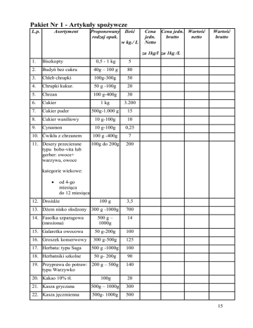 Pakiet Nr 1 - Artykuły spożywcze L.p. Asortyment Proponowany Ilość rodzaj opak. w kg./ L Cena Cena jedn. Wartość jedn. brutto netto Netto Wartość brutto za 1kg/l za 1kg /L 1. Biszkopty 0,5 - 1 kg 5 2. Budyń bez cukru 40g – 100 g 80 3. Chleb chrupki 100g-300g 50 4. Chrupki kukur. 50 g -100g 20 5. Chrzan 100 g-400g 30 6. Cukier 1 kg 3.200 7. Cukier puder 500g-1.000 g 15 8. Cukier waniliowy 10 g-100g 10 9. Cynamon 10 g-100g 0,25 10. Ćwikła z chrzanem 100 g -400g 7 11. Desery przecierane typu bobo-vita lub gerber: owoce+ warzywa, owoce 100g do 200g 200 100 g 3,5 kategorie wiekowe: od 4-go miesiąca do 12 miesiąca 12. Drożdże 13. Dżem nisko słodzony 300 g -1000g 700 14. Fasolka szparagowa (mrożona) 500 g – 1000g 14 15. Galaretka owocowa 50 g-200g 100 16. Groszek konserwowy 300 g-500g 125 17. Herbata: typu Saga 500 g -1000g 100 18. Herbatniki szkolne 50 g- 200g 90 19. Przyprawa do potraw: 200 g – 500g typu Warzywko 140 20. Kakao 10% tł. 100g 20 21. Kasza gryczana 500g – 1000g 300 22. Kasza jęczmienna 500g- 1000g 500 15 L.p. Asortyment Proponowany Ilość rodzaj opak. w kg./ L Cena Cena jedn. Wartość jedn. brutto netto Netto Wartość brutto za 1kg/l za 1kg /L 23. Kasza jęczmienna perłowa 500g-1000g 100 24. Kasza manna 500g-1000g 700 25. Kaszka bezmleczna bezglutenowa 100 g-300g 10 26. Kaszka mleczno ryżowa 100 g- 300g 10 27. Kawa zbożowa Inka 100 g-300g 100 28. Ketchup 500g -1000g 40 29. Kisiel bez cukru 40 g- 100g 120 30. Kleik ryżowy 100g-300g 3 31. Koncentrat pomidorowy 30% 100 g-500g 150 32. Kotlety sojowe 100g-500g 40 33. Kukurydza konserwowa 300 g-500g 60 34. Kwasek cytrynowy 10 g-100g 10 35. Liście laurowe 10 g-100g 8 36. Majeranek 10 g-20g 2 37. Majonez 200-1000g 70 38. Mak 300g-1000g 3 1 kg 1.300 200 g-1000g 1 41. Mąka pszenna 1 kg 1.600 42. Mąka ziemniaczana 1 kg 70 43. Miód nat. Wielokwiatowy 200g-500g 100 44. Miód sztuczny 200g-500g 3 45. Musztarda 100g-500g 30 46. Ocet 0,400 l.-1l 150 300 g-1000g 800 39. Makaron bezjajeczny z pszenicy durum 40. Mąka kukurydziana 47. Papryka konserwowa 16 L.p. Asortyment Proponowany Ilość rodzaj opak. w kg./ L Cena Cena jedn. Wartość jedn. brutto netto Netto Wartość brutto za 1kg/l za 1kg /L 48. Pasztet podlaski z kurczaka ( puszka z samootwieraczem ) 195 g 450 49. Pieprz naturalny 10 g – 100g 5 50. Płatki jęczmienne 500 g- 1000g 400 51. Płatki owsiane 500 g-1000g 250 52. Proszek do pieczenia 10 g-100g 3 53. Przecier ogórkowy 200 g-500g 30 54. Przecier szczawiowy siekany 200 g- 500g 80 55. Przyprawa do ryb 10g-100g 0,3 56. Rodzynki 50 g-300g 2 57. Ryż 0,5kg -1 kg 1.100 58. Ryż brązowy 500g-1000g 40 59. Ryż błyskawiczny 200 g-1000g 10 60. Smalec 200 g-500g 20 61. Sok bobo – frut 62. Sól 100 ml.300ml 150L. 1 kg 1.300 100 g-500g 2 64. Susz grzybowy 10 g-50g 1 65. Susz owocowy 100g-100g 4 63. Suchary 66. Syrop owocowy 100g-1000g 800 67. Wafle ryżowe 50g-300g 60 68. Wiórki kokosowe 50 g-200g 1 69. Zapachy do ciast 70. Ziele angielskie 30 szt. 10 g-100g 71. Zupki przecierane z 100 g -200g uwzględnieniem zup z dodatkiem mięsa i zup bez mięsa, bezmleczna bezglutenowa typ bobovita lub gerber 1 100 17 L.p. Asortyment Proponowany Ilość rodzaj opak. w kg./ L Cena Cena jedn. Wartość jedn. brutto netto Netto Wartość brutto za 1kg/l za 1kg /L :katergorie wiekowe od 4 –go miesiąca do 12 –go miesiąca 72. Żelatyna 50 g-250g 12 Wyroby zawarte w Pak Nr 1 nie mogą mieć śladów pleśni, obcych zapachów, zanieczyszczeń organicznych i nieorganicznych, opakowania zbiorcze jednostkowe nie mogą być uszkodzone i zawilgocone. Wyroby zawarte w pakiecie Nr 1 muszą posiadać przydatność do spożycia nie krótszą niż 4 tygodnie w dniu dostawy do magazynu szpitalnego. Wartość ogółem netto ............................. brutto ............................ Pieczątka i podpis Wykonawcy. ................................................. 18 Pakiet Nr2 Zatwierdzam L/p Asortyment Rodzaj J/m opako wania Ilość 1. Chleb zwykły, krojony 1kg kg 12.000 2. Bułka wrocławska 0,4 kg. ( krojona) 0,4 kg kg 8.000 3. Chleb razowy( krojony ) 0,5kg kg. 2.000 4. Bułka tarta 0,5kg kg. 150 Cena jedn netto za 1kg Cena jedn brutto za 1kg Wartość netto Pak Nr 2 wyroby piekarnicze pszenne, żytnie i mieszane powinny mieć następujące cechy jakościowe: - świeże wyprodukowane w wciągu 12 godzin od momentu dostarczenia do magazyny Zamawiającego, foremny kształt( nierozlany, niezgnieciony, nieporozrywany), skórkę nie oddzielającą się od miękiszu, niezabrudzoną, niespaloną miękisz suchy, o wyraźnie właściwej porowatości, bez zakalca, bez zanieczyszczeń oraz obecności grudek mąki lub soli, - miękisz o właściwym smaku ( niegorzki, niezbyt kwaśnym, zbyt słonym lub niesłonym). Wyroby te powinny być bez uszkodzeń mechanicznych, bez śladów pleśni i obcych zapachów. - Zamawiający zastrzega sobie możliwość w pojedynczych przypadkach dwukrotnych dostaw w ciągu jednego dnia, druga dostaw w ciągu sześciu godzin od złożonego zamówienia, jednak nie później niż godz. 1600Towar ma być dostarczany transportem przystosowanym do przewozu pieczywa. Wykonawca zobowiązany jest nieodpłatnie wymienić dwa razy w tygodniu ( poniedziałek, czwartek) czerstwe pieczywo na świeże. Wartość ogółem netto …………… brutto…………… 19 Wartość brutto Zatwierdzam ...................................... Pakiet Nr 3. - Warzywa i owoce L.p. Nazwa artykułu 1.Arbuz 2.Banany 3.Botwina 4.Brokuły 5.Buraki ćwikłowe 6.Cebula 7.Cykoria 8.Czereśnie 9.Fasola 10.Fasola szparagowa 11.Jabłka 150g do 200g 12.Kalafior bez liści 13.Kapusta biała 14.Kapusta czerwona 15.Kapusta kiszona 16.Kapusta pekińska 17.Koper susz 18.Koper 19.Mandarynki 20.Marchew 21.Ogórek kiszony 22.Ogórek małosolny 23.Ogórek świeży 24.Papryka 25.Pieczarka 26.Pietruszka susz 27.Pietruszka korzeń 28.Pietruszka zielona 29.Pomarańcze 30.Pomidor 31.Pory 32.Rzodkiewka 33.Sałata masłowa 34.Seler młody 35.Selery ko