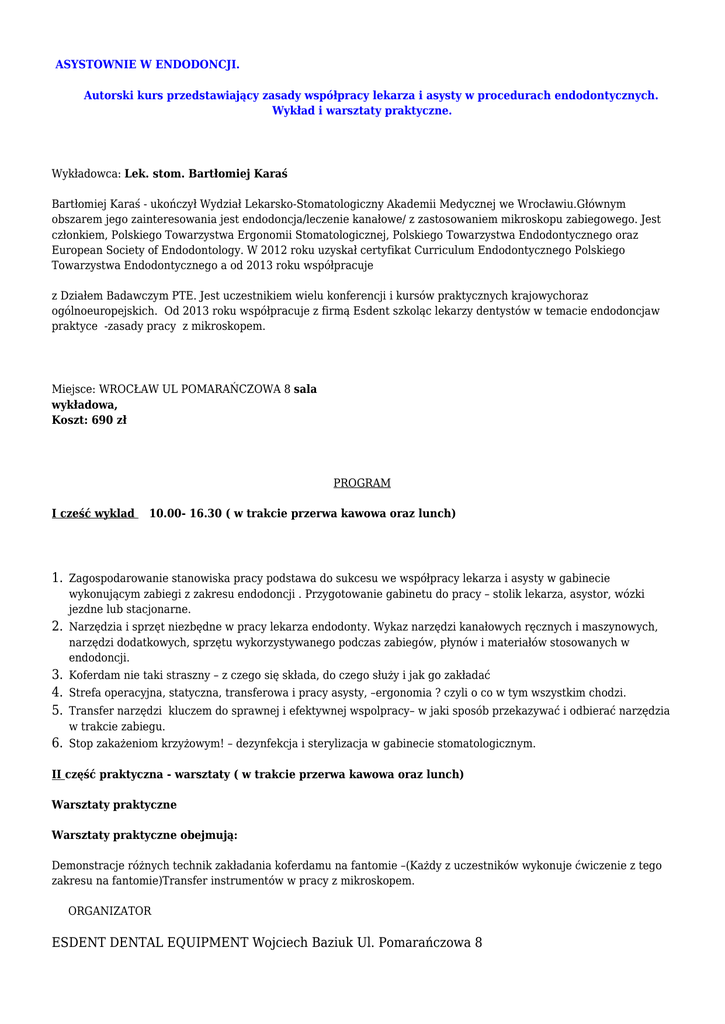 ASYSTOWNIE W ENDODONCJI. Autorski kurs przedstawiający zasady współpracy lekarza i asysty w procedurach endodontycznych. Wykład i warsztaty praktyczne. Wykładowca: Lek. stom. Bartłomiej Karaś Bartłomiej Karaś - ukończył Wydział Lekarsko-Stomatologiczny Akademii Medycznej we Wrocławiu.Głównym obszarem jego zainteresowania jest endodoncja/leczenie kanałowe/ z zastosowaniem mikroskopu zabiegowego. Jest członkiem, Polskiego Towarzystwa Ergonomii Stomatologicznej, Polskiego Towarzystwa Endodontycznego oraz European Society of Endodontology. W 2012 roku uzyskał certyfikat Curriculum Endodontycznego Polskiego Towarzystwa Endodontycznego a od 2013 roku współpracuje z Działem Badawczym PTE. Jest uczestnikiem wielu konferencji i kursów praktycznych krajowychoraz ogólnoeuropejskich. Od 2013 roku współpracuje z firmą Esdent szkoląc lekarzy dentystów w temacie endodoncjaw praktyce -zasady pracy z mikroskopem. Miejsce: WROCŁAW UL POMARAŃCZOWA 8 sala wykładowa, Koszt: 690 zł PROGRAM I cześć wyklad 10.00- 16.30 ( w trakcie przerwa kawowa oraz lunch) 1. Zagospodarowanie stanowiska pracy podstawa do sukcesu we współpracy lekarza i asysty w gabinecie wykonującym zabiegi z zakresu endodoncji . Przygotowanie gabinetu do pracy – stolik lekarza, asystor, wózki jezdne lub stacjonarne. 2. Narzędzia i sprzęt niezbędne w pracy lekarza endodonty. Wykaz narzędzi kanałowych ręcznych i maszynowych, narzędzi dodatkowych, sprzętu wykorzystywanego podczas zabiegów, płynów i materiałów stosowanych w endodoncji. 3. Koferdam nie taki straszny – z czego się składa, do czego służy i jak go zakładać 4. Strefa operacyjna, statyczna, transferowa i pracy asysty, –ergonomia ? czyli o co w tym wszystkim chodzi. 5. Transfer narzędzi kluczem do sprawnej i efektywnej wspolpracy– w jaki sposób przekazywać i odbierać narzędzia w trakcie zabiegu. 6. Stop zakażeniom krzyżowym! – dezynfekcja i sterylizacja w gabinecie stomatologicznym. II część praktyczna - warsztaty ( w trakcie przerwa kawowa oraz lunch) Warsztaty praktyczne Warsztaty praktyczne obejmują: Demonstracje różnych technik zakładania koferdamu na fantomie –(Każdy z uczestników wykonuje ćwiczenie z tego zakresu na fantomie)Transfer instrumentów w pracy z mikroskopem. ORGANIZATOR ESDENT DENTAL EQUIPMENT Wojciech Baziuk Ul. Pomarańczowa 8 54-058 Wrocław NIP 899-112-27-53 Regon 930593840 Nr konta W celu rezerwacji miejsca proszę o wpłatę rezerwacyjna na konto: ING BANK ŚLĄSKI S.A. 27 1050 1575 1000 0022 5454 2323 nazwa konta: Esdent Dental Equipment, Wrocław A pozostała kwotę na 1 tydzień przed kursem