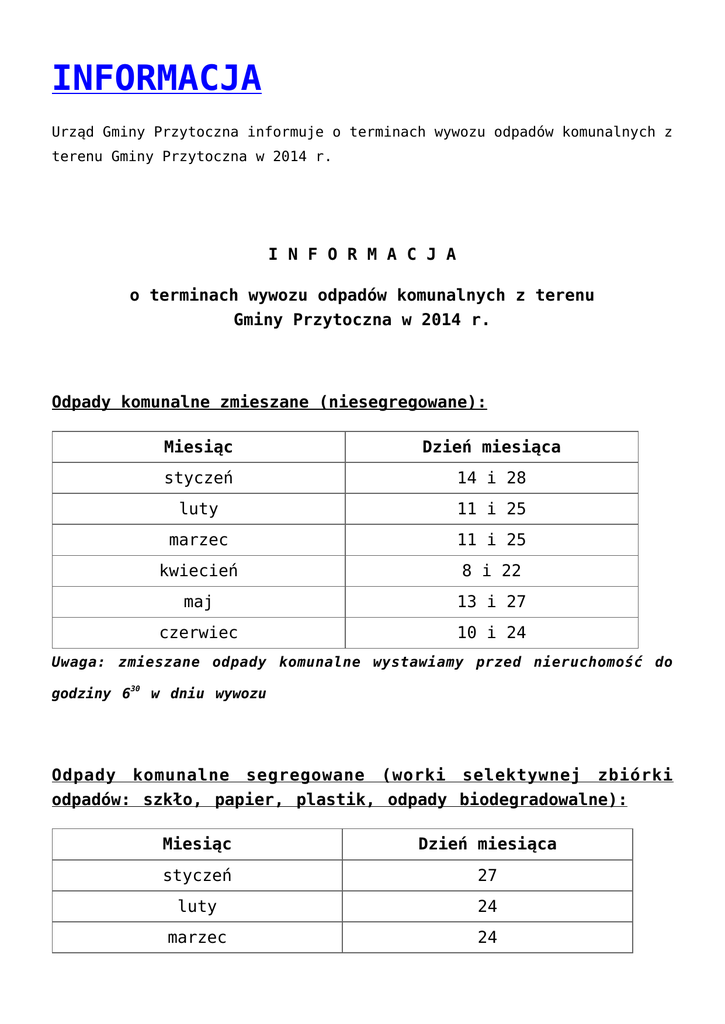 INFORMACJA Urząd Gminy Przytoczna informuje o terminach wywozu odpadów komunalnych z terenu Gminy Przytoczna w 2014 r. I N F O R M A C J A o terminach wywozu odpadów komunalnych z terenu Gminy Przytoczna w 2014 r. Odpady komunalne zmieszane (niesegregowane): Miesiąc Dzień miesiąca styczeń 14 i 28 luty 11 i 25 marzec 11 i 25 kwiecień 8 i 22 maj 13 i 27 czerwiec 10 i 24 Uwaga: zmieszane odpady komunalne wystawiamy przed nieruchomość do godziny 6 30 w dniu wywozu Odpady komunalne segregowane (worki selektywnej zbiórki odpadów: szkło, papier, plastik, odpady biodegradowalne): Miesiąc Dzień miesiąca styczeń 27 luty 24 marzec 24 kwiecień 23 maj 27 czerwiec 23 Uwaga: segregowane odpady komunalne wystawiamy przed nieruchomość do godziny 6 30 w dniu wywozu. Mając na uwadze prawidłowe funkcjonowanie gospodarki odpadami komunalnymi na terenie Gminy Przytoczna, proszę wszystkich właścicieli nieruchomości zamieszkałych o zgłaszanie ewentualnych uwag co do sposobu zbierania odpadów, jak również zgłaszanie potrzeb dostarczenia worków do segregacji oraz dostawienia pojemników, które będą gwarantowały utrzymanie czystości i porządku, pod nr tel. (95) 781-41-11 lub w Urzędzie Gminy – pokój nr 1 (parter). Wójt Gminy Przytoczna /-/ Bartłomiej Kucharyk POCZYTAJ MI SZÓSTOKLASISTO Dzięki Pani Dorocie Kmieciak i uczniom klasy VI b do przedszkola w Przytocznej zawitali bohaterowie znanych i mniej znanych bajek oraz wierszy Dzięki Pani Dorocie Kmieciak i uczniom klasy VI b do przedszkola w Przytocznej zawitali bohaterowie znanych i mniej znanych bajek oraz wierszy. Przedszkolaki to bardzo wymagający słuchacze. Trzeba wysilić wszystkie siły, by skupić ich uwagę. Na szczęście udało się tego dokonać ich starszym koleżankom. Odpowiednio modulując głosem zainteresowały maluchów treścią wybranych przez siebie bajek. Wcześniej wspólnie czytały je na dodatkowych zajęciach z języka polskiego, by jak najlepiej przygotować się do spotkania z najmłodszymi. Dzieciaki słuchały historii o skaczącej piłce, przyjaznym osiołku, rozkosznym Bambo. Razem z Olą i Jackiem spały w namiocie. Wyobrażały sobie też, że wychodzą na spacer z psem i idą na przyjęcie. Każdy przedszkolak otrzymał w prezencie ciekawą kolorowankę, która była związana z treścią czytanych bajek. Dzięki temu dzieci będą mogły trochę dłużej zatrzymać w pamięci wizytę starszych koleżanek. Kolejny raz mogliśmy przekonać się, że najlepiej jest, kiedy możemy uczyć się od siebie wzajemnie. Nasi uczniowie mieli okazję doświadczyć, że bycie po drugiej stronie biurka nie jest wcale takie łatwe. Wiele radości przyniosło im również wspominanie czasów, kiedy sami byli wśród uczniów przedszkola. Z zainteresowaniem oglądali zdjęcia wiszące na korytarzu i opowiadali sobie historie z przeszłości. Przedszkolaki jeszcze chętniej słuchały bajek, kiedy czytali je niecodzienni goście. Inicjatywa pani Doroty Kmieciak była więc znakomitym pomysłem. Oby w przyszłości takich spotkań odbywało się jeszcze więcej. Renata Pałka pb274928 – kopia pb274929 – kopia pb274930 – kopia pb274931 – kopia pb274932 – kopia pb274933 – kopia pb274935 – kopia pb274936 – kopia pb274938 – kopia źródło: Szkoła Podstawowa z Oddziałami Integracyjnymi im. Janusza Kusocińskiego w Przytocznej FREDROWSKA GIMNAZJUM KOMEDIA W 28 listopada 2013 r. w naszym gimnazjum odbyła się ogólnopolska akcja publicznego czytania, która dedykowana była autorowi wspaniałych komedii – Aleksandrowi Fredrze FREDROWSKA KOMEDIA W GIMNAZJUM „Narodowe Czytanie” to zainicjowana w 2012 roku przez Prezydenta Bronisława Komorowskiego ogólnopolska akcja publicznego czytania największych polskich dzieł literackich. W ubiegłym roku w naszym gimnazjum czytaliśmy „Pana Tadeusza” Adama Mickiewicza. Tegoroczna edycja dedykowana jest autorowi wspaniałych komedii – Aleksandrowi hrabiemu Fredrze. 28 listopada w holu naszego gimnazjum wyrosły mury starego zamku, a po szkole przez cały dzień przechadzały się postaci w XIX-wiecznych strojach. W tej scenografii nasi uczniowie zaprezentowali swoim koleżankom i kolegom fragmenty fredrowskiej „Zemsty”. Prezentacje odbywały się na przerwach. Widownia z zainteresowaniem i rozbawieniem śledziła losy głównych bohaterów. Na zakończenie uczniowie zobaczyli scenę pisania listu przez Dyndalskiego w gwiazdorskim wykonaniu pani Danuty Szczyszyk – przewodniczącej Rady Rodziców oraz pedagoga szkolnego pana Mirosława Romanowskiego . Gratulujemy umiejętności recytatorskich oraz serdecznie dziękujemy za udział w akcji dorosłym i młodym recytatorom: Oliwii, Dagmarze, Paulinie, Marcie, Wiktorii, Asi, Denisowi i Bartkowi. Program został przygotowany przez Annę Doruch, Elżbietę Piątyszek oraz Dorotę Dymnicką. Organizatorki dziękują również za pomoc autorom scenografii – panom Mirosławowi Romanowskiemu i Wiesławowi Gniazdowskiemu. Już dziś zapraszamy za rok na kolejną odsłonę „Narodowego Czytania”. 1 2 3 4 5 6 8 9 10 11 12 13 14 15 16 źródło: Gimnazjum z oddziałami integracyjnymi im. Jana Pawła II w Przytocznej