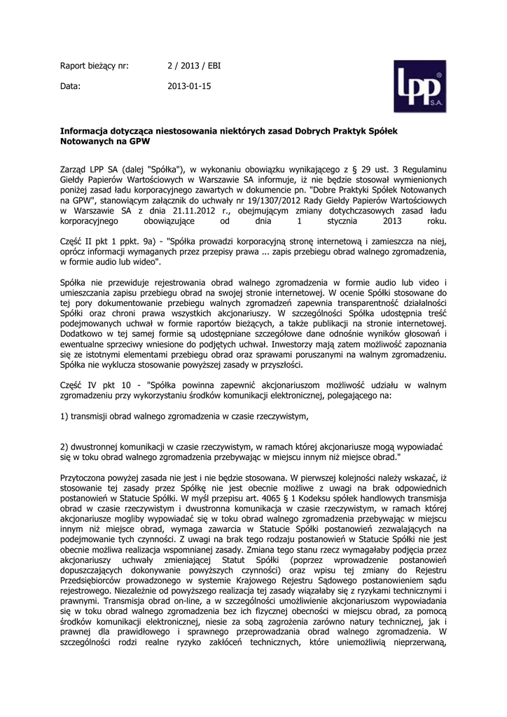 Raport bieżący nr: 2 / 2013 / EBI Data: 2013-01-15 Informacja dotycząca niestosowania niektórych zasad Dobrych Praktyk Spółek Notowanych na GPW Zarząd LPP SA (dalej "Spółka"), w wykonaniu obowiązku wynikającego z § 29 ust. 3 Regulaminu Giełdy Papierów Wartościowych w Warszawie SA informuje, iż nie będzie stosował wymienionych poniżej zasad ładu korporacyjnego zawartych w dokumencie pn. "Dobre Praktyki Spółek Notowanych na GPW", stanowiącym załącznik do uchwały nr 19/1307/2012 Rady Giełdy Papierów Wartościowych w Warszawie SA z dnia 21.11.2012 r., obejmującym zmiany dotychczasowych zasad ładu korporacyjnego obowiązujące od dnia 1 stycznia 2013 roku. Część II pkt 1 ppkt. 9a) - "Spółka prowadzi korporacyjną stronę internetową i zamieszcza na niej, oprócz informacji wymaganych przez przepisy prawa ... zapis przebiegu obrad walnego zgromadzenia, w formie audio lub wideo". Spółka nie przewiduje rejestrowania obrad walnego zgromadzenia w formie audio lub video i umieszczania zapisu przebiegu obrad na swojej stronie internetowej. W ocenie Spółki stosowane do tej pory dokumentowanie przebiegu walnych zgromadzeń zapewnia transparentność działalności Spółki oraz chroni prawa wszystkich akcjonariuszy. W szczególności Spółka udostępnia treść podejmowanych uchwał w formie raportów bieżących, a także publikacji na stronie internetowej. Dodatkowo w tej samej formie są udostępniane szczegółowe dane odnośnie wyników głosowań i ewentualne sprzeciwy wniesione do podjętych uchwał. Inwestorzy mają zatem możliwość zapoznania się ze istotnymi elementami przebiegu obrad oraz sprawami poruszanymi na walnym zgromadzeniu. Spółka nie wyklucza stosowanie powyższej zasady w przyszłości. Część IV pkt 10 - "Spółka powinna zapewnić akcjonariuszom możliwość udziału w walnym zgromadzeniu przy wykorzystaniu środków komunikacji elektronicznej, polegającego na: 1) transmisji obrad walnego zgromadzenia w czasie rzeczywistym, 2) dwustronnej komunikacji w czasie rzeczywistym, w ramach której akcjonariusze mogą wypowiadać się w toku obrad walnego zgromadzenia przebywając w miejscu innym niż miejsce obrad." Przytoczona powyżej zasada nie jest i nie będzie stosowana. W pierwszej kolejności należy wskazać, iż stosowanie tej zasady przez Spółkę nie jest obecnie możliwe z uwagi na brak odpowiednich postanowień w Statucie Spółki. W myśl przepisu art. 4065 § 1 Kodeksu spółek handlowych transmisja obrad w czasie rzeczywistym i dwustronna komunikacja w czasie rzeczywistym, w ramach której akcjonariusze mogliby wypowiadać się w toku obrad walnego zgromadzenia przebywając w miejscu innym niż miejsce obrad, wymaga zawarcia w Statucie Spółki postanowień zezwalających na podejmowanie tych czynności. Z uwagi na brak tego rodzaju postanowień w Statucie Spółki nie jest obecnie możliwa realizacja wspomnianej zasady. Zmiana tego stanu rzecz wymagałaby podjęcia przez akcjonariuszy uchwały zmieniającej Statut Spółki (poprzez wprowadzenie postanowień dopuszczających dokonywanie powyższych czynności) oraz wpisu tej zmiany do Rejestru Przedsiębiorców prowadzonego w systemie Krajowego Rejestru Sądowego postanowieniem sądu rejestrowego. Niezależnie od powyższego realizacja tej zasady wiązałaby się z ryzykami technicznymi i prawnymi. Transmisja obrad on-line, a w szczególności umożliwienie akcjonariuszom wypowiadania się w toku obrad walnego zgromadzenia bez ich fizycznej obecności w miejscu obrad, za pomocą środków komunikacji elektronicznej, niesie za sobą zagrożenia zarówno natury technicznej, jak i prawnej dla prawidłowego i sprawnego przeprowadzania obrad walnego zgromadzenia. W szczególności rodzi realne ryzyko zakłóceń technicznych, które uniemożliwią nieprzerwaną, dwustronną komunikację z akcjonariuszami znajdującymi się w miejscach innych niż sala obrad. W ocenie Spółki aktualnie obowiązujące zasady udziału w walnych zgromadzeniach umożliwiają właściwą i efektywną realizację praw wynikających z akcji i wystarczająco zabezpieczają interesy wszystkich akcjonariuszy. Spółka jednak nie wyklucza możliwości stosowania w przyszłości zasady wynikającej z Części IV pkt 10 Dobrych Praktyk Spółek Notowanych na GPW. PODPISY: Dariusz Pachla - Wiceprezes Zarządu Piotr Dyka - Wiceprezes Zarządu