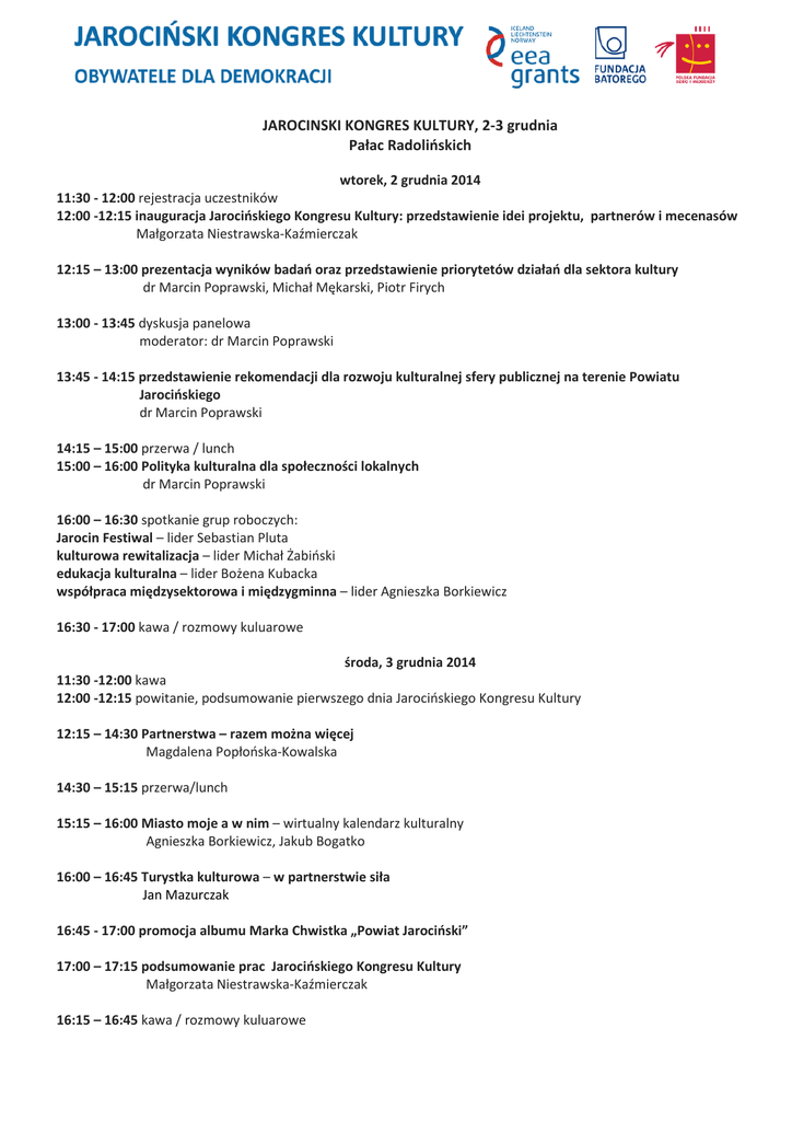 JAROCINSKI KONGRES KULTURY, 2-3 grudnia Pałac Radolińskich wtorek, 2 grudnia 2014 11:30 - 12:00 rejestracja uczestników 12:00 -12:15 inauguracja Jarocińskiego Kongresu Kultury: przedstawienie idei projektu, partnerów i mecenasów Małgorzata Niestrawska-Kaźmierczak 12:15 – 13:00 prezentacja wyników badań oraz przedstawienie priorytetów działań dla sektora kultury dr Marcin Poprawski, Michał Mękarski, Piotr Firych 13:00 - 13:45 dyskusja panelowa moderator: dr Marcin Poprawski 13:45 - 14:15 przedstawienie rekomendacji dla rozwoju kulturalnej sfery publicznej na terenie Powiatu Jarocińskiego dr Marcin Poprawski 14:15 – 15:00 przerwa / lunch 15:00 – 16:00 Polityka kulturalna dla społeczności lokalnych dr Marcin Poprawski 16:00 – 16:30 spotkanie grup roboczych: Jarocin Festiwal – lider Sebastian Pluta kulturowa rewitalizacja – lider Michał Żabiński edukacja kulturalna – lider Bożena Kubacka współpraca międzysektorowa i międzygminna – lider Agnieszka Borkiewicz 16:30 - 17:00 kawa / rozmowy kuluarowe środa, 3 grudnia 2014 11:30 -12:00 kawa 12:00 -12:15 powitanie, podsumowanie pierwszego dnia Jarocińskiego Kongresu Kultury 12:15 – 14:30 Partnerstwa – razem można więcej Magdalena Popłońska-Kowalska 14:30 – 15:15 przerwa/lunch 15:15 – 16:00 Miasto moje a w nim – wirtualny kalendarz kulturalny Agnieszka Borkiewicz, Jakub Bogatko 16:00 – 16:45 Turystka kulturowa – w partnerstwie siła Jan Mazurczak 16:45 - 17:00 promocja albumu Marka Chwistka „Powiat Jarociński” 17:00 – 17:15 podsumowanie prac Jarocińskiego Kongresu Kultury Małgorzata Niestrawska-Kaźmierczak 16:15 – 16:45 kawa / rozmowy kuluarowe PRELEGENCI Dr Marcin Poprawski – adiunkt w Instytucie Kulturoznawstwa Uniwersytetu im. Adama Mickiewicza w Poznaniu, współzałożyciel i koordynator Regionalnego Obserwatorium Kultury – Centrum Badawczego UAM w Poznaniu, od 2006 roku wykładowca na Uniwersytecie Europejskim Viadrina we Frankfurcie nad Odrą; doktor nauk humanistycznych, muzykolog, menedżer, koordynator badań w dziedzinie polityki kulturalnej i zarządzania w kulturze, współautor strategii i szkoleń dla samorządów i instytucji, autor i redaktor publikacji z zakresu nauk o kulturze oraz zarządzania, ekspert Związku Miast Polskich. Od 2013 roku wiceprezes europejskiej sieci ENCATC - European Network of Cultural Administration Training Centers. Michał Mękarski – socjolog (specjalizacja badanie rynku i opinii publicznej), doktorant w Instytucie Kulturoznawstwa UAM, współpracownik i koordynator projektów badawczych Regionalnego Obserwatorium Kultury UAM w Poznaniu. Uczestniczył w wielu projektach w roli szkoleniowca i trenera. Specjalizuje się w analizie statystycznej oraz opracowywaniu narzędzi i dyspozycji badawczych do badań ilościowych i jakościowych. Piotr Firych – specjalista ds. mediów i komunikacji, doktorant w Instytucie Kulturoznawstwa UAM w Poznaniu, magister studiów międzynarodowych w dziedzinie komunikacji społecznej oraz studiów latynoamerykańskich na Aalborg University w Danii. Pracował dla Polskiej Organizacji Turystycznej w Madrycie, posiada doświadczenie dziennikarskie, uczestniczył w wielu projektach kulturalnych. Współpracownik Regionalnego Obserwatorium Kultury UAM. Od 2013 roku rzecznik prasowy festiwalu Akademia Gitary. Jan Mazurczak - Prezes Poznańskiej Lokalnej Organizacji Turystycznej. Magdalena Popłońska-Kowalska - Absolwentka Uniwersytetu im. A. Mickiewicza w Poznaniu. Pedagog pracy socjalnej i pracownik socjalny. Przez okres 18 lat była związana z Miejskim Ośrodkiem Pomocy Rodzinie w Poznaniu, realizując zadania pracownika socjalnego, a później kierownika. Od 10 lat trener, superwizor pracowników socjalnych i ekspert Centrum Wspierania Aktywności Lokalnej CAL w Warszawie, wykładowca w Kolegium Pracowników Służb Społecznych w Poznaniu. W kręgu zainteresowań pozostaje organizowanie społeczności lokalnej zarówno w teorii jak i praktyce. Pasjonatka pracy socjalnej , zakładania partnerstw i zmiany społecznej.