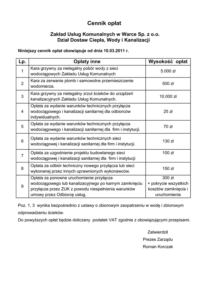 Cennik opłat - Zakład Usług Komunalnych w Warce Sp. z oo