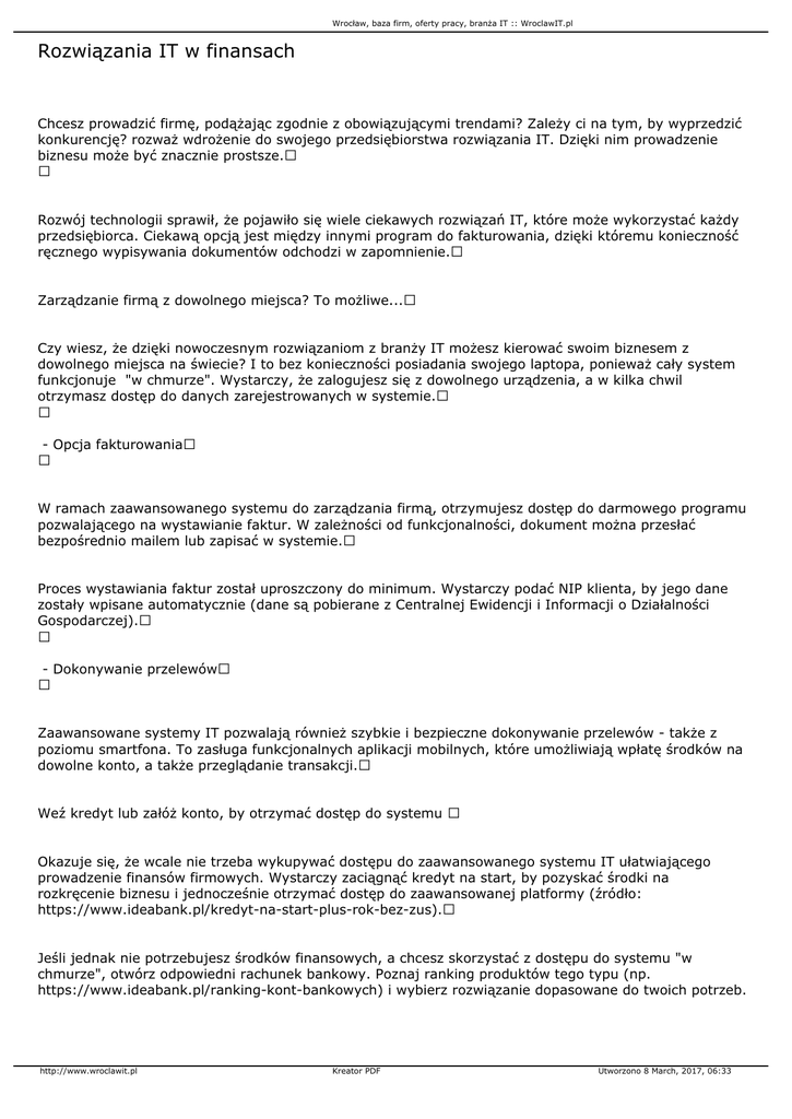 Wrocław, baza firm, oferty pracy, branża IT :: WroclawIT.pl Rozwiązania IT w finansach Chcesz prowadzić firmę, podążając zgodnie z obowiązującymi trendami? Zależy ci na tym, by wyprzedzić konkurencję? rozważ wdrożenie do swojego przedsiębiorstwa rozwiązania IT. Dzięki nim prowadzenie biznesu może być znacznie prostsze. Rozwój technologii sprawił, że pojawiło się wiele ciekawych rozwiązań IT, które może wykorzystać każdy przedsiębiorca. Ciekawą opcją jest między innymi program do fakturowania, dzięki któremu konieczność ręcznego wypisywania dokumentów odchodzi w zapomnienie. Zarządzanie firmą z dowolnego miejsca? To możliwe... Czy wiesz, że dzięki nowoczesnym rozwiązaniom z branży IT możesz kierować swoim biznesem z dowolnego miejsca na świecie? I to bez konieczności posiadania swojego laptopa, ponieważ cały system funkcjonuje "w chmurze". Wystarczy, że zalogujesz się z dowolnego urządzenia, a w kilka chwil otrzymasz dostęp do danych zarejestrowanych w systemie. - Opcja fakturowania W ramach zaawansowanego systemu do zarządzania firmą, otrzymujesz dostęp do darmowego programu pozwalającego na wystawianie faktur. W zależności od funkcjonalności, dokument można przesłać bezpośrednio mailem lub zapisać w systemie. Proces wystawiania faktur został uproszczony do minimum. Wystarczy podać NIP klienta, by jego dane zostały wpisane automatycznie (dane są pobierane z Centralnej Ewidencji i Informacji o Działalności Gospodarczej). - Dokonywanie przelewów Zaawansowane systemy IT pozwalają również szybkie i bezpieczne dokonywanie przelewów - także z poziomu smartfona. To zasługa funkcjonalnych aplikacji mobilnych, które umożliwiają wpłatę środków na dowolne konto, a także przeglądanie transakcji. Weź kredyt lub załóż konto, by otrzymać dostęp do systemu Okazuje się, że wcale nie trzeba wykupywać dostępu do zaawansowanego systemu IT ułatwiającego prowadzenie finansów firmowych. Wystarczy zaciągnąć kredyt na start, by pozyskać środki na rozkręcenie biznesu i jednocześnie otrzymać dostęp do zaawansowanej platformy (źródło: https://www.ideabank.pl/kredyt-na-start-plus-rok-bez-zus). Jeśli jednak nie potrzebujesz środków finansowych, a chcesz skorzystać z dostępu do systemu "w chmurze", otwórz odpowiedni rachunek bankowy. Poznaj ranking produktów tego typu (np. https://www.ideabank.pl/ranking-kont-bankowych) i wybierz rozwiązanie dopasowane do twoich potrzeb. http://www.wroclawit.pl Kreator PDF Utworzono 8 March, 2017, 06:33