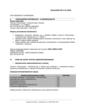 ZAŁĄCZNIK NR 6 do SIWZ OPIS PRZEDMIOTU ZAMÓWIENIA I. PODSTAWOWE INFORMACJE O ZAMAWIAJĄCYM Nazwa jednostki: Centrum Pulmonologii i Torakochirurgii w Bystrej 43-360 Bystra , ul. J Fałata 2 NIP: 937-00-10-797; REGON: 000640923 Tel./fax: (033) 499-18-01 , 499-18-02 Miejsce prowadzenia działalności: 1. Świadczenia zdrowotne udzielane są w siedzibie Zakładu Centrum Pulmonologii i Torakochirurgii w Bystrej przy ul. J Fałata 2 2. Udzielanie przez Zakład ambulatoryjnych świadczeń zdrowotnych może odbywać się także w miejscu pobytu pacjenta. 3. Zakład realizuje cele i zadania dla pacjentów zamieszkałych w Rzeczpospolitej Polskiej i pacjentów z zagranicy. Wpis do Krajowego Rejestru Sądowego pod numerem KRS: 0000114709 REGON: 000640923 Działalność wg PKD – 8610Z Działalność Szpitali NIP: 937-00-10-797 II. DANE DO OCENY RYZYKA UBEZPIECZENIOWEGO Ubezpieczenia odpowiedzialności cywilnej Centrum Pulmonologii i Torakochirurgii w Bystrej jest ośrodkiem o wieloletniej tradycji i ogromnym doświadczeniu w zakresie wykrywania i leczenia chorób płuc. RODZAJE WYKONYWANYCH USŁUG Rodzaj wykonywanych usług Lecznictwo Szpitalne + izba przyjęć + chemioterapia Ambulatoryjna opieka specjalistyczna Tlenoterapia domowa Rehabilitacja Lecznicza Medyczne Laboratorium Diagnostyczne Pracownie Diagnostyczne TAK/NIE Tak Tak Tak Tak Tak Tak Katalog procedur medycznych realizowanych przez podmiot leczniczy: ________________________________________________________________________ Załącznik do SIWZ – postępowanie nr 4/EZP/380/1/2015 I Procedury szpitalne w zakresie pulmonologii diagnostyka zmian radiologicznych w płucach i śródpiersiu pacjentów (gruźlica, nowotwory, zmiany rozsiane, grzybice i inne rzadziej występujące choroby płuc), diagnostyka płynu w opłucnej, diagnostyka objawów ze strony układu oddechowego (kaszel, krwioplucie, duszność, pogarszająca się tolerancja wysiłku, bóle w klatce piersiowej, itp.), diagnostyka chorób alergicznych układu oddechowego, leczenie stanów zapalnych układu oddechowego, leczenie chorób śródmiąższowych płuc m.in. sarkoidozy, leczenie zaostrzeń astmy oskrzelowej i POChP, leczenie wysiękowych zmian chorobowych, ocena zaawansowania chorób nowotworowych układu oddechowego i przygotowanie do dalszego leczenia, kwalifikacja pacjentów do domowego leczenia tlenem. Każdy z oddziałów szpitalnych ma dostęp do pełnego panelu badań laboratoryjnych, cytologicznych, mikrobiologicznych, radiologicznych, endoskopowych i badań czynnościowych płuc. W zakresie gruźlicy diagnostyka i leczenie gruźlicę płuc, gruźlicę innych układów m.in. gruźlicę opłucnej, kości, pęcherza moczowego, układu nerwowego, gruźlicę lekooporną mykobakteriozy W zakresie chirurgii klatki piersiowej: 1. Pełna diagnostyka chorób klatki piersiowej Bronchofiberoskopie Bronchofiberoskopie EBUS /EUS (przez oskrzelową biopsję igłową po kontrolą USG) Biopsje igłowe transtorakalne Biopsje węzłów chłonnych nadobojczykowych USG, TK RM klatki piersiowej 2. Zabiegi w zakresie klatki piersiowej Resekcje miąższu płucnego. resekcję guzów śródpiersia Całkowite usunięcie węzłów chłonnych śródpiersia Leczenie chirurgiczne uszkodzeń urazowych Zakładanie protez tchawiczych i tchawiczo-oskrzelowych z użyciem wentylacji dyszowej Resekcje tchawicy Usunięcia torbieli rozedmowych, protezowanie dróg oddechowych 3. Zabiegi z zastosowaniem toru wizyjnego Videotorakoskopie- diagnostykę płynu opłucnowego Videotorakoskopowe szycie płuca, diagnostykę zmian w opłucnej i tkance płucnej Videomediastinoskopie diagnostykę węzłów chłonnych śródpiersia W zakresie chemioterapii nowotworów płuc: W każdym oddziale pulmonologicznym diagnozowane są choroby nowotworowe płuc, zgodnie ze standardami onkologicznymi. Leczenie chorób nowotworowych w ________________________________________________________________________ Załącznik do SIWZ – postępowanie nr 4/EZP/380/1/2015 trybie hospitalizacji i chemioterapii ambulatoryjnej prowadzone jest w Oddziale Pulmonologii z Pododdziałem Chemioterapii. W nowoczesnej pracowni cytostatycznej i salach do chemioterapii podawane są wielolekowe schematy chemioterapii przy użyciu sprzętu bezpiecznego dla personelu i pacjentów. Szpital monitoruje także skuteczność leczenia onkologicznego. Oddział ma dostęp do pełnego panelu badań krwi, badań radiologicznych, jak również histopatologicznych i radiologicznych. W zakresie diagnostyki i leczenia bezdechu sennego: kwalifikacja do diagnostyki polisomnograficznej, ocena wyników badania polisomnograficznego i decyzja co do dalszego leczenia, II Procedury w poradniach specjalistycznych W poradni chorób płuc i gruźlicy realizowane są: świadczenia diagnostyczno-lecznicze, kwalifikowanie pacjentów do leczenia szpitalnego, prowadzenie badań kontrolnych po leczeniu szpitalnym, udzielanie konsultacji pacjentom kierowanym przez lekarzy rodzinnych, specjalistów i przez inne zakłady opieki zdrowotnej, zlecenie wykonania specjalistycznych badań diagnostycznych. kontynuację terapii szpitalnej pacjentów szczególnie z gruźlicą lekooporną i mykobakteriozą, wymagających okresowych badań laboratoryjnych, okresową kontrolę po zakończonej terapii p/prątkowej szczególnie u pacjentów wymagających specjalistycznej opieki lekarskiej z uwagi na możliwość wznowy choroby, W poradni alergologicznej realizowane są: diagnostykę i leczenie chorób alergicznych układu oddechowego, w tym kwalifikacja i prowadzenie immunoterapii swoistej, udzielanie konsultacji pacjentom kierowanym przez lekarzy rodzinnych. W poradni Chirurgii Klatki Piersiowej realizowane są: świadczenia diagnostyczno-lecznicze, kwalifikowanie pacjentów do leczenia szpitalnego, prowadzenie badań kontrolnych po leczeniu szpitalnym, udzielanie konsultacji pacjentom po zabiegach operacyjnych na klatce piersiowej, pacjentom kierowanym przez lekarzy rodzinnych, specjalistów i