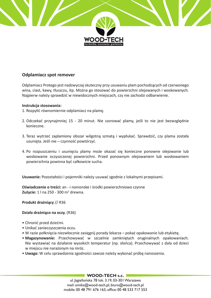 Odplamiacz spot remover Odplamiacz Protego jest nadzwyczaj skuteczny przy usuwaniu plam pochodzących od czerwonego wina, ciast, kawy, tłuszczu, itp. Można go stosować do powierzchni olejowanych i woskowanych. Najpierw należy sprawdzić w niewidocznych miejscach, czy nie zachodzi odbarwienie. Instrukcja stosowania: 1. Rozpylić równomiernie odplamiacz na plamę. 2. O dczekać przynajmniej 15 - 20 minut. Nie szorować plamy, jeśli to nie jest bezwzględnie konieczne. 3. T eraz wytrzeć zaplamiony obszar wilgotną szmatą i wypłukać. Sprawdzić, czy plama została usunięta. Jeśli nie – czynność powtórzyć. 4. P o rozpuszczeniu i usunięciu plamy może okazać się konieczne ponowne olejowanie lub woskowanie oczyszczonej powierzchni. Przed ponownym olejowaniem lub woskowaniem powierzchnia powinna być całkowicie sucha. Usuwanie: Pozostałości i pojemniki należy usuwać zgodnie z lokalnymi przepisami. Oświadczenie o treści: an - i nonionske i środki powierzchniowo czynne Zużycie: 1 l na 250 - 300 m2 drewna. Produkt drażniący // R36 Działa drażniąco na oczy. (R36) • Chronić przed dziećmi. • Unikać zanieczyszczenia oczu. • W razie połknięcia niezwłocznie zasięgnij porady lekarza – pokaż opakowanie lub etykietę. • Magazynowanie: Przechowywać w szczelnie zamkniętych oryginalnych opakowaniach. Nie wystawiać na działanie wysokich temperatur (np. słońca). Przechowywać z dala od dzieci w miejscu nie narażonym na mróz. • Uwaga: W celu sprawdzenia zgodności zawsze należy wykonać próbę nanoszenia. WOOD-TECH s.c. ul. Jagiellońska 78 lok. 3.19, 03-301 Warszawa mail: [email protected], [email protected] mobile: 00 48 791 676 163, office: 00 48 533 717 553