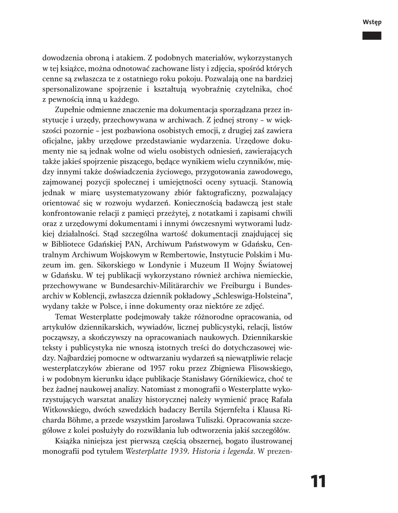 Wstęp dowodzenia obroną i atakiem. Z podobnych materiałów, wykorzystanych w tej książce, można odnotować zachowane listy i zdjęcia, spośród których cenne są zwłaszcza te z ostatniego roku pokoju. Pozwalają one na bardziej spersonalizowane spojrzenie i kształtują wyobraźnię czytelnika, choć z pewnością inną u każdego. Zupełnie odmienne znaczenie ma dokumentacja sporządzana przez instytucje i urzędy, przechowywana w archiwach. Z jednej strony – w większości pozornie – jest pozbawiona osobistych emocji, z drugiej zaś zawiera oficjalne, jakby urzędowe przedstawianie wydarzenia. Urzędowe dokumenty nie są jednak wolne od wielu osobistych odniesień, zawierających także jakieś spojrzenie piszącego, będące wynikiem wielu czynników, między innymi także doświadczenia życiowego, przygotowania zawodowego, zajmowanej pozycji społecznej i umiejętności oceny sytuacji. Stanowią jednak w miarę usystematyzowany zbiór faktograficzny, pozwalający orientować się w rozwoju wydarzeń. Koniecznością badawczą jest stałe konfrontowanie relacji z pamięci przeżytej, z notatkami i zapisami chwili oraz z urzędowymi dokumentami i innymi ówczesnymi wytworami ludzkiej działalności. Stąd szczególna wartość dokumentacji znajdującej się w Bibliotece Gdańskiej PAN, Archiwum Państwowym w Gdańsku, Centralnym Archiwum Wojskowym w Rembertowie, Instytucie Polskim i Muzeum im. gen. Sikorskiego w Londynie i Muzeum II Wojny Światowej w Gdańsku. W tej publikacji wykorzystano również archiwa niemieckie, przechowywane w Bundesarchiv-Militärarchiv we Freiburgu i Bundesarchiv w Koblencji, zwłaszcza dziennik pokładowy „Schleswiga-Holsteina”, wydany także w Polsce, i inne dokumenty oraz niektóre ze zdjęć. Temat Westerplatte podejmowały także różnorodne opracowania, od artykułów dziennikarskich, wywiadów, licznej publicystyki, relacji, listów począwszy, a skończywszy na opracowaniach naukowych. Dziennikarskie teksty i publicystyka nie wnoszą istotnych treści do dotychczasowej wiedzy. Najbardziej pomocne w odtwarzaniu wydarzeń są niewątpliwie relacje westerplatczyków zbierane od 1957 roku przez Zbigniewa Flisowskiego, i w podobnym kierunku idące publikacje Stanisławy Górnikiewicz, choć te bez żadnej naukowej analizy. Natomiast z monografii o Westerplatte wykorzystujących warsztat analizy historycznej należy wymienić pracę Rafała Witkowskiego, dwóch szwedzkich badaczy Bertila Stjernfelta i Klausa Richarda Böhme, a przede wszystkim Jarosława Tuliszki. Opracowania szczegółowe z kolei posłużyły do rozwikłania lub odtworzenia jakiś szczegółów. Książka niniejsza jest pierwszą częścią obszernej, bogato ilustrowanej monografii pod tytułem Westerplatte 1939. Historia i legenda. W prezen- 11