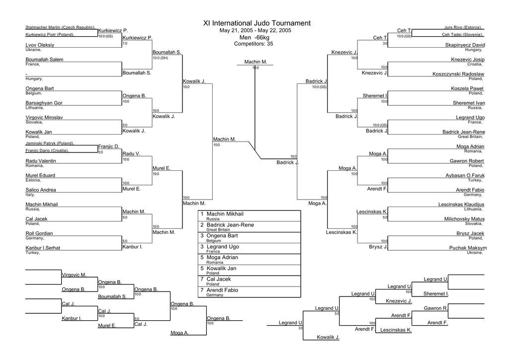 Stalmacher Martin (Czech Republic), Kurkiewicz Piotr (Poland), XI International Judo Tournament May 21, 2005 - May 22, 2005 Kurkiewicz P. 10:0 (GS) Kurkiewicz P. Men -66kg Ceh T. Competitors: 35 7:0 Lvov Oleksiy Ceh T. Ukraine, Boumallah S. Hungary, 10:0 Knezevic Josip Machin M. France, Boumallah S. - Knezevic J. Hungary, Kowalik J. Ongena Bart Poland, 10:0 (GS) Koszela Pawel Ongena B. 10:0 Lithuania, 10:0 Virgovic Miroslav Legrand Ugo France, 10:0 (GS) Kowalik J. Badrick J. Poland, Franjic Dario (Croatia), Russia, Badrick J. 5:0 Kowalik Jan Sheremet Ivan 10:0 Kowalik J. Slovakia, Poland, Sheremet I. 10:0 Barsaghyan Gor Koszczynski Radoslaw Badrick J. 10:0 Belgium, Croatia, 10:0 10:0 Jaminski Patryk (Poland), Skapinyecz David Knezevic J. 10:0 (DH) Boumallah Salem 10:0 (GS) 3:0 Jurs Rivo (Estonia), Ceh Tadej (Slovenia), Badrick Jean-Rene Great Britain, Machin M. 10:0 Franjic D. 5:0 Radu V. 10:0 10:0 Radu Valentin Moga Adrian 10:0 Badrick J. Romania, Murel E. Estonia, Poland, 10:0 Aybasan O.Faruk 10:0 Arendt F. Italy, 10:0 Machin Mikhail Machin M. Cal Jacek Machin M. Roll Gordian Great Britain Slovakia, Lescinskas K. 3 Ongena Bart Brysz Jacek Poland, 10:0 3 Legrand Ugo Kanbur I. Milichovsky Matus 10:0 Belgium 5:0 Lithuania, 5:0 2 Badrick Jean-Rene 10:0 Kanbur I.Serhat Lescinskas Klaudijus Lescinskas K. Russia Poland, Germany, Germany, Moga A. 1 Machin Mikhail 5:0 Arendt Fabio 10:0 Machin M. Russia, Turkey, 10:0 Murel E. Salico Andrea Gawron Robert Moga A. 10:0 Murel Eduard Romania, Moga A. Brysz J. Puchak Maksym France Turkey, Ukraine, 5 Moga Adrian Romania 5 Kowalik Jan Poland Virgovic M. 7 Cal Jacek Ongena B. Ongena B. Ongena B. Boumallah S. 10:0 Cal J. Legrand U. 7 Arendt Fabio Germany Ongena B. 10:0 Murel E. Legrand U. 10:0 10:0 Knezevic J. Legrand U. 10:0 Cal J. Kanbur I. Legrand U. Poland 10:0 Gawron R. 5:0 5:0 Ongena B. Cal J. 10:0 Legrand U. Moga A. Arendt F. 10:0 3:0 Arendt F. Lescinskas K. Kowalik J. Sheremet I. Arendt F.