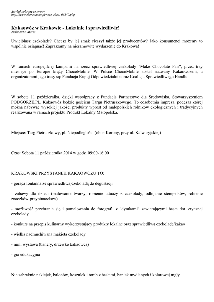 Artykuł pobrany ze strony http://www.ekonsument.pl/news-show-66840.php Kakaowóz w Krakowie - Lokalnie i sprawiedliwie! 29.09.2014, Maria Uwielbiasz czekoladę? Chcesz by jej smak cieszył także jej producentów? Jako konsumenci możemy to wspólnie osiągnąć! Zapraszamy na niesamowite wydarzenie do Krakowa! W ramach europejskiej kampanii na rzecz sprawiedliwej czekolady "Make Chocolate Fair", przez trzy miesiące po Europie krąży ChocoMobile. W Polsce ChocoMobile został nazwany Kakaowozem, a organizatorami jego trasy są: Fundacja Kupuj Odpowiedzialnie oraz Koalicja Sprawiedliwego Handlu. W sobotę 11 października, dzięki współpracy z Fundacją Partnerstwo dla Środowiska, Stowarzyszeniem PODGORZE.PL, Kakaowóz będzie gościem Targu Pietruszkowego. To cosobotnia impreza, podczas której można nabywać wysokiej jakości produkty wprost od małopolskich rolników ekologicznych i tradycyjnych realizowana w ramach projektu Produkt Lokalny Małopolska. Miejsce: Targ Pietruszkowy, pl. Niepodległości (obok Korony, przy ul. Kalwaryjskiej) Czas: Sobota 11 października 2014 w godz. 09:00-16:00 KRAKOWSKI PRZYSTANEK KAKAOWÓZU TO: - gorąca fontanna ze sprawiedliwą czekoladą do degustacji - zabawy dla dzieci (malowanie twarzy, robienie tatuaży z czekolady, odbijanie stempelków, robienie znaczków-przypinaczków) - możliwość przebrania się i pomalowania do fotografii z "dymkami" zawierającymi hasła dot. etycznej czekolady - konkurs na przepis kulinarny wykorzystujący produkty lokalne oraz sprawiedliwą czekoladę/kakao - wielka nadmuchiwana makieta czekolady - mini wystawa (banery, drzewko kakaowca) - gra edukacyjna Nie zabraknie naklejek, balonów, koszulek i toreb z hasłami, baniek mydlanych i kolorowej mgły. Przede wszystkim jednak zbierane będą podpisy pod petycją o wprowadzenie sprawiedliwych zasad na światowym rynku kakao. O CO CHODZI? Ponad 90% kakao konsumowanego w Europie pochodzi z Afryki Zachodniej, gdzie stanowi źródło utrzymania dla ok. 20 milionom rolników i ich rodzin. Podczas gdy dochody międzynarodowych firm zajmujących się produkcją czekolady wciąż rosną, rolnicy muszą przeżyć za mniej niż 1,25 dolara dziennie, czyli sumę poniżej progu wyznaczającego skrajne ubóstwo. Rodzi to takie problemy jak wykorzystywanie pracy dzieci przy uprawach kakao, niebezpieczne warunki pracy, brak dostępu do edukacji i opieki zdrowotnej, a także degradację środowiska przyrodniczego. Dlatego domagamy się od koncernów czekoladowych: - Respektowania praw człowieka i praw pracowniczych w całym łańcuchu produkcji kakao i odrzucenie wykorzystywania pracy dzieci - Zagwarantowania uczciwej zapłaty dla rolników i pracowników farm kakaowych - Przyjęcia niezależnej certyfikacji i systemu monitoringu - Zwiększenia możliwości rolników kakao do tworzenia zrównoważonych i zróżnicowanych upraw Kontakt dla mediów i wolontariuszy: Andrzej Żwawa tel. 48 603363721 email: [email protected]