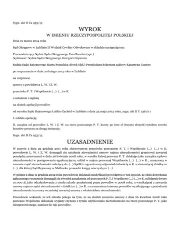 Sygn. akt II Ca 953/13 WYROK W IMIENIU RZECZYPOSPOLITEJ POLSKIEJ Dnia 19 marca 2014 roku Sąd Okręgowy w Lublinie II Wydział Cywilny Odwoławczy w składzie następującym: Przewodniczący Sędzia Sądu Okręgowego Ewa Bazelan (spr.) Sędziowie: Sędzia Sądu Okręgowego Grzegorz Grymuza Sędzia Sądu Rejonowego Marta Postulska-Siwek (del.) Protokolant Sekretarz sądowy Katarzyna Gustaw po rozpoznaniu w dniu 20 lutego 2014 roku w Lublinie na rozprawie sprawy z powództwa L. W. i Z. W. przeciwko P. T. i Wspólnocie (...) (...) w K. o ustalenie i zapłatę na skutek apelacji powodów od wyroku Sądu Rejonowego Lublin-Zachód w Lublinie z dnia 23 maja 2013 roku, sygn. akt II C 1361/11 I. oddala apelację; II. zasądza od powodów L. W. i Z. W. na rzecz pozwanego P. T. kwoty po 600 zł (trzysta złotych) tytułem zwrotu kosztów procesu za drugą instancję. Sygn. akt II Ca 953/13 UZASADNIENIE W pozwie z dnia 22 grudnia 2011 roku skierowanym przeciwko pozwanym P. T. i Wspólnocie (...) (...) w K. powodowie L. W. i Z. W. domagali się ustalenia nieważności umowy najmu nieruchomości gruntowej zawartej pomiędzy pozwanymi w dniu 26 kwietnia 2008 roku, w wyniku której pozwany P. T. działając jako zarządca sądowy nieruchomości w postępowaniu egzekucyjnym, oddał w najem pozwanej Wspólnocie (...) (...) w K., oznaczoną w umowie część nieruchomości należącą do (...) Spółki z ograniczoną odpowiedzialnością w K. a stanowiącej działkę nr (...), dla której Sąd Rejonowy w Malborku prowadzi księgę wieczystą nr (...). W piśmie z dnia 11 grudnia 2012 roku powodowie dokonali modyfikacji powództwa w ten sposób, że obok dotychczas zgłoszonego roszczenia domagali się również zasądzenia od pozwanych P. T. i Wspólnoty (...) (...) w K. solidarnie kwoty 10.000 zł, jako odszkodowania z tytułu szkody poniesionej przez powodów w 2008 roku, a wynikającej z zawarcia umowy najmu części nieruchomości - działki nr (...) w K. z naruszeniem interesu powodów wynikającego z posiadania nieruchomości na mocy wcześniej zawartej umowy z właścicielem nieruchomości. Powodowie wskazali, że ich szkoda polega na tym, że na skutek zawarcia umowy z dnia 26 kwietnia 2008 roku pozwana Wspólnota dokonała wypłaty czynszu z tytułu użytkowania nieruchomości na rzecz pozwanego P. T. jako nieuprawnionego, zamiast do rąk powodów. Wyrokiem z dnia 23 maja 2013 roku Sąd Rejonowy Lublin – Zachód w Lublinie: I. oddalił powództwo; II. zasądził od powodów L. W. i Z. W. solidarnie na rzecz pozwanego P. T. kwotę 2417 zł tytułem zwrotu kosztów procesu; III. nakazał ściągnąć od powodów L. W. i Z. W. solidarnie na rzecz Skarbu Państwa (Sąd Rejonowy Lublin - Zachód w Lublinie) kwotę 500 zł tytułem nieuiszczonej opłaty od pozwu. W uzasadnieniu powyższego Sąd Rejonowy ustalił, że w dniu 20 marca 2007 roku w L. została zawarta umowa najmu pomiędzy (...) Spółką z ograniczoną odpowiedzialnością w B., jako wynajmującym a (...) s.c. Agencja (...) w L. reprezentowaną przez L. W., jako najemcą. Przedmiotem umowy najmu były nieruchomości w K. przy ul. (...), obejmujące następujące działki gruntu z naniesieniami: a) (...) nr księgi wieczystej KW (...) zabudowana budynkiem W. b) (...)nr księgi wieczystej KW (...) zabudowana budynkiem W. c) (...) nr księgi wieczystej KW (...) zabudowana budynkiem gospodarczym oraz elementami małej architektury; d) (...) nr księgi wieczystej KW (...); w części obejmującej należące do wynajmującego, usytuowane w budynku mieszkalnym M., mieszkania nr (...). Powyższe nieruchomości stanowiły własność (...) Spółki z ograniczoną odpowiedzialnością z siedzibą w B. Do dnia 31 grudnia 2007 roku z przedmiotu umowy wyłączona została część działki (...) w postaci pasa o szerokości 6 metrów okalającego działkę nr (...), który został wynajęty firmie (...) na czas prowadzonej budowy budynku A. jako plac budowy. Umowa najmu została zawarta na czas określony tj. od 20 marca 2007 roku do dnia 31 sierpnia 2008 roku. Najemca wziął w najem nieruchomość celem prowadzenia na niej działalności gospodarczej. Strony ustaliły, iż główną, ale nie jedyną formą prowadzenia działalności przez najemcę będzie wynajmowanie wyposażonej przez niego bazy turystycznej. Za korzystanie z nieruchomości najemca miał płacić miesięczny czynsz zgodnie z fakturą VAT wystawioną przez wynajmującego z dołu ostatniego dnia miesiąca, za który przypada płatność. Wysokość miała być ustalana na podstawie tabeli opłat stanowiącej aneks nr (...) do umowy. Na postawie aneksu nr (...) do powyższej umowy ustalono miesięczny czynsz najmu za nieruchomość wymienioną w § 2 pkt a,b,c i d umowy najmu z dnia 20 marca 2007r. w wysokości: - w okresie od dnia wydania przedmiotu najmu do dnia 30 czerwca 2007 roku – 300 zł; - od dnia 01 lipca 2007 roku do dnia 31 sierpnia 2007 roku – 1000 zł; - od dnia 01 września 2007 roku do dnia 30 czerwca 2008r. – 300 zł; - od dnia 01 lipca 2007 roku do dnia 31 sierpnia 2008 roku – 1000 zł, jako stawki netto. Na podstawie aneksu nr (...) z dnia 31 marca 2007 roku strony zmieniły treść § 4 umowy w ten sposób, ze okres wynajmu nieruchomości określono od 20 marca 2007 roku do 31 sierpnia 2014 roku. Postanowieniem z dnia 23 kwietnia 2007 roku Sądu Rejonowego w Malborku z dnia 23 kwietnia 2007 roku sygn. akt I Co 1390/02 (...) Sp. z o.o. w B. został odjęty zarząd (...) Sp z o.o. w B. ww. wymienionych nieruchomości, a ustanowionym zarządcą został P. T.. P. T. został powiadomiony o zawartej umowie z dnia 20 marca 2007r. w dniu 24 stycznia 2008 roku. W dniu 26 kwietnia 2008 roku została zawarta umowa najmu pomiędzy (...) Spółką z ograniczoną odpowiedzialnością w B. P., T. jako wynajmującym, a Wspólnotą (...) (...) w K.. Jej przedmiotem był najem części nieruchomości gruntowej należącej do (...) Spółki z ograniczoną odpowiedzialności