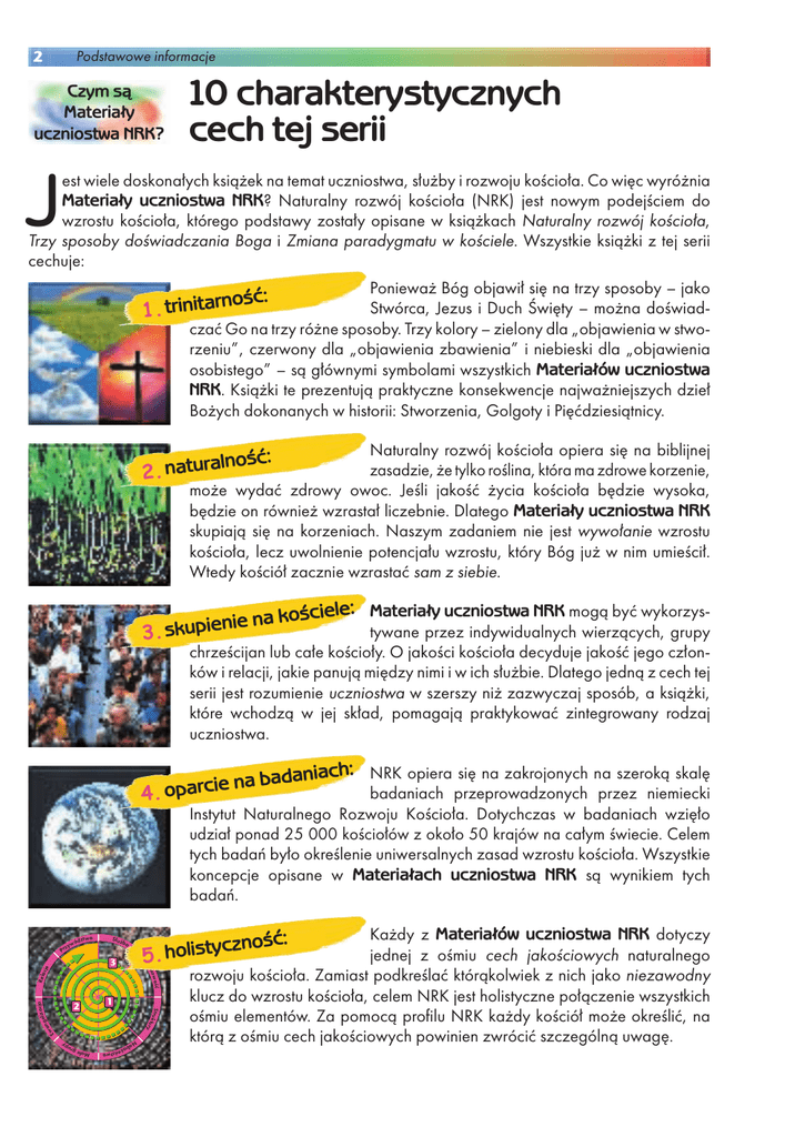 Podstawowe informacje 2 Czym są Materiały uczniostwa NRK? 10 charakterystycznych cech tej serii J est wiele doskonałych ksią ek na temat uczniostwa, słu by i rozwoju kościoła. Co więc wyró nia Materiały uczniostwa NRK? Naturalny rozwój kościoła (NRK) jest nowym podejściem do wzrostu kościoła, którego podstawy zostały opisane w ksią kach Naturalny rozwój kościoła, Trzy sposoby doświadczania Boga i Zmiana paradygmatu w kościele. Wszystkie ksią ki z tej serii cechuje: Poniewa Bóg objawił się na trzy sposoby – jako Stwórca, Jezus i Duch Święty – mo na doświadczać Go na trzy ró ne sposoby. Trzy kolory – zielony dla „objawienia w stworzeniu”, czerwony dla „objawienia zbawienia” i niebieski dla „objawienia osobistego” – są głównymi symbolami wszystkich Materiałów uczniostwa NRK. Ksią ki te prezentują praktyczne konsekwencje najwa niejszych dzieł Bo ych dokonanych w historii: Stworzenia, Golgoty i Pięćdziesiątnicy. : ość 1. trinitarn Naturalny rozwój kościoła opiera się na biblijnej zasadzie, e tylko roślina, która ma zdrowe korzenie, mo e wydać zdrowy owoc. Jeśli jakość ycia kościoła będzie wysoka, będzie on równie wzrastał liczebnie. Dlatego Materiały uczniostwa NRK skupiają się na korzeniach. Naszym zadaniem nie jest wywołanie wzrostu kościoła, lecz uwolnienie potencjału wzrostu, który Bóg ju w nim umieścił. Wtedy kościół zacznie wzrastać sam z siebie. lność: 2. natura nie na 3. skupie kościele: Materiały uczniostwa NRK mogą być wykorzys- tywane przez indywidualnych wierzących, grupy chrześcijan lub całe kościoły. O jakości kościoła decyduje jakość jego członków i relacji, jakie panują między nimi i w ich słu bie. Dlatego jedną z cech tej serii jest rozumienie uczniostwa w szerszy ni zazwyczaj sposób, a ksią ki, które wchodzą w jej skład, pomagają praktykować zintegrowany rodzaj uczniostwa. ch: NRK opiera się na zakrojonych na szeroką skalę na badania 4. oparcie badaniach przeprowadzonych przez niemiecki Instytut Naturalnego Rozwoju Kościoła. Dotychczas w badaniach wzięło udział ponad 25 000 kościołów z około 50 krajów na całym świecie. Celem tych badań było określenie uniwersalnych zasad wzrostu kościoła. Wszystkie koncepcje opisane w Materiałach uczniostwa NRK są wynikiem tych badań. wó zy Pr dztw o Słu ba 1 cje y a Ew ng e 2 Struk tur a lizacj o ść Rela w cho Du 3 Ka dy z Materiałów uczniostwa NRK dotyczy jednej z ośmiu cech jakościowych naturalnego rozwoju kościoła. Zamiast podkreślać którąkolwiek z nich jako niezawodny klucz do wzrostu kościoła, celem NRK jest holistyczne połączenie wszystkich ośmiu elementów. Za pomocą profilu NRK ka dy kościół mo e określić, na którą z ośmiu cech jakościowych powinien zwrócić szczególną uwagę. zność: c 5. holisty bo Na wa eńst Małe gru py Czym są Materiały uczniostwa NRK? 3 Materiały uczniostwa NRK unikają narzucania jakiegokolwiek modelu postępowania: „Zrób tak jak my, a twój kościół będzie wzrastał”. Starają się raczej rozwijać indywidualność, spontaniczność i kreatywność oraz podkreślają, e ka dy chrześcijanin jest wyjątkowy i posiada szczególne dary duchowe. To samo jest prawdą w przypadku kościołów. Celem NRK jest pielęgnowanie wyjątkowości, którą obdarzył nas Bóg. wność: 6. kreaty Idee NRK skupiły wokół siebie sieć krajowych partnerów w około 50 państwach. Dzięki temu mo liwy jest proces uczenia się o prawdziwie światowym zasięgu. Celem przedsięwzięcia nie było jednak powielanie rozwiązań uwarunkowanych kulturowo, lecz zebranie najbardziej pomocnych koncepcji ze wszystkich sześciu kontynentów i zaprezentowanie ich w sposób, który pozwoli wykorzystać je w innych krajach. Materiały uczniostwa NRK są dostępne w wielu językach. lność: 7. globa Wszystkie formy ycia, które stworzył Bóg, są pełne kolorów. Materiały uczniostwa NRK, pragnąc komunikować tę barwność, nie mogą być czarno-białe. Dlatego wszystkie ksią ki w tej serii są wielokolorowe. Poniewa jednak są wydawane w wielu wersjach językowych jednocześnie, ich cena nie odbiega od czarno-białych publikacji. ość: 8. barwn ść: Materiały uczniostwa NRK są biblijne, lecz nie mają charakteru „komentarzy biblijnych”. Biblia jest najwy szym autorytetem w naturalnym rozwoju kościoła. Wszystko, czego dowiadujemy się od innych kościołów, z badań lub z przyrody, jest oceniane w świetle zasad biblijnych. W ksią kach tej serii zawarliśmy jedynie te idee, które spełniają ten wymóg. Ich głównym celem jest ukazanie mo liwości stosowania Bo ego Słowa w codziennym yciu. 9. biblijno czność: Materiały uczniostwa NRK nie mają na celu zwiększania intelektualnej wiedzy, lecz starają się pomóc w jej praktycznym zastosowaniu. W ujęciu biblijnym prawda nie jest abstrakcyjną koncepcją, lecz czymś poznawalnym poprzez działanie. Ka dy rozdział ma pomóc w odkryciu praktycznych sposobów słu enia Bogu i budowania zdrowego, odpowiadającego na potrzeby i atrakcyjnego kościoła. 10. prakty MATERIAŁY U C Z N I O ST WA NRK Nowe podejście... ...nowe rezultaty