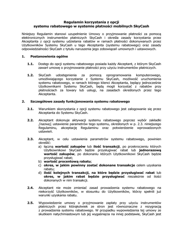 Regulamin korzystania z opcji systemu rabatowego w systemie płatności mobilnych SkyCash Niniejszy Regulamin stanowi uzupełnienie Umowy o przyjmowanie płatności za pomocą elektronicznych instrumentów płatniczych SkyCash i określa zasady korzystania przez Akceptanta z opcji systemu udzielania rabatów w ramach płatności dokonywanych przez Użytkowników Systemu SkyCash u tego Akceptanta (systemu rabatowego) oraz zasady odpowiedzialności SkyCash z tytułu naruszenia jego zobowiązań umownych i ustawowych. 1. 2. Postanowienia ogólne 1.1. Dostęp do opcji systemu rabatowego posiada każdy Akceptant, z którym SkyCash zawarł umowę o przyjmowanie płatności przy użyciu instrumentów płatniczych. 1.2. SkyCash udostępnienia za pomocą oprogramowania komputerowego, umożliwiającego korzystanie z Systemu SkyCash, możliwość uruchomienia systemu rabatowego, w ramach którego klienci Akceptanta, będący jednocześnie Użytkownikami Systemu SkyCash, będą mogli korzystać z rabatów przy płatnościach za towary lub usługi, na zasadach określonych przez tego Akceptanta. Szczegółowe zasady funkcjonowania systemu rabatowego 2.1. Warunkiem skorzystania z opcji systemu rabatowego jest zalogowanie się przez Akceptanta do Systemu SkyCash. 2.2. Akceptant dokonuje aktywacji systemu rabatowego poprzez wybór zakładki [nazwa], ustawienie parametrów tego systemu, określonych w p. 2.3. niniejszego Regulaminu, akceptację Regulaminu oraz potwierdzenie wprowadzonych ustawień. 2.3. Akceptant, w celu ustawienia parametrów systemu rabatowego, powinien określić: a) łączną wartość zakupów lub ilość transakcji, po przekroczeniu których Użytkownikowi SkyCash będzie przysługiwać rabat lub jednorazową wartość zakupów, po dokonaniu których Użytkownikowi SkyCash będzie przysługiwać rabat; b) wartość procentową rabatu; c) okres, w jakim powinny zostać dokonane transakcje celem uzyskania rabatu; d) ilość kolejnych transakcji, na które będzie przysługiwać rabat lub okres, w jakim rabat będzie przysługiwać niezależnie od ilości dokonanych w nim transakcji. 2.4. Akceptant nie może zmieniać zasad prowadzenia systemu rabatowego na niekorzyść Użytkowników, w stosunku do Użytkowników, którzy spełnili już warunki uzyskania rabatu. 2.5. Wypowiedzenie umowy o przyjmowanie zapłaty przy użyciu instrumentów płatniczych przez którąkolwiek ze stron jest równoznaczne z rezygnacją z prowadzenia systemu rabatowego. W przypadku wypowiedzenia tej umowy ze skutkiem natychmiastowym lub jej wygaśnięcia na innej podstawie, SkyCash jest uprawniony (lecz nie zobowiązany) do dokonania w imieniu Akceptanta wypowiedzenia systemu rabatowego w stosunku do Użytkowników SkyCash, którzy spełnili warunki uzyskania rabatu, ze skutkiem natychmiastowym. 2.6. 3. 4. Poprzez akceptację niniejszego Regulaminu Akceptant wyraża zgodę na powoływanie się przez SkyCash w jego działalności promocyjnej i marketingowej na współpracę z Akceptantem w ramach opcji systemu rabatowego oraz na korzystanie przez SkyCash w tym kontekście z nazwy i/lub ze znaku towarowego Akceptanta. SkyCash jest w szczególności uprawniony do wykorzystywania nazwy i znaku towarowego Akceptanta, poprzez publiczne wystawianie, wyświetlanie, odtwarzanie, publiczne udostępnianie w sposób umożliwiający każdemu dostęp w czasie i miejscu przez niego wybranym: a) we wszelkiego rodzaju materiałach promocyjnych i reklamowych, w tym drukowanych materiałach prasowych, materiałach POS, na reklamach świetlnych, w postaci materiałów outdoorowych, jak również materiałach reklamowych umieszczonych na opakowaniach produktów, b) we wszelkiego rodzaju prezentacjach, konferencjach prasowych, wydarzeniach wszelkiego typu, w punktach sprzedaży, c) poprzez wprowadzanie do pamięci dowolnej ilości komputerów, d) poprzez wprowadzanie i udostępnianie w sieciach teleinformatycznych, a w szczególności w sieci Internet, w tym na utworzonej w tym celu witrynie internetowej. Rozliczenie transakcji w systemie rabatowym 3.1. Pierwszą płatnością w systemie rabatowym jest pierwsza płatność dokonywana u danego Akceptanta przez Użytkownika Systemu SkyCash za pomocą instrumentu płatniczego SkyCash, następująca po spełnieniu przez Użytkownika Systemu SkyCash ustalonych przez tego Akceptanta warunków uzyskania rabatu. 3.2. Płatności dokonywane w systemie rabatowym są rozliczane w sposób określony w Regulaminie Użytkownika Systemu SkyCash i Umowie o przyjmowanie zapłaty przy użyciu instrumentów płatniczych, przy czym konto Użytkownika Systemu SkyCash dokonującego zakupów w systemie rabatowym, jest obciążane pełną kwotą płatności, bez rabatu. Po uznaniu tą kwotą konta Akceptanta, jest ono następnie obciążane kwotą rabatu przyznanego Użytkownikowi i dochodzi do jednoczesnego, powrotnego uznania kwotą rabatu konta Użytkownika Systemu SkyCash. 3.3. Jeżeli w przypadku naliczenia rabatu dochodzi do uzyskania kwot ułamkowych, kwota rabatu podlega zaokrągleniu z dokładnością do 1 grosza w dół. Odpowiedzialność cywilnoprawna 4.1. SkyCash ponosi odpowiedzialność w granicach i na zasadach przewidzianych w Regulaminie Użytkownika Systemu SkyCash i Umowie o przyjmowanie zapłaty przy użyciu instrumentów płatniczych, przy czym SkyCash nie ponosi odpowiedzialności za niewywiązanie się przez Akceptanta zobowiązań wobec Użytkowników Systemu SkyCash, dotyczących systemu rabatowego. 5. 6. Zmiana Regulaminu 5.1. SkyCash zastrzega sobie prawo do zmiany treści niniejszego Regulaminu. 5.2. Zmiana Regulaminu nie ma wpływu na prawa i obowiązki Akceptanta i Użytkownika SkyCash w ramach systemów rabatowych aktywowanych przed tą zmianą. Postępowanie reklamacyjne 6.1. 7. SkyCash rozpatruje reklamacje w zakresie i na zasadach ogólnych, określonych w Regulaminie Użytkownika Systemu SkyCash i Umowie o przyjmowanie zapłaty przy użyciu instrumentów płatniczych. 
