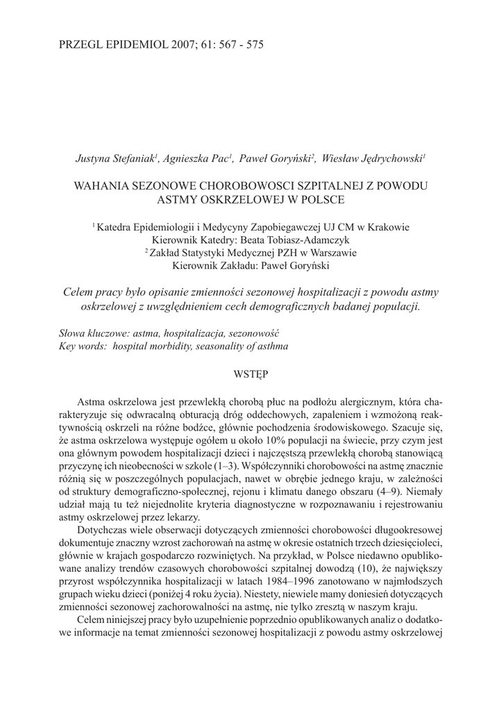PRZEGL EPIDEMIOL 2007; 61: 567 - 575 Justyna Stefaniak1, Agnieszka Pac1, Paweł Goryński2, Wiesław Jędrychowski1 WAHANIA SEZONOWE CHOROBOWOSCI SZPITALNEJ Z POWODU ASTMY OSKRZELOWEJ W POLSCE 1 Katedra Epidemiologii i Medycyny Zapobiegawczej UJ CM w Krakowie Kierownik Katedry: Beata Tobiasz-Adamczyk 2 Zakład Statystyki Medycznej PZH w Warszawie Kierownik Zakładu: Paweł Goryński Celem pracy było opisanie zmienności sezonowej hospitalizacji z powodu astmy oskrzelowej z uwzględnieniem cech demograficznych badanej populacji. Słowa kluczowe: astma, hospitalizacja, sezonowość Key words: hospital morbidity, seasonality of asthma WSTĘP Astma oskrzelowa jest przewlekłą chorobą płuc na podłożu alergicznym, która charakteryzuje się odwracalną obturacją dróg oddechowych, zapaleniem i wzmożoną reaktywnością oskrzeli na różne bodźce, głównie pochodzenia środowiskowego. Szacuje się, że astma oskrzelowa występuje ogółem u około 10% populacji na świecie, przy czym jest ona głównym powodem hospitalizacji dzieci i najczęstszą przewlekłą chorobą stanowiącą przyczynę ich nieobecności w szkole (1–3). Współczynniki chorobowości na astmę znacznie różnią się w poszczególnych populacjach, nawet w obrębie jednego kraju, w zależności od struktury demograficzno-społecznej, rejonu i klimatu danego obszaru (4–9). Niemały udział mają tu też niejednolite kryteria diagnostyczne w rozpoznawaniu i rejestrowaniu astmy oskrzelowej przez lekarzy. Dotychczas wiele obserwacji dotyczących zmienności chorobowości długookresowej dokumentuje znaczny wzrost zachorowań na astmę w okresie ostatnich trzech dziesięcioleci, głównie w krajach gospodarczo rozwiniętych. Na przykład, w Polsce niedawno opublikowane analizy trendów czasowych chorobowości szpitalnej dowodzą (10), że największy przyrost współczynnika hospitalizacji w latach 1984–1996 zanotowano w najmłodszych grupach wieku dzieci (poniżej 4 roku życia). Niestety, niewiele mamy doniesień dotyczących zmienności sezonowej zachorowalności na astmę, nie tylko zresztą w naszym kraju. Celem niniejszej pracy było uzupełnienie poprzednio opublikowanych analiz o dodatkowe informacje na temat zmienności sezonowej hospitalizacji z powodu astmy oskrzelowej 568 J Stefaniak, A Pac i in. Nr 3 w Polsce. Informacje te wzbogacają naszą wiedzę na temat epidemiologii astmy oraz są użyteczne, między innymi w programowaniu polityki zdrowia publicznego. MATERIAŁ I METODY Źródłem danych dla przeprowadzonej analizy były informacje uzyskane z Państwowego Zakładu Higieny w Warszawie, pochodzące z projektu „Hospitalizacja” – Ogólnopolskie Badanie Chorobowości Szpitalnej Ogólnej (OBCHSO) realizowanego w ramach Programu Badań Statystycznych Statystyki Publicznej GUS. Podstawowym źródłem informacji w badaniu OBCHSO jest karta statystyczna szpitalna Mz/Szp-11, która jest wypełniana dla każdego pacjenta. Od 2002 r. wprowadzono zasadę comiesięcznego przekazywania danych do centralnego rejestru. W roku 2003 ten obowiązek spełniło 728 z 860 placówek. Zbiór danych chorobowości szpitalnej z powodu astmy z roku 2003 obejmował ogółem 32 933 rekordy (522 szpitale), z rozpoznaniem zasadniczym dychawicy oskrzelowej (ICD10 – J45.*) lub stanu astmatycznego (ICD10 – J46). Na podstawie wstępnego opisu zebranego materiału, z dalszej analizy wykluczono 3 949 przypadków pochodzących z 19 placówek takich jak: sanatoria, uzdrowiska, szpitale rehabilitacyjne, hospicja oraz zakłady opieki długoterminowej. Z uwagi na niekompletność danych z poszczególnych jednostek postanowiono przeprowadzić analizę na danych surowych, bez obliczenia współczynników chorobowości szpitalnej i ich standaryzacji. W tabeli I przedstawiono charakterystykę całego materiału oraz podzbioru danych będącego przedmiotem analizy. Statystycznie istotne różnice pomiędzy grupami oznaczono gwiazdką. W analizie zmienności sezonowej astmy uwzględniono liczbę hospitalizacji na jednostkę czasu (dzień, tydzień, miesiąc), ale w końcowym zestawieniu zaprezentowano tylko analizę sezonowości, opartą na średniej miesięcznej liczbie hospitalizacji. W trakcie wstępnych obliczeń zastosowano testy istotności różnic pomiędzy średnimi oraz proporcjami. Zmienność sezonową modelowano nieparametryczną funkcją wygładzającą LOESS smoother. Dopasowanie modelu testowano w oparciu o analizę reszt wykorzystując Akaike Information Criteria (11). Różnicę w przebiegu krzywych opisujących sezonową zmienność hospitalizacji testowano w oparciu o wyniki dwuczynnikowej analizy wariancji (ANOVA), w której zmiennymi niezależnymi były miesiąc oraz: wiek, płeć, tryb przyjęcia do szpitala, oraz interakcja między wymienionymi zmiennymi. Model sezonowości uznano za podobny w analizowanych grupach, jeżeli interakcja w badanym modelu nie była statystycznie istotna. W kolejnym etapie analizy średnie miesięczne podzielono na trzy rozłączne klasy. Punkty rozgraniczające klasy określono następująco: G1= min xi ∈I + 13 ⋅ rozstep oraz G2= max − 13 ⋅ rozstep , gdzie I odnosi się do podziału xi ∈I roku na miesiące (I=1, 2, ..., 12), natomiast xi jest wyliczoną dla danej grupy wartością średniej dla i - tego miesiąca. Miesiące, dla których średnie były większe od G2, określono jako „wysokie”, te dla których średnie były mniejsze od G1, jako „niskie. Pozostałe miesiące oznaczono jako „średnie”. Dalsza analiza polegała na ocenie błędu klasyfikacji, co lepiej przedstawia różnice pomiędzy grupami. Dla ustalenia istotności różnic przyjęto jednolicie poziom istotności α=0,05. Opracowanie statystyczne wykonano przy użyciu programu SAS. Nr 3 Chorobowość szpitalna z powodu astmy 569 WYNIKI W kartach szpitalnych u ponad 20% pacjentów nie określono dokładnie choroby zasadniczej według ICD-10 (zapis J45). W badanym materiale zaobserwowano więks