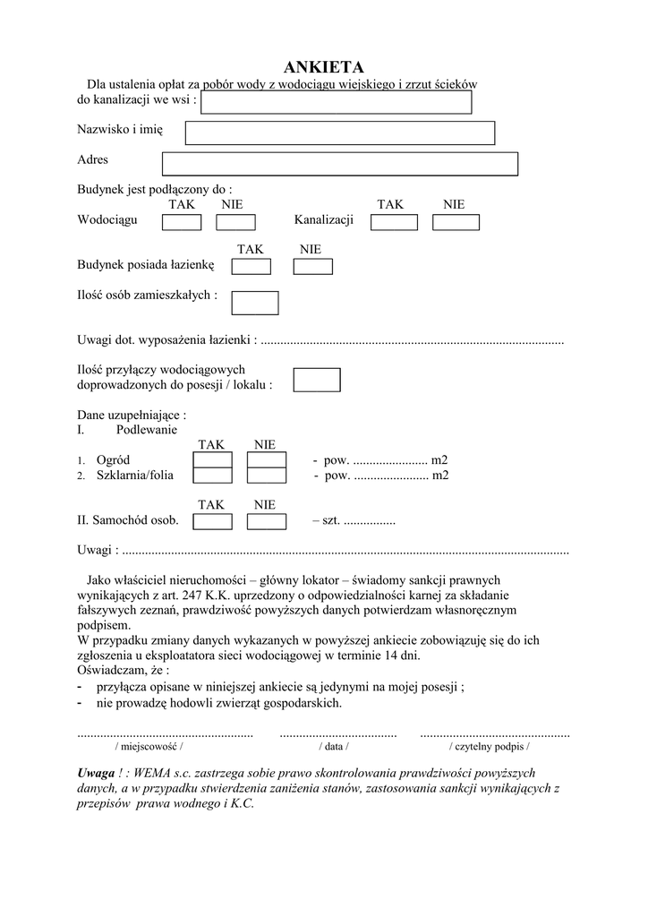 ANKIETA Dla ustalenia opłat za pobór wody z wodociągu wiejskiego i zrzut ścieków do kanalizacji we wsi : Nazwisko i imię Adres Budynek jest podłączony do : TAK NIE Wodociągu TAK NIE Kanalizacji TAK NIE Budynek posiada łazienkę Ilość osób zamieszkałych : Uwagi dot. wyposażenia łazienki : ............................................................................................. Ilość przyłączy wodociągowych doprowadzonych do posesji / lokalu : Dane uzupełniające : I. Podlewanie TAK 1. 2. NIE Ogród Szklarnia/folia - pow. ....................... m2 - pow. ....................... m2 TAK II. Samochód osob. NIE – szt. ................ Uwagi : ......................................................................................................................................... Jako właściciel nieruchomości – główny lokator – świadomy sankcji prawnych wynikających z art. 247 K.K. uprzedzony o odpowiedzialności karnej za składanie fałszywych zeznań, prawdziwość powyższych danych potwierdzam własnoręcznym podpisem. W przypadku zmiany danych wykazanych w powyższej ankiecie zobowiązuję się do ich zgłoszenia u eksploatatora sieci wodociągowej w terminie 14 dni. Oświadczam, że : - przyłącza opisane w niniejszej ankiecie są jedynymi na mojej posesji ; - nie prowadzę hodowli zwierząt gospodarskich. ...................................................... / miejscowość / .................................... / data / .............................................. / czytelny podpis / Uwaga ! : WEMA s.c. zastrzega sobie prawo skontrolowania prawdziwości powyższych danych, a w przypadku stwierdzenia zaniżenia stanów, zastosowania sankcji wynikających z przepisów prawa wodnego i K.C.