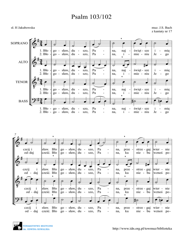 Psalm 103/102 sł. H Jakubowska ° #3 SOPRANO & 4 œ ˙ œ ˙ 1. Bło - go - sław, du 2. Bło - go - sław, du - ALTO #3 & 4œ ˙ TENOR œ ˙ - sław, du 2. Bło - go - sław, du - ? #3 œ BASS ¢ 4 ˙ œ ˙ 1. Bło - go - sław, du 2. Bło - go - sław, du - ° # & œ ˙ , ˙ œ ˙ 7 # czcij i od - daj & ˙ sław. Bło cześć. Bło œ ˙ czcij i od - daj , œ ˙ sław. Bło cześć. Bło - na, na, szo, szo, Pa Pa - œ ˙ szo, szo, Pa Pa - szo, szo, Pa Pa - , œœ ˙ , œ œ ˙ i - mię Je - go œ œ ˙ œ i - mię Je - go na, na, naj - święt - sze i - mie - niu , œ i - mię Je - go na, na, naj - święt - sze i - mie - niu i - mię Je - go ˙ - ˙ œ #œ ˙ naj - święt - sze i - mie - niu œ œ œ œ ˙ Pa Pa œ œ œ ˙ naj - święt - sze i - mie - niu na, na, ˙ œ œ œ na, na, , #˙ œ œ œ nœ œ œ œ œ ˙ œ prze - strze - gaj wier - nie ku nie - bu wznoś po - , œ œ œ œ œ œ œ ˙ œœ ˙ #œ ˙ œ ˙ œ ˙ œ go - sław, du - szo, go - sław, du - szo, , #œ œ œ ˙ œ ˙ œ ˙ & ‹ czcij i sław. Bło go - sław, du od - daj cześć. Bło go - sław, du , œ ˙ ?# œ œ œ œ ˙ ¢ ˙ czcij i od - daj Pa Pa go - sław, du - szo, go - sław, du - szo, œ ˙ sław. Bło cześć. Bło szo, szo, ˙ œ œ œ œ œ œ œ ˙ 1. Bło - go - sław, du 2. Bło - go - sław, du - #3 & 4œ ˙ ‹ 1. Bło - go ˙ œ œ , muz. J.S. Bach z kantaty nr 17 Pa Pa œ ˙ - na, na, prze - strze - gaj wier - nie ku nie - bu wznoś po - , œ ˙ œ - szo, - szo, Pa Pa - na, na, prze - strze - gaj wier - nie ku nie - bu wznoś po - go - sław, du - szo, go - sław, du - szo, Pa Pa - na, na, prze - strze - gaj wier - nie ku nie - bu wznoś po - , œ #˙ œ œ œ œ ˙ œ œ nœ œ http://www.idn.org.pl/towmuz/biblioteka ° # & œ ˙ 2 , ˙ œ œ œ œ ˙ 15 Bo - żych chwal - ną # & ˙ praw. To pieśń. Bo œ ˙ , On jak œ œ ˙ od - pusz - cza wy - so - ko wi nie œ œ œ ˙ œ œ œ œ Bo - żych praw. To chwal - ną pieśń. Bo On jak od - pusz - cza wy - so - ko wi nie Bo chwal On jak od - pusz - cza wy - so - ko wi nie - , ˙ œ œ œ œ œ ˙ ny, bo prze - ba - cza ludz - kie nad na - szą zie - mią , #œ ˙ œ ˙ œ ˙ #œ - ny, bo prze - ba - cza ludz - kie nad na - szą zie - mią - ny, bo prze - ba - cza ludz - kie nad na - szą zie - mią , , #œ œ œ œ œ œ # œ ˙ œ ˙ œ œ œ ˙ œ œ œ œ ˙ œœ & ‹ Bo żych praw. To On od - pusz - cza wi - ny, prze - ba - cza ludz - kie chwal - ną pieśń. Bo jak wy - so - ko nie bo nad na - szą zie - mią , , œ ?# œ œ #œ œ ˙ #œ ˙ nœ œ œ œ œ ˙ œ ˙ œ œ ¢ œ œ ° # & ˙ żych praw. To ną pieśń. Bo 23 œ ˙ czy - ny wzno - si & # ˙ œ ˙ & ˙ ‹ czy œ ˙ czy - ny wzno - si # ¢ złe, się - ny wzno - si ?# ˙ złe, się złe, się , œ ˙ cho - ro i jak , by le od - le œ œ œ œ ˙ cho - ro i jak , j œ œ™ œ œ ˙ œ ˙ cho - ro i jak , by le od - le złe, się cho - ro i jak œ ˙™ by le od - le - by le od - le czy, gły nœ ˙ - œ œ œ ˙ œ œ œ œ czy - ny wzno - si - - czy, gły ˙ czy, gły œ ˙ czy, gły œ ˙ od zgu jest wschód œ ˙ od zgu jest wschód œ ˙ œ œ œ by od chro krań by od by od œ œnœ œ od zgu jest wschód - ni ca œ œ nœ#œ œ œ œ od zgu jest wschód œ œ œ by od chro krań - ni ca chro krań - ni ca chro krań - ni ca œ œœœ #œ œ œnœ œ http://www.idn.org.pl/towmuz/biblioteka ° # & ˙ 30 & # # œ ¢ #˙ œ ˙™ œ ˙ , ˙ , œ œ ˙ œ œ œ nœ ˙ , œ œ œ œ œ nœ ˙™ ży - cie twe, swą wie - czną ła za - chod - nie - go, tak jest wiel ° # & ˙ , œ ˙ # ˙ œ œ cię, dla - te - go Je - go, za - tem , & œ #œ œ #˙ # chwal, chwal, , œ œ œ œ œ ˙ dla - te - go Je - go, za - tem ?# ˙ , œ ˙ ˙ chwal, chwal, œ ˙ cię, dla - te - go Je - go, za - tem chwal, chwal, - - ską ka, ską ka, ˙ - ską ka, œ ˙ œ œ œ œ œ ˙ i tak œ da - rzy łas - ka œ ˙ #œ ˙ œ œ ˙ œ œ œ œ ˙ œ œ #˙ œ œ i tak i tak i tak zmi - ło - wa hoj - na dla niem da - rzy nas łas - ka zmi - ło - wa - niem da - rzy hoj - na dla nas łas - ka œ ˙ zmi - ło - wa - niem hoj - na dla nas œ œ œœœœ œ ˙ Pa Pa - œ œ œ œ œ ˙ du - szo mo - ja, du - szo mo - ja, ˙ zmi - ło - wa - niem hoj - na dla nas ˙ œ ˙ du - szo mo - ja, du - szo mo - ja, j œ ˙ ™ œ œ œ dla - te - go chwal, cię, Je - go, za - tem chwal, & ˙ ‹ cię, ską ka, nœ nœ œ œ ˙ twe, swą wie - czną ła za - chod - nie - go, tak jest wiel ˙ - ˙ œ ˙ ży - cie twe, swą wie - czną ła za - chod - nie - go, tak jest wiel 38 ¢ œ ˙ ży - cie twe, swą wie - czną ła za - chod - nie - go, tak jest wiel & ˙ #œ ‹ ży - cie ?# ˙ , 3 Pa Pa - Pa Pa - œ œ œ œ œœœ œ du - szo mo - ja, du - szo mo - ja, œ œ œ #œ ˙ #œ œ œ œ du - szo mo - ja, du - szo mo - ja, Pa Pa - ˙ da - rzy łas - ka ˙ - na. na. œ ˙ ˙ ˙ - - ˙™ - na. na. œ ˙ na. na. ˙ na. na. http://www.idn.org.pl/towmuz/biblioteka