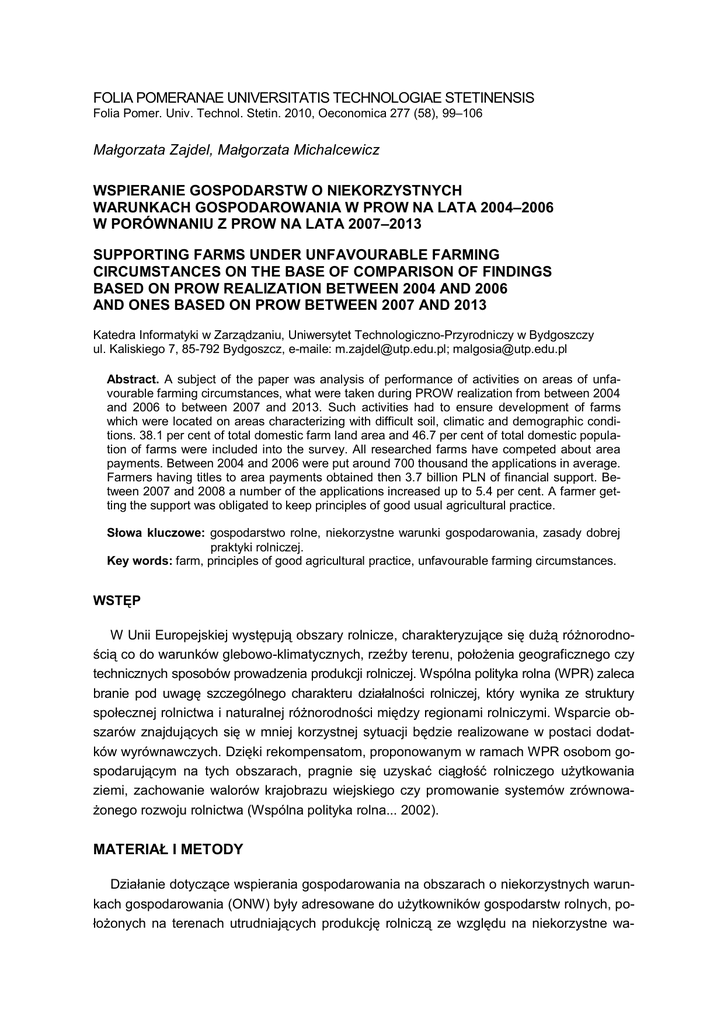 FOLIA POMERANAE UNIVERSITATIS TECHNOLOGIAE STETINENSIS Folia Pomer. Univ. Technol. Stetin. 2010, Oeconomica 277 (58), 99–106 Małgorzata Zajdel, Małgorzata Michalcewicz WSPIERANIE GOSPODARSTW O NIEKORZYSTNYCH WARUNKACH GOSPODAROWANIA W PROW NA LATA 2004–2006 W PORÓWNANIU Z PROW NA LATA 2007–2013 SUPPORTING FARMS UNDER UNFAVOURABLE FARMING CIRCUMSTANCES ON THE BASE OF COMPARISON OF FINDINGS BASED ON PROW REALIZATION BETWEEN 2004 AND 2006 AND ONES BASED ON PROW BETWEEN 2007 AND 2013 Katedra Informatyki w Zarządzaniu, Uniwersytet Technologiczno-Przyrodniczy w Bydgoszczy ul. Kaliskiego 7, 85-792 Bydgoszcz, e-maile: [email protected]; [email protected] Abstract. A subject of the paper was analysis of performance of activities on areas of unfavourable farming circumstances, what were taken during PROW realization from between 2004 and 2006 to between 2007 and 2013. Such activities had to ensure development of farms which were located on areas characterizing with difficult soil, climatic and demographic conditions. 38.1 per cent of total domestic farm land area and 46.7 per cent of total domestic population of farms were included into the survey. All researched farms have competed about area payments. Between 2004 and 2006 were put around 700 thousand the applications in average. Farmers having titles to area payments obtained then 3.7 billion PLN of financial support. Between 2007 and 2008 a number of the applications increased up to 5.4 per cent. A farmer getting the support was obligated to keep principles of good usual agricultural practice. Słowa kluczowe: gospodarstwo rolne, niekorzystne warunki gospodarowania, zasady dobrej praktyki rolniczej. Key words: farm, principles of good agricultural practice, unfavourable farming circumstances. WSTĘP W Unii Europejskiej występują obszary rolnicze, charakteryzujące się dużą różnorodnością co do warunków glebowo-klimatycznych, rzeźby terenu, położenia geograficznego czy technicznych sposobów prowadzenia produkcji rolniczej. Wspólna polityka rolna (WPR) zaleca branie pod uwagę szczególnego charakteru działalności rolniczej, który wynika ze struktury społecznej rolnictwa i naturalnej różnorodności między regionami rolniczymi. Wsparcie obszarów znajdujących się w mniej korzystnej sytuacji będzie realizowane w postaci dodatków wyrównawczych. Dzięki rekompensatom, proponowanym w ramach WPR osobom gospodarującym na tych obszarach, pragnie się uzyskać ciągłość rolniczego użytkowania ziemi, zachowanie walorów krajobrazu wiejskiego czy promowanie systemów zrównoważonego rozwoju rolnictwa (Wspólna polityka rolna... 2002). MATERIAŁ I METODY Działanie dotyczące wspierania gospodarowania na obszarach o niekorzystnych warunkach gospodarowania (ONW) były adresowane do użytkowników gospodarstw rolnych, położonych na terenach utrudniających produkcję rolniczą ze względu na niekorzystne wa- 100 M. Zajdel, M. Michalcewicz runki naturalne. Dopłaty wyrównawcze dla użytkowników gospodarstw rolnych położonych na ONW miały im zrekompensować trudniejsze, w porównaniu z gospodarstwami położonymi poza strefami ONW, warunki gospodarowania. Dopłaty miały też przeciwdziałać wyludnieniu obszarów wiejskich i zatracaniu ich rolniczego charakteru. Płatność była związana z przestrzeganiem mierzalnych standardów dotyczących ochrony środowiska w zakresie produkcji rolniczej, zwanych także zwykłą dobrą praktyką rolniczą. Wpieranie gospodarstw rolnych znajdujących się na obszarach o niekorzystnych warunkach gospodarowania założono zarówno w Planie rozwoju obszarów wiejskich na lata 2004–2006 (PROW na lata 2004–2006), jak również w Programie rozwoju obszarów wiejskich na lata 2007–2013 (PROW na lata 2007–2013). Świadczy to o ciągłości działań podejmowanych w ramach WPR w tak ważnej dziedzinie, jaką jest dawanie szans rozwoju gospodarstwom rolnym, niezależnie od ich położenia i warunków gospodarowania. Celem opracowania jest wskazanie różnic i podobieństw między działaniami, założonymi w obu programach rozwoju obszarów wiejskich i aktach wykonawczych do tych programów. W warstwie faktograficznej opierano się na danych zawartych w Systemie Informacji... (2004–2006). WYNIKI I DYSKUSJA Porównanie wsparcia ONW w PROW na lata 2004–2006 z PROW na lata 2007–2013 Podstawą prawną do przyjęcia PROW na lata 2004–2006 była Ustawa sejmowa z 2003 roku o wspieraniu rozwoju obszarów wiejskich ze środków pochodzących z Sekcji Gwarancji Europejskiego Funduszu Orientacji i Gwarancji Rolnej. Ustawa ta opierała się na Rozporządzeniu Rady (WE) nr 1257/1999 z dnia 17 maja 1999 roku, określającym wysokość wsparcia przeznaczonego na poszczególne działania. Polska ustawa określała zadania oraz właściwości jednostek organizacyjnych i organów w kwestii między innymi wspierania działalności gospodarstw rolnych na obszarach o niekorzystnych warunkach gospodarowania. Z kolei podstawą prawną PROW na lata 2007–2008 była Ustawa z 2007 roku o wspieranie rozwoju obszarów wiejskich z udziałem środków Europejskiego Funduszu Rolnego na rzecz Rozwoju Obszarów Wiejskich. Ustawa opierała się z kolei na Rozporządzeniu Rady (WE) nr 1698/2005 z dnia 20 września 2005 roku, określającym kryteria i wysokość przyznawania pomocy finansowej. Obie ustawy różniły się rodzajem funduszy i ogólną wysokością wsparcia przypadającego na poszczególne działania, określanego przez Wspólnotę Europejską. Podstawowym priorytetem działań dotyczących ONW w obu PROW jest wyrównywanie szans rozwoju gospodarstw rolnych. Opisy działań były podobne: najpierw bowiem podano podstawy prawne, następnie określono cel działania wraz z opisem obejmującym charakterystykę beneficjenta, formy i poziom pomocy. W końcu określono wysokość budżetu. Celem działania było zapewnienie ciągłości rolniczego użytkowania ziemi, promocja rolnictwa przyjaz