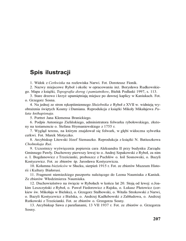 Spis ilustracji 1. Widok z Cerkwiska na rozlewiska Narwi. Fot. Doroteusz Fionik. 2. Nazwy miejscowe Ryboł i okolic w opracowaniu inż. Borysława Rudkowskiego. Mapa z książki, Topografia dorog i pamiatnikow, Bielsk Podlaski 1997, s. 113. 3. Stare drzewo i krzyż upamiętniają miejsce po dawnej kaplicy w Kaniukach. Fot. o. Grzegorz Sosna. 4. Na jednej ze stron rękopiśmiennego Służebnika z Ryboł z XVII w. widnieją wyobrażenia świętych Kosmy i Damiana. Reprodukcja z książki Mikoły Mikałajewa Pałata knihapisnaja. 5. Portret Jana Klemensa Branickiego. 6. Podpis Antoniego Zielińskiego, administratora folwarku rybołowskiego, złożony na testamencie o. Stefana Hrymaniewskiego z 1755 r. 7. Wygląd terenu, na którym znajdował się folwark, w głębi widoczna sylwetka cerkwi. Fot. Marek Motyczko. 8. Arcybiskup Litewski Józef Siemaszko. Reprodukcja z książki N. Batiuszkowa Chołmskaja Ruś. 9. Uczestnicy wyświęcenia popiersia cara Aleksandra II przy budynku Zarządu Gminnego Pawły. Duchowny pierwszy lewej to o. Andrej Szpakowski z Ryboł, za nim o. I. Bogdanowicz z Trześcianki, proboszcz z Puchłów o. Ioil Sosnowski, o. Bazyli Kostycewicz. Fot. ze zbiorów śp. Jarosława Kostycewicza. 10. Kolumna bieżeńców w Słucku, sierpień 1915 r. Fot. ze zbiorów Muzeum Historii i Kultury Białorusi. 11. Fragment niemieckiego paszportu należącego do Leona Naumiuka z Kaniuk. Ze zbiorów Włodzimierza Naumiuka. 12. Duchowieństwo na święcie w Rybołach w końcu lat 20. Stoją od lewej: o.Joakim Leszczyński z Ryboł, o. Paweł Fiedorowicz z Rajska, o. Łukasz Plutowicz (cerkiew św. Mikołaja w Bielsku), o. Grzegorz Stalbowski, o. Witalis Strokowski z Narwi, o. Bazyli Kostycewicz z Bielska, o. Andrzej Kadłubowski z Zabłudowa, o. Andrzej Rutkowski z Trześcianki. Fot. ze zbiorów o. Grzegorza Sosny. 13. Arcybiskup Sawa z parafianami, 13 VII 1937 r. Fot. ze zbiorów o. Grzegorza Sosny. 207 14. Kler parafialny, chór cerkiewny oraz goście w czasie święta Położenija Ryzy (Margoraty) 15 lipca 1937 r. Siedzą od lewej: Nina Szpilewska, Mikołaj Sosnowski — pierwszy psalmista, Halina Sosnowska, diakon NN, Tatiana Gołubowska, o. Mikołaj Krukowski, Olga Aleksiejuk, o. Witalis Strokowski, Walentyna Borowska, o. Anatol Kasperski, Aleksandra Martyniuk, Teodozja Andrejuk, Maria Opalińska. Stoją od lewej: Maria Andrejuk, Irena Lewczuk, Luba Szwajko, Dominika Bonifatiuk, Grzegorz Stepaniuk ( starosta ), Helena Repnicka, Teodozja Ostapczuk, Anastazja Antosiuk, Anastazja Szwajko, Michał Całpiński, Teodor Szwajko, Piotr Romaniuk, Arseniusz Nieswiedow (drugi psalmista), Oksencjusz Omelaniuk, Jan Daniłowicz, Wiktor Sulima, Olga Krochacz, Sawa Sosnowski. Zbiory prywatne. 15, 16. Unikatowe zdjęcia z uroczystości poświęcenia krzyża we wsi Ploski, w intencji zakończenia wojny. Z parafianami o. Mikołaj Krukowski. Lato 1943 r. Fot. śp. Ludmiła Jermakowicz. 17. Wiosenne porządki wokół szkoły w Rybołach w 1946 r. Ze zbiorów Leona Fiedoruka z Ryboł. 18. Uczniowie starszych klas z ojcem Mikołajem Krukowskim, luty 1946 r. Ze zbiorów parafialnych. 19. Uczniowie szkoły w Kaniukach z dyrektorem Michałem Matwiejukiem. Zdjęcie z Kroniki szkoły w Kaniukach. 20. Fragment Kombinatu Agro-Drób z lotu ptaka. Fot. Wiktor Wołkow 21. Podopieczni punktu katechetycznego w Wojszkach w 1988 r. Ze zbiorów o. Grzegorza Sosny 22. Podopieczni punktu katechetycznego w Pawłach w 1989 r. Ze zbiorów o. Grzegorza Sosny. 23. Nauczyciele i uczniowie Szkoły Podstawowej w Rybołach po nabożeństwie w Dniu Edukacji Narodowej w 1990 r. Zbiory o. Grzegorza Sosny. 24. Chór parafialny w 1998 r. Pierwszy z lewej ówczesny dyrygent Jan Burnos. Ze zbiorów o. Grzegorza Sosny. 25. Kler i goście święta parafialnego Położenija Ryzy 15 lipca 1998 r., w centrum metropolita Sawa. Ze zbiorów o. Grzeogorza Sosny 26. Grupa pielgrzymów z Siemiatycz na święto Supraskiej Ikony MB w 1992 r. Ze zbiorów o. Grzegorza Sosny. 27. Święcenie paschy w Wojszkach w 1994 r. Fot. Marek Dolecki. 28. Dożynki parafialne w 1997 r.. 29. Grupa pielgrzymów z Bielska Podlaskiego na święto męczennika Gawryiła Zabłudowskiego w 1998 r. Pierwszy z prawej współautor książki D. Fionik. 30. Wielopokoleniowa rodzina o. Grzegorza Sosny i matuszki Antoniny. 31. Poświęcenie krzyży koło kombinatu. 32. Najstarsza z zachowanych ikon św.św. Kosmy i Damiana. 33. Cudowna ikona Bogurodzicy z Ryboł bez ryzy. 34. XVIII-wieczna Matka Boża Pokrowy z charakterystycznymi postaciami z epoki. 35. Plan cerkwi parafialnej w Rybołach w opracowaniu inż Borysława Rudkowskiego 208 36. Widok ogólny cerkwi parafialnej z lotu ptaka. Fot. Wiktor Wołkow. 37, 38. Obecny wygląd cerkwi od strony zachodniej i południowej. Zbiory parafialne. 39. Kler parafialny i chór cerkiewny. Siedzą od lewej: Grzegorz Stepaniuk ( Starosta ), Nina Krukowska, matuszka Ludmiła Krukowska, o. Symeon Cybruk, arcybiskup Sawa, o. Mikołaj Krukowski, psalmista Mikołaj Sosnowski, psalmista Arseniusz Nieswiedow. Stoją od lewej: Anastazja Szwajko, Maria Supruniuk, Teodor Szwajko, Maria Andrejuk, Teodozja Andrejuk, Michał Całpiński, Aleksandra Martyniuk, Paweł Osipiuk, Dominika Bonifaciuk, Anastazja Antosiuk, Antoni Supruniuk, Nina Szpilewska, Jerzy Nikołajuk, Walentyna Borowska, Ignacy Charytoniuk, Piotr Romaniuk, Aleksy Krasowski — stróż cerkiewny, Jan Daniłowicz. Zbiory parafialne. 40. Wnętrze cerkwi parafialnej. Fot. Wiktor Wołkow. 41. Kiot wykonany w 1994 r. przez Igora Neczaja z Poczajowa 42. Siedemnastowieczna ikona św. Jerzego. 43. Oryginalny projekt cerkwi cmentarnej. Zbiory parafialne. 44. Obecny wygląd cerkwi św. Jerzego. Fot. o. Grzegorza Sosny. 45. Naprawa muru cmentarnego w 1990 r. Ze zbiorów o. Grzegorza Sosny. 46, 47. Uroczystości przy kaplicy na Petraszkach w Niedzielę o Samarytance. Zbiory parafialne. 48. Kapliczka-studnia w zimowej oprawie. Fot. o. Grzegorza Sosny. 49. Widok na cerkiew św. Jana Teologa i wzgórze cmen