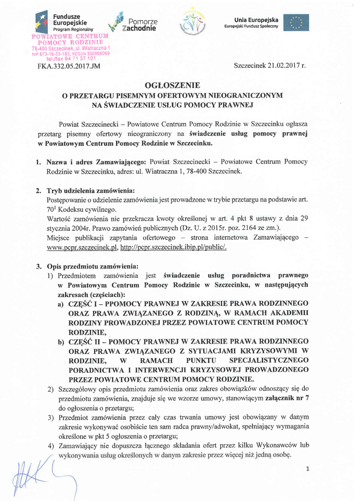przetarg pisemny ofertowy nieograniczony na Swiadczenie uslug pomocy prawnej