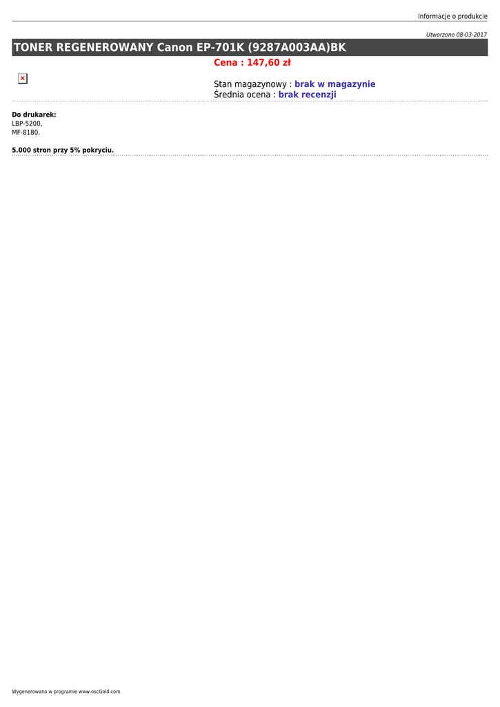 Informacje o produkcie Utworzono 08-03-2017 TONER REGENEROWANY Canon EP-701K (9287A003AA)BK Cena : 147,60 zł Stan magazynowy : brak w magazynie Średnia ocena : brak recenzji Do drukarek: LBP-5200, MF-8180. 5.000 stron przy 5% pokryciu. Wygenerowano w programie www.oscGold.com