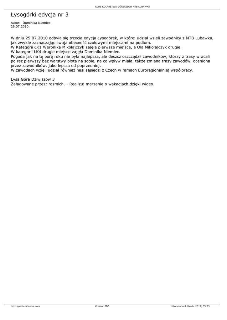 KLUB KOLARSTWA GÓRSKIEGO MTB LUBAWKA Łysogórki edycja nr 3 Autor: Dominika Niemiec 26.07.2010. W dniu 25.07.2010 odbyła się trzecia edycja Łysogórek, w której udział wzięli zawodnicy z MTB Lubawka, jak zwykle zaznaczając swoja obecność czołowymi miejscami na podium. W Kategorii ŁK1 Weronika Mikołajczyk zajęła pierwsze miejsce, a Ola Mikołajczyk drugie. W kategorii ŁK4 drugie miejsce zajęła Dominika Niemiec. Pogoda jak na tę porę roku nie była najlepsza, ale deszcz oszczędził zawodników, którzy z trasy wracali po raz pierwszy bez warstwy błota na sobie, na co wpływ miała, także zmiana trasy zawodów, oceniona przez zawodników, jako lepsza od poprzedniej. W zawodach wzięli udział również nasi sąsiedzi z Czech w ramach Euroregionalniej współpracy. Łysa Góra Dziwiszów 3 Załadowane przez: razmich. - Realizuj marzenie o wakacjach dzięki wideo. http://mtb-lubawka.com Kreator PDF Utworzono 8 March, 2017, 05:33