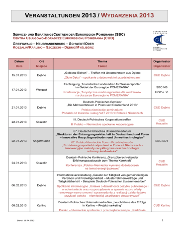 VERANSTALTUNGEN 2013 / WYDARZENIA 2013 SERVICE- UND BERATUNGSCENTREN DER EUROREGION POMERANIA (SBC) CENTRA USŁUGOWO-DORADCZE EUROREGIONU POMERANIA (CUD) GREIFSWALD – NEUBRANDENBURG – SCHWEDT/ODER KOSZALIN/KARLINO – SZCZECIN – DĘBNO/MYŚLIBÓRZ Datum Ort Thema Organisator Data Miejsce Temat Organizator 15.01.2013 Dębno 17.01.2013 Wolgast 21.01.2013 Dębno 22.01.2013 Koszalin „Goldene Eichen” – Treffen mit Unternehmern aus Dębno „Złote Dęby” - spotkanie z dębnowskimi przedsiębiorcami Fachtagung „Touristische Landmarken für Wassersportler im Gebiet der Euroregion POMERANIA“ Konferencja „Turystyczne marki regionalne dla wodniaków na obszarze Euroregionu POMERANIA“ Deutsch-Polnisches Seminar „Die Mehrwertsteuer in Polen und Deutschland 2013“ Polsko-niemieckie seminarium: Podatek od towarów i usług VAT 2013 w Polsce i Niemczech III. Deutsch-Polnisches Kooperationstreffen III Polsko – Niemieckie spotkanie kooperacyjne CUD Dębno SBC NB HOP e. V. CUD Dębno CUD Koszalin 67. Deutsch-Polnisches Unternehmerforum „Strukturen der Entsorgungswirtschaft in Deutschland und Polen – Innovative Recyclingmethoden und Umwelttechnologien“ 22.01.2013 Angermünde 24.01.2013 Koszalin 67. Polsko-Niemieckie Forum Przedsiębiorców „Struktura gospodarki odpadami w Polsce i Niemczech innowacyjne metody recyklingowe oraz technologie ochrony środowiska” Deutsch-Polnische Konferenz „Grenzüberschreitender Erfahrungsaustausch zum Thema Kernkraft“ Konferencja „Polsko-Niemiecka wymiana doświadczeń na temat energii jądrowej” SBC SDT CUD Koszalin Informationsveranstaltung „Gesetz zur Tätigkeit von gemeinnützigen Vereinen und Freiwilligenarbeit – Musterrahmenverträge und Tätigkeitsbericht - Beispiele Deutsch-Polnischer Zusammenarbeit“ 06.02.2013 Dębno 08.02.2013 Karlino Spotkanie informacyjne „Ustawa o działalności pożytku publicznego i o wolontariacie oraz rozporządzenie w sprawie wzoru oferty, ramowego wzoru umowy i sprawozdania z realizacj dzialania jako przykład polsko – niemieckiej współpracy stowarzyszeń” Deutsch-Polnisches Unternehmertreffen „Leuchttürme des Erfolgs in Karlino – Projektmarketing“ CUD Dębno CUD Karlino Polsko – Niemieckie spotkanie z przedsiębiorcami pn. „Karlińskie Stand: 18.04.2013 1 Datum Ort Thema Organisator Data Miejsce Temat Organizator Wieże Sukcesu“ – promocja projektu 11.02.2013 15.02.2013 23.02.2013 März marzec 05.03.2013 15.03.2013 16.03.2013 20.03.2013 21.03.2013 Myślibórz Tychowo Myślibórz Rozliczanie płac w aspekcie podatkowym oraz ubezpieczeń społecznych osób prowadzących działalność w Polsce i w Niemczech Deutsch-Polnisches Unternehmertreffen: Auszeichnung für Projekte der Regionalentwicklung mit dem „Tychower Flügel“ Polsko – Niemieckie spotkanie z przedsiębiorcami pn. „Tychowskie Skrzydła Rozwoju“ – promocja projektu Steuerliche Abrechnungsprozesse in Unternehmen – Kommunalabgaben und betriebliche Steuern. Festsetzung steuerlicher Abgaben von Unternehmen „Zamknięcie kont podatkowych przedsiębiorców opłacających samorządowe podatki. Szczegółowe prace inwentaryzacyjne weryfikacja zaległości i nadpłat podatników – przedsiębiorców” CUD Myślibórz CUD Karlino CUD Myślibórz Seminar: Workshop zur Existenzgründung in Polen und Deutschland Dębno Szczecin Szczecin Poznań Koszalin Karlino 26.03.2013 Myślibórz 27.03.2013 Szczecin Stand: 18.04.2013 Lohnabrechnung (Steuern und Sozialversicherung) von Personen, die eine wirtschaftliche Tätigkeit in Polen und Deutschland ausführen Seminarium: Warsztat doradczy dla osób planujących założenie działalności gospodarczej w Polsce i Niemczech Seminar „Gesetzänderungen zur Mehrwertsteuer - Rechnungsstellung, neue Bemessungsgrundlagen und weitere Änderungen 2013" Seminarium: „Nowelizacja ustawy o podatku VAT - rewolucja w fakturowaniu, nowa podstawa opodatkowania i inne zmiany w 2013 r.” CUD Dębno CUD Szczecin Unternehmerreise zur 22. Internationalen Bau- und Energiemesse BUD-GRYF in Szczecin mit Unternehmensbesichtigung SBC SDT Ekspedycja przedsiębiorców na 22. Targi Budowlane BUD-GRYF & ENERGIA w Szczecinie oraz zwiedzanie lokalnego przedsiębiorstwa CUD Szczecin Unternehmerreise zur 4. Internationalen Messe in Poznań „Aktiv 50+“ CUD Myślibórz/ CUD Dębno Ekspedycja przedsiębiorców na 4. Międzynarodowe Targi Poznańskie „Aktywni 50+” do Poznania. XI. Arbeitsmesse der Technischen Universität Koszalin. Präsentation des Netzwerks der Service- und BeratungsCentren XI. Targi Pracy Politechniki Koszalińskiej. Prezentacja oferty sieci Centrów Usługowo-Doradczych Konferenz „Entwickle dein Unternehmen. Deutsch-Polnischer Erfahrungsaustausch“ Konferencja „Rozwiń swój biznes!” Polsko-niemiecka wymiana doświadczeń Erbringung von Dienstleistungen und Aufnahme einer Wirtschaftstätigkeit auf dem Gebiet der Bundesrepublik Deutschland Świadczenie usług i prowadzenie działalności gospodarczej na terenie Republiki Federalnej Niemiec Seminar „Transaktionen innerhalb der Europäischen Gemeinschaft – Mehrwertsteuer und EU-Richtlinien“ CUD Koszalin CUD Karlino CUD Myślibórz CUD Szczecin 2 Datum Ort Thema Organisator Data Miejsce Temat Organizator Seminarium: "Transakcje wewnątrzwspólnotowe - podatek VAT a prawo Unii Europejskiej” März Myślibórz Marzec 06.04.2013 Marketinggrundlagen - wie erreicht man deutsche Kunden erfolgreich? Podstawy marketingu – jak dotrzeć do niemieckiego klienta? Unternehmerreise zur Baumesse BarnimBau in Eberswalde mit Fachprogramm und Besichtigung des Informations-Centrums Holz und Erneuerbare Energien Eberswalde 06.07.04.2013 Koszalin 11.04.2013 Koszalin 16.18.04.2013 CottbusDresden-Erfurt 19.04.2013 Szczecin 23.04.2013 Wandlitz OT Lanke 24.04.2013 Szczecin 25.04.2013 April kwiecień April kwiecień Stand: 18.04.2013 Szczecin Wyjazd studyjny na targi budownictwa BarnimBau w Eberswalde, seminarium szkoleniowe i zwi