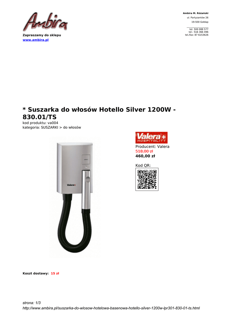 Ambira M. Różański ul. Partyzantów 26 19-500 Gołdap ___________________ tel. 500 088 577 tel.: 516 366 496 tel./fax: 87 6153626 Zapraszamy do sklepu www.ambira.pl * Suszarka do włosów Hotello Silver 1200W 830.01/TS kod produktu: va004 kategoria: SUSZARKI > do włosów Producent: Valera 518,00 zł 460,00 zł Kod QR: Koszt dostawy: 15 zł strona: 1/3 http://www.ambira.pl/suszarka-do-wlosow-hotelowa-basenowa-hotello-silver-1200w-lpr301-830-01-ts.html HOTELLO SILVER 1200W 830.01/T Silver Montowana na ścianę suszarka hotelowa do włosów i ciała 1200W Wytrzymały, trwały silnik Automatyczny wyłącznik czasowy (8min.) Automatyczne włączanie po zdjęciu końcówki z uchwytu Obrotowa końcówka rury zabezpieczona przed nagrzewaniem Rura rozciągliwa do długości 1,2 m Łatwy montaż bez potrzeby otwierania obudowy 2 warianty podłączenia elektrycznego: - bezpośrednio z sieci elektrycznej - poprzez elastyczny przewód z wtyczką Obudowa spełnia normę IP24 Kołki i śruby mocujące w zestawie Kolor srebrny Inne modele HOTELLO: HOTELLO HOTELLO Shaver HOTELLO AC HOTELLO AC Shaver Wymiary: strona: 2/3 http://www.ambira.pl/suszarka-do-wlosow-hotelowa-basenowa-hotello-silver-1200w-lpr301-830-01-ts.html strona: 3/3 http://www.ambira.pl/suszarka-do-wlosow-hotelowa-basenowa-hotello-silver-1200w-lpr301-830-01-ts.html