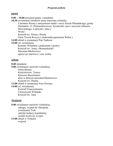 Program pobytu piątek 9.00 – 10.00 przyjazd grupy i śniadanie 10.30 zwiedzanie obiektów poza starówką wileńską Cmentarz Rossa ( mauzoleum matki i serca Józefa Piłsudskiego, groby filomatów, O. Pietraszkiewicza, Syrokomli, ojca i ojczyma Juliusza Słowackiego, Lelewela i inne.) Werki Kościół św. Piotra i Pawła Góra Trzech Krzyży ( doskonała panorama Wilna ) 14.00 obiad w restauracji Pan Tadeusz 15.00 cd. zwiedzania Katedra Wileńska ( podziemia i groby) Kościół św. Anny i Bernardyński Muzeum Mickiewicz spacer po starówce, czas wolny sobota 8.00 śniadanie 9.00 zwiedzanie starówki wileńskiej Ostra Brama Kościóówśw. Teresy Klasztor Bazylianów dom w którym mieszkał Mickiewicz Kościół św. Ducha 13.00 obiad w restauracji Foto Dwaras 14.00 cd. zwiedzania Kościół Franciszkanów Uniwersytet Wileński Kościół św. Jana Niedziela 9.00 zwiedzanie starówki wileńskiej zakupy, wypad do Akropolu zwiedzanie Trok zabytki kultury karaibskiej zamek trocki na wyspie 13.00 obiad w Trokach wyjazd