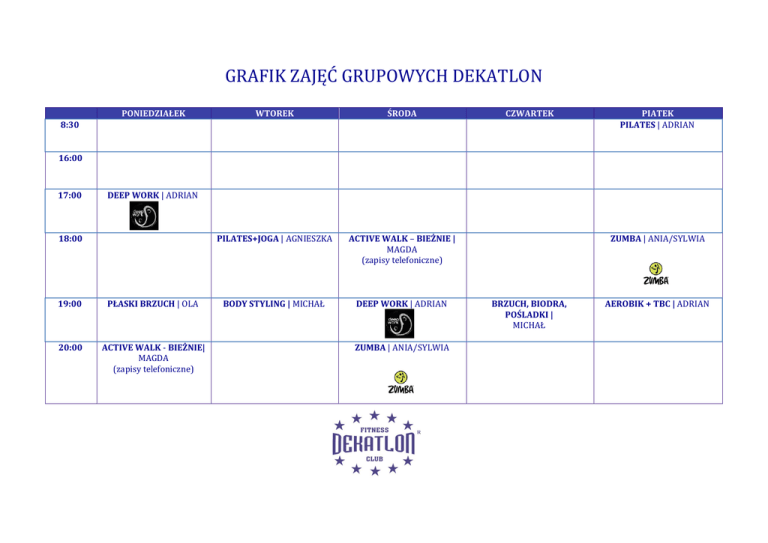 GRAFIK ZAJĘĆ GRUPOWYCH DEKATLON PONIEDZIAŁEK WTOREK ŚRODA PILATES+JOGA | AGNIESZKA ACTIVE WALK – BIEŻNIE | MAGDA (zapisy telefoniczne) BODY STYLING | MICHAŁ DEEP WORK | ADRIAN CZWARTEK 8:30 PIATEK PILATES | ADRIAN 16:00 17:00 DEEP WORK | ADRIAN 18:00 19:00 PŁASKI BRZUCH | OLA 20:00 ACTIVE WALK - BIEŻNIE| MAGDA (zapisy telefoniczne) ZUMBA | ANIA/SYLWIA ZUMBA | ANIA/SYLWIA BRZUCH, BIODRA, POŚLADKI | MICHAŁ AEROBIK + TBC | ADRIAN