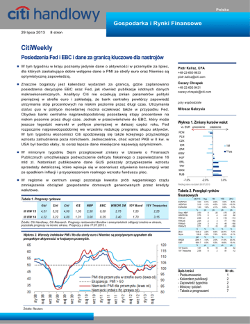 Polska Gospodarka i Rynki Finansowe 29 lipca 2013 8 stron CitiWeekly Posiedzenia Fed i EBC i dane za granicą kluczowe dla nastrojów W tym tygodniu w kraju poznamy jedynie dane o aktywności w przemyśle za lipiec, dla których zaskakująco dobre wstępne dane o PMI ze strefy euro oraz Niemiec są optymistyczną zapowiedzią. Znaczne bogatszy jest kalendarz wydarzeń za granicą, gdzie zaplanowano posiedzenia decyzyjne EBC oraz Fed, jak również publikacje istotnych danych makroekonomicznych. Analitycy Citi nie oczekują zmian parametrów polityki pieniężnej w strefie euro i zakładają, że bank centralny powtórzy zapowiedź utrzymania stóp procentowych na niskim poziomie przez długi czas. Utrzymania status quo w polityce monetarnej można oczekiwać także w przypadku Fed. Obydwa banki centralne najprawdopodobniej pozostawią stopy procentowe na niskim pozomie przez długi czas. Jednak w przeciwieństwie do EBC, który może jeszcze łagodzić warunki w polityce pieniężnej w dalszej części roku, Fed rozpocznie najprawdopodobniej we wrześniu redukcję programu skupu aktywów. W tym tygodniu ekonomiści Citi spodziewają się także kolejnego przyzwoitego wzrostu zatrudnienia poza rolnictwem. Jednocześnie, choć wzrost PKB w II kw. w USA był bardzo słaby, to coraz lepsze dane miesięczne napawają optymizmem. W minionym tygodniu Sejm przegłosował zmiany w Ustawie o Finansach Publicznych umożliwiające podwyższenie deficytu fiskalnego o zapowiedziane 16 mld zł. Natomiast publikowane dane GUS pokazały przyspieszenie wzrostu sprzedaży detalicznej, które wpisuje się w scenariusz ożywienia konsumpcji wraz ze spadkiem inflacji i przyspieszeniem realnego wzrostu funduszu płac. W regionie w centrum uwagi pozostaje kwestia prób węgierskiego rządu zmniejszenia obciążeń gospodarstw domowych generowanych przez kredyty walutowe. Tabela 1. Prognozy rynkowe €/zł $/zł £/zł €/$ NBP EBC WIBOR 3M 10Y Bund 10Y Treasuries III KW 13 4,31 3,32 4,90 1,30 2,50 0,50 2,75 1,55 2,25 III KW 14 4,22 3,22 4,80 1,31 3,00 0,25 3,40 1,70 3,15 Źródło: Citi Handlowy, Citi Research. Prognozy rentowności Bundów i amerykańskich obligacji średnio w okresie, pozostałe prognozy na koniec okresu. Prognozy z dnia 17.07.2013 r. Wykres 2. Wzrosty indeksów PMI i Ifo dla strefy euro i Niemiec są pozytywnym sygnałem dla perspektyw aktywności w krajowym przemyśle. Piotr Kalisz, CFA +48-22-692-9633 [email protected] Cezary Chrapek +48-22-692-9421 [email protected] przy współudziale Miłosza Gabrysia Wykres 1. Zmiany kursów walut vs. EUR umocnienie PLN CZK IDR 1M ZAR 1 tyg. KRW HUF BRL TRY MXN RUB -7.0% -2.0% 3.0% Według stanu na dzień 26.07.2013 Tabela 2. Przegląd rynków finansowych EUR/PLN USD/PLN EUR/USD Stopa NBP WIBOR 3M FRA1x4 FRA3x6 FRA6x9 FRA9x12 Złoto Ropa WIG20 S&P 10Y Bunds 10Y Treasuries 26/7/13 1 tyg. 4.23 -0.1% 3.19 -1.1% 1.33 1.0% % pb 2.50 0 2.70 0 2.66 2 2.64 2 2.64 3 2.71 2 $ % 1333.3 2.9% 108.6 -1.6% pkt % 2291.1 -1.0% 1691.7 0.0% % pb 1.67 15 2.56 8 Spis treści - Podsumowanie - Kalendarz publikacji - Zapowiedź tygodnia - Miniony tydzień - Tabela z prognozami Źródło: Reuters osłabienie RON 1M -2.6% -4.5% 2.1% pb -25 -4 3 3 -5 -10 % 8.8% 7.6% % 2.0% 5.5% pb -10 2 YTD 4.0% 3.3% 0.6% pb -175 -143 -116 -77 -40 -22 % -20.4% -0.5% % -11.3% 18.6% pb 36 81 2012 -8.8% -10.3% 1.9% pb -25 -86 -113 -145 -168 -168 % 7.0% -0.1% % 20.4% 13.4% pb -52 -12 Nr str. 1 2 2 3 7 CitiWeekly 29/07/2013 Kalendarz publikacji Godz. publikacji Kraj Informacja 29 lip 16:00 Konsensus rynkowy Poprzednia wartość Okres % r/r VII pkt VII 92.0 6.9 6.8 % r/r VII 1.8 1.7 1.8 12.4 12.0 PONIEDZIAŁEK USA Niezakończona sprzedaż domów 30 lip 08:00 Prognoza Citi jednostka 12.5 WTOREK EMU Nastroje konsumentów Gfk DE Wstępny odczyt CPI 15:00 USA Indeks cen domów Case Shiller r/r V 16:00 USA Zaufanie konsumentów pkt VII 81.5 81.0 81.4 31 lip ŚRODA DE Sprzedaż detaliczna % m/m VI 0.5 0.1 0.8 11:00 EMU Wstępny odczyt CPI % r/r VII 1.5 1.6 1.6 14:15 USA Raport ADP o zatrudnieniu tys. VII 180.0 188K 14:30 USA Wstępny odczyt PKB % r/r II kw 0.5 1.0 1.8 15:45 USA Chicago PMI pkt VII 53.0 54.0 51.6 20:00 USA Komunikat po posiedzeniu FOMC PMI pkt VII 1 sie CZWARTEK 9:00 PL 10:00 EMU Finalny PMI dla przemysłu pkt VII 50.1 13:45 EMU Decyzja EBC % VII 0.5 0.5 0.5 14:30 USA Liczba nowych bezrobotnych tys. tydz. 345.0 345.0 343.0 16:00 USA ISM dla przemysłu pkt VII 51.5 52.0 50.9 0.3 -0.1 2 sie 49.30 50.1 PIĄTEK 11:00 EMU PPI % r/r VI 14:30 USA Zatrudnienie poza rolnictwem tys. VII 175.0 184.0 195K 14:30 USA Stopa bezrobocia % VII 7.5 7.5 7.6 14:30 USA Wydatki konsumentów % VI 0.6 0.5 0.3 14:30 USA Dochody konsumentów % VI 0.5 0.4 0.5 14:30 USA Nowe zamówienia % VI 3.2 1.4 2.1 Źródło: Reuters, Bloomberg, Parkiet, urzędy statystyczne, banki centralne, prognozy Citi Zapowiedź tygodnia Wydarzenia krajowe Na ten tydzień nie zaplanowano publikacji istotnych danych makroekonomicznych. Jednak, jak zazwyczaj, ostatniego dnia miesiąca poznamy dane o oczekiwaniach inflacyjnych gospodarstw domowych oraz dane o portfelach obligacji poszczególnych typów inwestorów na koniec czerwca. Ponadto przedstawiciele Ministerstwa Finansów mogą odnieść się do planowanej na sierpień warunkowej aukcji obligacji. 2 CitiWeekly 29/07/2013 Strefa euro\USA\CEE Z kolei za granicą kalendarz wydarzeń i publikacji jest bardzo bogaty. Najistotniejsze będą w tym tygodniu posiedzenia banków centralnych Fed i EBC oraz publikacje danych o PKB za II kw. i zatrudnieniu poza rolnictwem w USA oraz wskaźniki aktywności w strefie euro. Ekonomiści Citi nie oczekują zmian stóp procentowych w strefie euro ani zmiany oceny ryzyk dla wzrostu gospodarczego czy inflacji, ale spodziewają się że EBC powtórzy, iż będzie utrzymywał akomodacyjną politykę pieniężną tak długo jak będzie to konieczne. Mimo poprawiających się danych z gospodarki realnej oraz lepszych ocen sytuacji w ankietach nastrojów sytuacja 