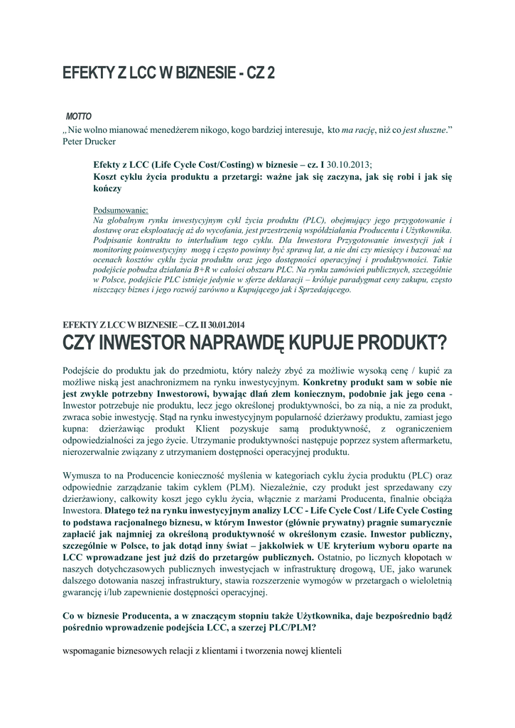 EFEKTY Z LCC W BIZNESIE - CZ 2 MOTTO „Nie wolno mianować menedżerem nikogo, kogo bardziej interesuje, kto ma rację, niż co jest słuszne.” Peter Drucker Efekty z LCC (Life Cycle Cost/Costing) w biznesie – cz. I 30.10.2013; Koszt cyklu życia produktu a przetargi: ważne jak się zaczyna, jak się robi i jak się kończy Podsumowanie: Na globalnym rynku inwestycyjnym cykl życia produktu (PLC), obejmujący jego przygotowanie i dostawę oraz eksploatację aż do wycofania, jest przestrzenią współdziałania Producenta i Użytkownika. Podpisanie kontraktu to interludium tego cyklu. Dla Inwestora Przygotowanie inwestycji jak i monitoring poinwestycyjny mogą i często powinny być sprawą lat, a nie dni czy miesięcy i bazować na ocenach kosztów cyklu życia produktu oraz jego dostępności operacyjnej i produktywności. Takie podejście pobudza działania B+R w całości obszaru PLC. Na rynku zamówień publicznych, szczególnie w Polsce, podejście PLC istnieje jedynie w sferze deklaracji – króluje paradygmat ceny zakupu, często niszczący biznes i jego rozwój zarówno u Kupującego jak i Sprzedającego. EFEKTY Z LCC W BIZNESIE – CZ. II 30.01.2014 CZY INWESTOR NAPRAWDĘ KUPUJE PRODUKT? Podejście do produktu jak do przedmiotu, który należy zbyć za możliwie wysoką cenę / kupić za możliwe niską jest anachronizmem na rynku inwestycyjnym. Konkretny produkt sam w sobie nie jest zwykle potrzebny Inwestorowi, bywając dlań złem koniecznym, podobnie jak jego cena Inwestor potrzebuje nie produktu, lecz jego określonej produktywności, bo za nią, a nie za produkt, zwraca sobie inwestycję. Stąd na rynku inwestycyjnym popularność dzierżawy produktu, zamiast jego kupna: dzierżawiąc produkt Klient pozyskuje samą produktywność, z ograniczeniem odpowiedzialności za jego życie. Utrzymanie produktywności następuje poprzez system aftermarketu, nierozerwalnie związany z utrzymaniem dostępności operacyjnej produktu. Wymusza to na Producencie konieczność myślenia w kategoriach cyklu życia produktu (PLC) oraz odpowiednie zarządzanie takim cyklem (PLM). Niezależnie, czy produkt jest sprzedawany czy dzierżawiony, całkowity koszt jego cyklu życia, włącznie z marżami Producenta, finalnie obciąża Inwestora. Dlatego też na rynku inwestycyjnym analizy LCC - Life Cycle Cost / Life Cycle Costing to podstawa racjonalnego biznesu, w którym Inwestor (głównie prywatny) pragnie sumarycznie zapłacić jak najmniej za określoną produktywność w określonym czasie. Inwestor publiczny, szczególnie w Polsce, to jak dotąd inny świat – jakkolwiek w UE kryterium wyboru oparte na LCC wprowadzane jest już dziś do przetargów publicznych. Ostatnio, po licznych kłopotach w naszych dotychczasowych publicznych inwestycjach w infrastrukturę drogową, UE, jako warunek dalszego dotowania naszej infrastruktury, stawia rozszerzenie wymogów w przetargach o wieloletnią gwarancję i/lub zapewnienie dostępności operacyjnej. Co w biznesie Producenta, a w znaczącym stopniu także Użytkownika, daje bezpośrednio bądź pośrednio wprowadzenie podejścia LCC, a szerzej PLC/PLM? wspomaganie biznesowych relacji z klientami i tworzenia nowej klienteli impuls do innowacyjnego rozwoju B+R możliwość projektowania systemowo zorientowanego na cykl życia produktu - ok. 90% cech produktu jest określanych na etapie projektowania systemowe uporządkowanie i usprawnienie serwisu produktów na bazie aftermarketu poprawa jakości produktów – z punktu widzenia całości cyklu życia produktu przewidywalność zdarzeń eksploatacyjnych poprawa satysfakcji Klienta możliwość zwiększania marży dzięki marketingowi, nastawionemu na dokumentowanie zysku Użytkownika / Inwestora w całościowym obszarze PLC projektowanie i ofertowanie w aspektach produktywnościowym i kosztowym: a. - dla danego kosztu cyklu życia produktu (LCC) największa produktywność (aspekt produktywnościowy) b. - dla danej produktywności, najmniejszy LCC (aspekt kosztowy) poprawa ergonomiczności i bezpieczeństwa produktu poprawa niezawodności i dostępności operacyjnej (tj. prawdopodobieństwa utrzymania produktywności) zmniejszenie energochłonności zmniejszenie opłat i kar środowiskowych podniesienie roli automatyzacji i sterowania w warunkach eksploatacyjnych racjonalizacja procesu zarządczego systemowy przegląd całości obszaru PLC pod kątem niezbędnych działań, w tym optymalnego wykorzystania danych zbieranych z eksploatacji możliwość parametryzacji zgodności produktu z oczekiwaniami, poprzez budowę macierzy cech pożądanych budowa obiektywnych celów operacyjnych, ukierunkowanych na wspólny z klientem sukces racjonalizacja kosztów w wyniku kreacji mechanizmu dostosowania zasobów do zadań uproszczenie procesu konstrukcji poprzez wykorzystanie bazy wiedzy oraz normaliów optymalizacja konstrukcji poprzez wymuszenie wykorzystania informacji zwrotnej budowa produktów optymalnych ekonomicznie w całym cyklu życia pobudzenie kreatywności w obszarze konstrukcji, produkcji, aftermarketu a także marketingu oraz całości zarządzania przedsiębiorstwem. Jan Parczewski NASTĘPNY ARTYKUŁ – LUTY 2014: ZA, A NAWET PRZECIW - PLM NA RYNKU INWESTYCYJNYM Zapowiedź: Jeśli jest tyle argumentów za wprowadzaniem PLM, to skąd bierze się opór w firmach? Jakie są szanse i zagrożenia we wprowadzaniu PLM, implikującego innowacyjny rozwój B+R? Odniesiemy się do wartości takiej zmiany dla: pracowników firm zarządów firm właścicieli firm urzędników polityków obywateli celem analizy stanu i perspektyw zmian. Wywołując ‘biblijnego”, zarządczego wilka z lasu: „Nie wolno mianować menedżerem nikogo, kogo bardziej interesuje, kto ma rację, niż co jest słuszne. Kiedy względy personalne biorą górę nad wymaganiami pracy, rodzi się korupcja.? Zarząd nie powinien mianować menedżerem kogoś, kto inteligencję uważa za ważniejszą od prawości. Może ktoś wied