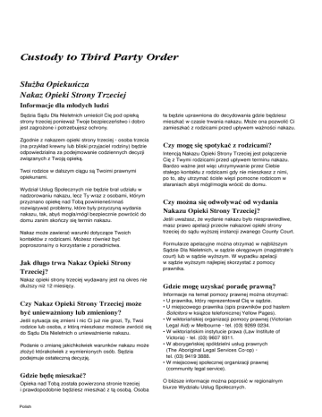Custody to Third Party Order SÂuz¾ba Opiekun;cza Nakaz Opieki Strony Trzeciej Informacje dla mÂodych ludzi Se•dzia Sa•du Dla Nieletnich umie—ci Cie• pod opieka• strony trzeciej poniewaz¾ Twoje bezpieczen;stwo i dobro jest zagroz¾one i potrzebujesz ochrony. Zgodnie z nakazem opieki strony trzeciej - osoba trzecia (na przykÂad krewny lub bliski przyjaciel rodziny) be•dzie odpowiedzialna za podejmowanie codziennych decyzji zwia•zanych z Twoja• opieka•. Twoi rodzice w dalszym cia•gu sa• Twoimi prawnymi opiekunami. Wydzia UsÂug SpoÂecznych nie be•dzie bra udziaÂu w nadzorowaniu nakazu, lecz Ty wraz z osobami, kto;rym przyznano opieke• nad Toba• powiniene—¦nna— rozwia•zywac; problemy, kto;re byÂy przyczyna• wydania nakazu, tak, aby— mogÂa¦mo;g bezpiecznie powro;cic; do domu zanim skon;czy sie• termin nakazu. Nakaz moz¾e zawierac; warunki dotycza•ce Twoich kontakto;w z rodzicami. Moz¾esz ro;wniez¾ byc; poproszona¦ny o korzystanie z poradnictwa. Jak dÂugo trwa Nakaz Opieki Strony Trzeciej= Nakaz opieki strony trzeciej wydawany jest na okres nie dÂuz¾szy niz¾ 12 miesie•cy. Czy Nakaz Opieki Strony Trzeciej moz¾e byc; uniewaz¾niony lub zmieniony= Je—li sytuacja sie• zmieni i nic Ci juz¾ nie grozi, Ty, Twoi rodzice lub osoba, z kto;ra• mieszkasz moz¾ecie zwro;cic; sie• do Sa•du Dla Nieletnich o uniewaz¾nienie nakazu. Podanie o zmiane• jakichkolwiek warunko;w nakazu moz¾e zÂoz¾yc; kto;rakolwiek z wymienionych oso;b. Se•dzia podejmuje ostateczna• decyzje•. Gdzie beÅdeÅ mieszkac;= Opieka nad Toba• zostaÂa powierzona stronie trzeciej i prawdopodobnie be•dziesz mieszkac; z ta• osoba•. Osoba Polish ta be•dzie uprawniona do decydowania gdzie be•dziesz mieszkac; w czasie trwania nakazu. Moz¾e ona pozwolic; Ci zamieszkac; z rodzicami przed upÂywem waz¾no—ci nakazu. Czy mogeÅ sieÅ spotykac; z rodzicami= Intencja• Nakazu Opieki Strony Trzeciej jest poÂa•czenie Cie• z Twymi rodzicami przed upÂywem terminu nakazu. Bardzo waz¾ne jest wie•c utrzymywanie przez Ciebie staÂego kontaktu z rodzicami gdy nie mieszkasz z nimi, po to, aby utrzymac; —cisÂe wie•zi pomocne rodzicom w staraniach aby— mo;g¦mogÂa wro;cic; do domu. Czy moz¾na sieÅ odwoÂywac; od wydania Nakazu Opieki Strony Trzeciej= Je—li uwaz¾asz, z¾e wydanie nakazu byÂo niesprawiedliwe, masz prawo apelacji przeciw nakazowi opieki strony trzeciej do sa•du wyz¾szej instancji zwanego County Court. Formularze apelacyjne moz¾na otrzymac; w najbliz¾szym Sa•dzie Dla Nieletnich, w sa•dzie okre•gowym (magistrate&s court) lub w sa•dzie wyz¾szym. W wypadku apelacji w sa•dzie wyz¾szym najlepiej skorzystac; z pomocy prawnika. Gdzie mogeÅ uzyskac; poradeÅ prawnaÅ= Informacje na temat pomocy prawnej moz¾na otrzymac;> • U prawnika, kto;ry reprezentowa Cie• w sa•dzie. • U miejscowego prawnika (spis prawniko;w pod hasÂem Solicitors w ksia•z¾ce telefonicznej Yellow Pages). • W wiktorian;skiej organizacji pomocy prawnej (Victorian Legal Aid) w Melbourne - tel. (03) 9269 0234. • W wiktorian;skim instytucie prawa (Law Institute of Victoria) - tel. (03) 9607 9311. • W aborygen;skiej spo;Âdzielni usÂug prawnych (The Aboriginal Legal Services Co-op) tel. (03) 9419 3888. • W miejscowej spoÂecznej organizacji prawnej (community legal service). O bliz¾sze informacje moz¾na poprosic; w regionalnym biurze WydziaÂu UsÂug SpoÂecznych.