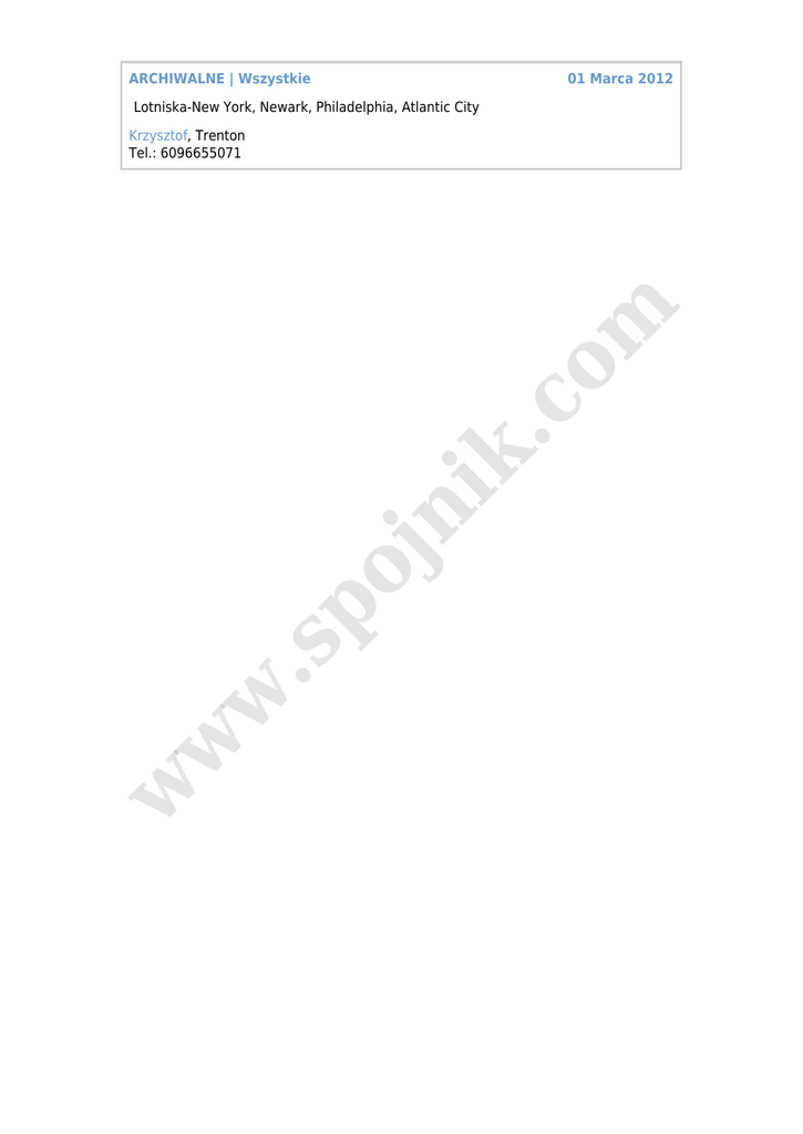 ARCHIWALNE | Wszystkie 01 Marca 2012 Lotniska-New York, Newark, Philadelphia, Atlantic City w w w .s po jn ik .c o m Krzysztof, Trenton Tel.: 6096655071