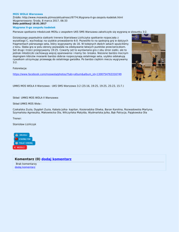 MOS WOLA Warszawa Źródło: http://www.moswola.pl/mos/aktualnosci/9774,Wygrana-II-go-zespolu-kadetek.html Wygenerowano: Środa, 8 marca 2017, 06:33 Data publikacji 18.01.2017 Wygrana II-go zespołu kadetek Pierwsze spotkanie młodziczek MOSu z zespołem UKS SMS Warszawa zakończyło się wygraną w stosunku 3:2. Dzisiejszego popołudnia siatkarki trenera Stanisława Lizińczyka spotkanie rozpoczęły z wysokiego C, wychodząc na szybkie prowadzenie 6:0. Pozwoliło to na spokojną grę w dalszych fragmentach pierwszego seta, który wygrywamy do 16. W kolejnych dwóch setach spuściliśmy z tonu. Słaba gra w polu obrony pozwalała na zdobywanie łatwych punktów przeciwniczkom. Set drugi i trzeci przegrywamy 19:25. Czwarty set to wyrównana gra z obu stron siatki, ale to jednak młodziczki zachowują więcej opanowania i mamy tie- breaka. Niesione bardzo mocnym dopingiem kibiców mosianki bardzo dobrze rozpoczynają ostatniego seta, szybko odskakują rywalkom utrzymując przewagę do ostatniego gwizdka. Po bardzo ciężkim meczu wygrywamy 3:2. Fotorelacja: https://www.facebook.com/moswola/photos/?tab=album&album_id=1300754763316749 UMKS MOS WOLA II Warszawa : UKS SMS Warszawa 3:2 (25:16, 19:25, 19:25, 25:23, 15:7.) Skład UMKS MOS WOLA II Warszawa: Skład UMKS MOS Wola : Czekalska Zuzia, Dygdoń Zuzia, Kabala Julka- kapitan, Kosieradzka Oliwka, Baran Karolina, Rozwadowska Martyna, Szymańska Agnieszka, Makowiecka Ola, Wilczyńska Matylda, Wydmańska Julka, Bąk Patrycja, Pająkowska Ola Trener: Stanisław Lizińczyk Komentarz (0) dodaj komentarz Brak komentarzy dodaj komentarz