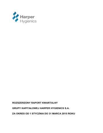 ROZSZERZONY RAPORT KWARTALNY GRUPY KAPITAŁOWEJ HARPER HYGIENICS S.A. ZA OKRES OD 1 STYCZNIA DO 31 MARCA 2015 ROKU SPIS TREŚCI 1. OPIS ISTOTNYCH DOKONAŃ LUB NIEPOWODZEŃ GRUPY KAPITAŁOWEJ HARPER HYGIENICS S.A. WRAZ ZE WSKAZANIEM NAJWAŻNIEJSZYCH ZDARZEŃ W OKRESIE 1.01.–31.03.2015 .....................................................................................................3 2. PODSUMOWANIE SYTUACJI FINANSOWEJ GRUPY KAPITAŁOWEJ HARPER HYGIENICS S.A. ......................................................................................................................5 2.1. Wybrane dane finansowe, zawierające podstawowe pozycje skróconego skonsolidowanego i jednostkowego sprawozdania finansowego (również przeliczone na euro) przedstawiające dane narastająco za pierwszy kwartał danego i poprzedniego roku obrotowego, a w przypadku sprawozdania z sytuacji finansowej – na koniec bieżącego kwartału i koniec poprzedniego roku obrotowego .....................................................................5 3. POZOSTAŁE INFORMACJE ...................................................................................................8 3.1. Opis organizacji Grupy Kapitałowej Harper Hygienics ze wskazaniem jednostek podlegających konsolidacji........................................................................................................8 3.2. Wskazanie skutków zmian w strukturze Grupy Kapitałowej Harper Hygienics w wyniku połączenia, przejęcia lub sprzedaży jednostek Grupy, inwestycji długoterminowych, podziału, restrukturyzacji i zaniechania działalności .................................................................8 3.3. Stanowisko Zarządu odnośnie możliwości zrealizowania wcześniej publikowanych prognoz wyników na 2015 rok ..................................................................................................8 3.4. Wskazanie akcjonariuszy posiadających bezpośrednio lub pośrednio przez podmioty zależne co najmniej 5% ogólnej liczby głosów na walnym zgromadzeniu Spółki na dzień przekazania raportu kwartalnego wraz ze wskazaniem liczby posiadanych przez te podmioty akcji, ich procentowego udziału w kapitale zakładowym, liczby głosów z nich wynikających i ich procentowego udziału w ogólnej liczbie głosów na walnym zgromadzeniu oraz wskazanie zmian w strukturze własności znacznych pakietów akcji Spółki w okresie od przekazania poprzedniego raportu kwartalnego .......................................8 3.5. Zestawienie stanu posiadania akcji Harper Hygienics S.A. lub uprawnień do nich przez osoby zarządzające i nadzorujące Spółkę na dzień przekazania raportu, wraz ze wskazaniem zmian w stanie posiadania, w okresie od przekazania ostatniego raportu okresowego ...............................................................................................................................9 3.6. Wskazanie postępowań toczących się przed sądem, organem właściwym dla postępowania arbitrażowego lub organem administracji publicznej .........................................9 3.7. Informacje o zawarciu przez emitenta lub jednostkę od niego zależną jednej lub wielu transakcji z podmiotami powiązanymi, jeżeli pojedynczo lub łącznie są one istotne i zostały zawarte na innych warunkach niż rynkowe ............................................................................ 10 3.8. Informacje o udzielonych poręczeniach kredytu lub pożyczki oraz udzielonych gwarancjach ............................................................................................................................................... 10 3.9. Inne informacje, które zdaniem Harper Hygienics S.A. są istotne dla oceny sytuacji kadrowej, majątkowej, finansowej, wyniku finansowego i ich zmian, oraz informacje, które są istotne dla oceny możliwości realizacji zobowiązań przez Grupę Kapitałową Harper Hygienics S.A. ........................................................................................................................ 11 3.10. Wskazanie czynników, które w ocenie Harper Hygienics S.A. oraz jej Grupy Kapitałowej będą miały wpływ na osiągnięte przez nich wyniki w perspektywie co najmniej kolejnego kwartału .................................................................................................................................. 12 Rozszerzony raport kwartalny Grupy Kapitałowej Harper Hygienics S.A. za okres 1.01.-31.03.2015 2/13 1. OPIS ISTOTNYCH DOKONAŃ LUB NIEPOWODZEŃ GRUPY KAPITAŁOWEJ HARPER HYGIENICS S.A. WRAZ ZE WSKAZANIEM NAJWAŻNIEJSZYCH ZDARZEŃ W OKRESIE 1.01.–31.03.2015 W pierwszym kwartale 2015 roku skonsolidowane przychody ze sprzedaży Grupy Kapitałowej Harper Hygienics SA („Grupy”) istotnie odbiegają in minus swoim poziomem od przychodów osiąganych w poprzednich kwartałach obrotowych: w ujęciu rok do roku zanotowano spadek w wysokości 16%. Na niższy poziom przychodów ze sprzedaży osiągniętych w pierwszym kwartale 2015 roku wpływ miał istotny, wynoszący około 80% w ujęciu r-d-r spadek sprzedaży na rynkach rosyjskim i ukraińskim. Spadek sprzedaży na tych rynkach wynikał z ogólnej sytuacji makroekonomicznej obu krajów, w tym załamania się od początku 2015 roku popytu konsumpcyjnego, dewaluacji lokalnych walut i trudności lokalnych przedsiębiorców w pozyskiwaniu walut do realizacji zakupów importowych. Należy podkreślić, że historycznie udział tych rynków w całości skonsolidowanej sprzedaży Grupy wynosił prawie 20%. W pierwszym kwartale 2015 sprzedaż na rynkach rosyjskim i ukraińskim spadła do poziomu około 5% w całości skonsolidowanej sprzedaży Grupy w tym okresie. Traktując oba rynki jako istotne i przyszłościowe, Grupa podjęła działania mające na celu utrzymanie swojej pozycji rynkowej w obu krajach, mimo że rentowność realizowanej sprzedaży może być niższa niż dotychczas. Między innymi podpisano umowę z nowym dyst