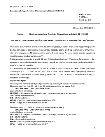 Nr sprawy: IZP.272.2.2012 Bankowa obsługa Powiatu Oławskiego w latach 2012-2015 POWIAT OŁAWSKI ul. 3 Maja 1 55-200 Oława tel. (071) 301 15 00, fax (071) 301 15 62 Oława, dnia 12.03.2012 r. Dotyczy: Bankowa obsługa Powiatu Oławskiego w latach 2012-2015 INFORMACJA O ZMIANIE TREŚCI SPECYFIKACJI ISTOTNYCH WARUNKÓW ZAMÓWIENIA W związku z zapytaniem skierowanym do Zamawiającego, o treści: „Czy Zamawiający nie popełnił błędu pisarskiego w odniesieniu do zawartego sposobu oceny ofert wg ustalonych w SIWZ kryteriów, przypisując poz. 16 zastosowanie wzoru B a nie wzoru A, co w naszej ocenie wydaje się mniej korzystne dla Zamawiającego ?”: 1. Zamawiający wyjaśnia, iż w pkt. 12 ust. 2 Specyfikacji Istotnych Warunków Zamówienia – „Zastosowane wzory do obliczenia punktowego”, wkradł się błąd w zakresie przypisania odpowiednich wzorów do pozycji kryteriów. 2. Zamawiający na podstawie art. 38 ust. 4 ustawy z dnia 29 stycznia 2004r. Prawo zamówień publicznych (Dz.U. z 2010 Nr 113 poz. 759 z późn. zm.) zmienia treść Specyfikacji Istotnych Warunków Zamówienia poprzez zmianę treści pkt. 12 ust. 2 SIWZ - Zastosowane wzory do obliczenia punktowego: Poprzednio było: Poszczególne elementy oferty będą oceniane wg poniższych wzorów matematycznych. Elementy oferty od 1 do 15 i od 19 do 20, zostaną ocenione wg wzoru A, tj: LPEOBA = ON / OB x (WP100) x WPeo, gdzie składowe oznaczają; LPEOBA – liczba punktów elementu oferty badanej szacowana wg wzoru A, ON – oferta najkorzystnijsza, OB – oferta badana, WP100 – współczynnik proporcjonalności równy 100, WPeo – waga procentowa elementu oferty. Elementy oferty od 16 do 18, zostaną ocenione wg wzoru B, tj: LPEOBB = OB / ON x (WP100) x WPeo gdzie składowe oznaczają; LPEOBB – liczba punktów elementu oferty badanej szacowana wg wzoru B, OB – oferta badana, ON – oferta najkorzystniejsza, WP100 – współczynnik proporcjonalności równy 100, WPeo – waga procentowa elementu oferty.”. 1 Nr sprawy: IZP.272.2.2012 Bankowa obsługa Powiatu Oławskiego w latach 2012-2015 POWIAT OŁAWSKI ul. 3 Maja 1 55-200 Oława tel. (071) 301 15 00, fax (071) 301 15 62 Obecnie jest: Poszczególne elementy oferty będą oceniane wg poniższych wzorów matematycznych. Elementy oferty od 1 do 16 i od 19 do 20, zostaną ocenione wg wzoru A, tj: LPEOBA = ON / OB x (WP100) x WPeo, gdzie składowe oznaczają; LPEOBA – liczba punktów elementu oferty badanej szacowana wg wzoru A, ON – oferta najkorzystniejsza, OB – oferta badana, WP100 – współczynnik proporcjonalności równy 100, WPeo – waga procentowa elementu oferty. Elementy oferty od 17 do 18, zostaną ocenione wg wzoru B, tj: LPEOBB = OB / ON x (WP100) x WPeo gdzie składowe oznaczają; LPEOBB – liczba punktów elementu oferty badanej szacowana wg wzoru B, OB – oferta badana, ON – oferta najkorzystniejsza, WP100 – współczynnik proporcjonalności równy 100, WPeo – waga procentowa elementu oferty.”. Na podstawie art. 38 ust. 4a pkt. 1 Ustawy Pzp. niniejsze ogłoszenie zostało opublikowane w Biuletynie Zamówień Publicznych. …………………………………………. Podpis Kierownika Zamawiającego 2