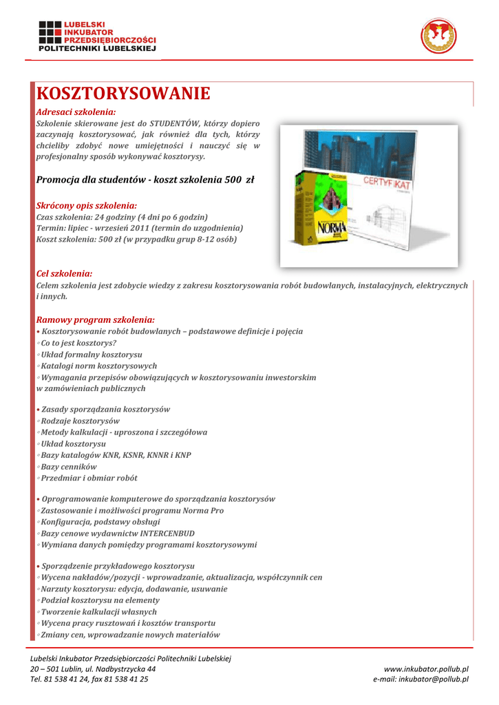 KOSZTORYSOWANIE Adresaci szkolenia: Szkolenie skierowane jest do STUDENTÓW, którzy dopiero zaczynają kosztorysować, jak również dla tych, którzy chcieliby zdobyć nowe umiejętności i nauczyć się w profesjonalny sposób wykonywać kosztorysy. Promocja dla studentów - koszt szkolenia 500 zł Skrócony opis szkolenia: Czas szkolenia: 24 godziny (4 dni po 6 godzin) Termin: lipiec - wrzesień 2011 (termin do uzgodnienia) Koszt szkolenia: 500 zł (w przypadku grup 8-12 osób) Cel szkolenia: Celem szkolenia jest zdobycie wiedzy z zakresu kosztorysowania robót budowlanych, instalacyjnych, elektrycznych i innych. Ramowy program szkolenia: • Kosztorysowanie robót budowlanych – podstawowe definicje i pojęcia ◦ Co to jest kosztorys? ◦ Układ formalny kosztorysu ◦ Katalogi norm kosztorysowych ◦ Wymagania przepisów obowiązujących w kosztorysowaniu inwestorskim w zamówieniach publicznych • Zasady sporządzania kosztorysów ◦ Rodzaje kosztorysów ◦ Metody kalkulacji - uproszona i szczegółowa ◦ Układ kosztorysu ◦ Bazy katalogów KNR, KSNR, KNNR i KNP ◦ Bazy cenników ◦ Przedmiar i obmiar robót • Oprogramowanie komputerowe do sporządzania kosztorysów ◦ Zastosowanie i możliwości programu Norma Pro ◦ Konfiguracja, podstawy obsługi ◦ Bazy cenowe wydawnictw INTERCENBUD ◦ Wymiana danych pomiędzy programami kosztorysowymi • Sporządzenie przykładowego kosztorysu ◦ Wycena nakładów/pozycji - wprowadzanie, aktualizacja, współczynnik cen ◦ Narzuty kosztorysu: edycja, dodawanie, usuwanie ◦ Podział kosztorysu na elementy ◦ Tworzenie kalkulacji własnych ◦ Wycena pracy rusztowań i kosztów transportu ◦ Zmiany cen, wprowadzanie nowych materiałów Lubelski Inkubator Przedsiębiorczości Politechniki Lubelskiej 20 – 501 Lublin, ul. Nadbystrzycka 44 Tel. 81 538 41 24, fax 81 538 41 25 www.inkubator.pollub.pl e-mail: [email protected] ◦ Sprawdzenie kosztorysu, wprowadzanie zmian ◦ Wydruki oraz przygotowanie dokumentacji do zapisu w wersji elektronicznej • Przedmiarowanie oraz sporządzanie kosztorysów - ćwiczenia ◦ Czytanie dokumentacji i rysunków technicznych ◦ Przygotowanie obmiaru robót ◦ Samodzielne sporządzanie przykładowej kalkulacji na podstawie udostępnionego Projektu Budowlanego ◦ Kosztorys i przedmiar inwestorski w zamówieniach publicznych a pozostałe formy kosztorysów • Egzamin końcowy sprawdzający nabyte umiejętności Forma prowadzenia zajęć: Część teoretyczna - wykłady Część praktyczna - warsztaty komputerowe Kwalifikacje po ukończeniu: Zaliczenie egzaminu końcowego sprawdzającego nabyte umiejętności jest podstawą otrzymania zaświadczenia akredytowanego przez kuratorium oświaty. Warunki ukończenia: Warunkiem ukończenia szkolenia jest zaliczenie egzaminu końcowego sprawdzającego nabyte umiejętności. Materiały szkoleniowe: Tak Miejsce szkolenia: Nazwa miejsca: Lubelski Inkubator Przedsiębiorczości Politechniki Lubelskiej Województwo: Lubelskie Powiat: m. Lublin Gmina: M. Lublin Kod / Miejscowość: 20-501 Lublin ul.: Nadbystrzycka Nr domu / lokalu: 44 Opis miejsca szkolenia: Klimatyzowana sala wyposażona w wyspecjalizowany sprzęt komputerowy. Cena zawiera: • Materiały szkoleniowe w formie skryptu • Egzamin końcowy • Zaświadczenie akredytowane przez kuratorium oświaty • Wyżywienie: serwis kawowy Status szkolenia: Rekrutacja w toku Tryb szkolenia: Weekendowe, godziny popołudniowe Kontakt w sprawie szkolenia: • osoba kontaktowa: mgr Bernadeta KOLASIK • e-mail kontaktowy: [email protected] • telefon kontaktowy: (81) 538-41-24 Lubelski Inkubator Przedsiębiorczości Politechniki Lubelskiej 20 – 501 Lublin, ul. Nadbystrzycka 44 Tel. 81 538 41 24, fax 81 538 41 25 www.inkubator.pollub.pl e-mail: [email protected] Formy zgłoszeń: • e-mail • telefon • osobiście Lubelski Inkubator Przedsiębiorczości Politechniki Lubelskiej 20 – 501 Lublin, ul. Nadbystrzycka 44 Tel. 81 538 41 24, fax 81 538 41 25 www.inkubator.pollub.pl e-mail: [email protected]
