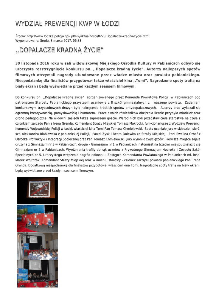 WYDZIAŁ PREWENCJI KWP W ŁODZI Źródło: http://www.lodzka.policja.gov.pl/el2/aktualnosci/8223,Dopalacze-kradna-zycie.html Wygenerowano: Środa, 8 marca 2017, 06:33 ,,DOPALACZE KRADNĄ ŻYCIE” 30 listopada 2016 roku w sali widowiskowej Miejskiego Ośrodka Kultury w Pabianicach odbyło się uroczyste rozstrzygnięcie konkursu pn. ,,Dopalacze kradną życie”. Autorzy najlepszych spotów filmowych otrzymali nagrody ufundowane przez władze miasta oraz powiatu pabianickiego. Niespodziankę dla finalistów przygotował także właściciel kina ,,Tomi”. Nagrodzone spoty trafią na biały ekran i będą wyświetlane przed każdym seansem filmowym. Do konkursu pn. ,,Dopalacze kradną życie” zorganizowanego przez Komendę Powiatową Policji w Pabianicach pod patronatem Starosty Pabianickiego przystąpili uczniowie z 8 szkół gimnazjalnych z naszego powiatu. Zadaniem konkursowym trzyosobowych drużyn było nakręcenie krótkich spotów antydopalaczowych. Autorzy prac wykazali się ogromną kreatywnością, pomysłowością i humorem. Prace swoich rówieśników obejrzała licznie przybyła młodzież oraz grono pedagogiczne. Na widowni zasiedli także zaproszeni goście. Wśród nich byli przedstawiciele starostwa na czele z członkiem zarządu Panią Ireną Grendą, Komendant Straży Miejskiej Tomasz Makrocki, funkcjonariusze z Wydziału Prewencji Komendy Wojewódzkiej Policji w Łodzi, właściciel kina Tomi Pan Tomasz Chmielewski. Spoty oceniało jury w składzie : sierż. szt. Aleksandra Białkowska z pabianickiej Policji, Paweł Zysk i Beata Dolewka ze Straży Miejskiej, Pani Ewelina Ornaf z Ośrodka Profilaktyki i Integracji Społecznej oraz Pan Tomasz Chmielewski. Jury wyłoniło zwycięzców. Pierwsze miejsce zajęła drużyna z Gimnazjum nr 3 w Pabianicach, drugie – Gimnazjum nr 1 w Pabianicach, natomiast na trzecim miejscu znalazło się Gimnazjum nr 2 w Pabianicach. Wyróżnienia trafiły do rąk uczniów z Prywatnego Gimnazjum Heureka i Zespołu Szkół Specjalnych nr 5. Uroczystego wręczenia nagród dokonali I Zastępca Komendanta Powiatowego w Pabianicach mł. insp. Marek Wojtczak, Komendant Straży Miejskiej oraz w imieniu starosty - członek zarządu powiatu pabianickiego Pani Irena Grenda. Dodatkową niespodziankę dla finalistów przygotował właściciel kina Tomi. Nagrodzone spoty trafią na biały ekran i będą wyświetlane przed każdym seansem filmowym. Ocena: 0/5 (0) Tweetnij