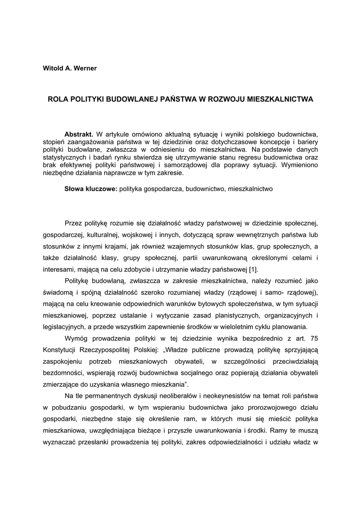 Witold A. Werner ROLA POLITYKI BUDOWLANEJ PAŃSTWA W ROZWOJU MIESZKALNICTWA Abstrakt. W artykule omówiono aktualną sytuację i wyniki polskiego budownictwa, stopień zaangażowania państwa w tej dziedzinie oraz dotychczasowe koncepcje i bariery polityki budowlane, zwłaszcza w odniesieniu do mieszkalnictwa. Na podstawie danych statystycznych i badań rynku stwierdza się utrzymywanie stanu regresu budownictwa oraz brak efektywnej polityki państwowej i samorządowej dla poprawy sytuacji. Wymieniono niezbędne działania naprawcze w tym zakresie. Słowa kluczowe: polityka gospodarcza, budownictwo, mieszkalnictwo Przez politykę rozumie się działalność władzy państwowej w dziedzinie społecznej, gospodarczej, kulturalnej, wojskowej i innych, dotyczącą spraw wewnętrznych państwa lub stosunków z innymi krajami, jak również wzajemnych stosunków klas, grup społecznych, a także działalność klasy, grupy społecznej, partii uwarunkowaną określonymi celami i interesami, mającą na celu zdobycie i utrzymanie władzy państwowej [1]. Politykę budowlaną, zwłaszcza w zakresie mieszkalnictwa, należy rozumieć jako świadomą i spójną działalność szeroko rozumianej władzy (rządowej i samo- rządowej), mającą na celu kreowanie odpowiednich warunków bytowych społeczeństwa, w tym sytuacji mieszkaniowej, poprzez ustalanie i wytyczanie zasad planistycznych, organizacyjnych i legislacyjnych, a przede wszystkim zapewnienie środków w wieloletnim cyklu planowania. Wymóg prowadzenia polityki w tej dziedzinie wynika bezpośrednio z art. 75 Konstytucji Rzeczypospolitej Polskiej: „Władze publiczne prowadzą politykę sprzyjającą zaspokojeniu potrzeb mieszkaniowych obywateli, w szczególności przeciwdziałają bezdomności, wspierają rozwój budownictwa socjalnego oraz popierają działania obywateli zmierzające do uzyskania własnego mieszkania”. Na tle permanentnych dyskusji neoliberałów i neokeynesistów na temat roli państwa w pobudzaniu gospodarki, w tym wspieraniu budownictwa jako prorozwojowego działu gospodarki, niezbędne staje się określenie ram, w których musi się mieścić polityka mieszkaniowa, uwzględniająca bieżące i przyszłe uwarunkowania i środki. Ramy te muszą wyznaczać przesłanki prowadzenia tej polityki, zakres odpowiedzialności i udziału władz w realizacji tej polityki, a przede wszystkim określać niezbędne środki w celu przełamania obecnego regresu mieszkaniowego, sposoby i źródła ich pozyskania. Dla rozwoju budownictwa niezbędne są w zasadzie tylko dwa elementy: – środki finansowe (własne osób inwestujących dla swoich potrzeb oraz w celach komercyjnych, pożyczone osobom posiadającym zdolność kredytową, z budżetu centralnego i samorządowych, ew. „pomocowe” i in.), – motywacje do inwestowania („życzliwe” prawa rzeczowe w zakresie gospodarowania przestrzenią i podejmowania przedsięwzięć budowlano-inwestycyjnych, uzyskiwania pozwoleń na budowę oraz uwarunkowania i prawa finansowe: stopa procentowa, VAT i inne podatki, ulgi dla budujących itd.). Nawet pobieżna analiza obecnej sytuacji całego budownictwa, w tym budownictwa mieszkaniowego, wykazuje po prostu brak i niedocenianie polityki w tym zakresie przez kolejne rządy, co niewątpliwie było jedną z przyczyn emigracji setek tysięcy wykształconych Polaków, którym nie stworzono szans uzyskania mieszkania, a także jedną z przyczyn upadku kilku już rządów, które nie zadbały o utrzymanie władzy. Na tle pozytywnych wyników Polski w 2003 r., znacznego ożywienia gospodarki narodowej, wzrostu PKB wyższego od prognoz, sytuacja budownictwa nie jest zadowalająca. Sytuacja i wyniki budownictwa W stosunku do wyników roku ubiegłego nastąpił kilkuprocentowy spadek sprzedaży produkcji budowlano-montażowej (w granicach 3-5%), a także kilkunastoprocentowy spadek zatrudnienia, choć w pewnej części spowodowany wzrostem wydajności pracy, w części jednak również rozwojem systemu tzw. samozatrudnienia. W 2003 r. nastąpiło dalsze zmniejszenie udziału nakładów na budynki (mieszkalne i niemieszkalne) przy wzroście nakładów na obiekty inżynierii lądowej i wodnej. O słabych perspektywach budownictwa i przedsiębiorstw budowlanych w 2004 r. świadczy comiesięczny spadek cen produkcji budowlano-montażowej, znacznie poniżej poziomu cen towarów i usług konsumpcyjnych. Przy wskaźniku inflacji w styczniu i lutym 2004 r. równym 101,6%, ceny w budownictwie kształtują się na poziomie 99,2-99,3%. Pogarsza się zatem sytuacja finansowa przedsiębiorstw, a ogólny klimat koniunktury w budownictwie wynosi minus 18, a więc jest znacznie gorszy niż w analogicznych miesiącach ostatnich lat [2]. Sytuacja mieszkaniowa w trakcie włączania Polski w struktury unijne, stawia nasz kraj w pozycji ubogiego krewnego z żenująco niskimi wskaźnikami stanu bieżącego. Na 13,8 mln gospodarstw domowych mamy 12,5 mln mieszkań, w tym 11,6 mln mieszkań stale zamieszkałych, w których mieszka 37,8 mln osób. Daje to wskaźnik 308 mieszkań zamieszkałych na 1000 mieszkańców, podczas gdy we wszystkich krajach unijnych oraz wstępujących razem z Polską do Unii wskaźnik ten jest znacznie wyższy, np. w Rumunii 349, na Łotwie 394, w Bułgarii 418, w Hiszpanii 481, we Francji 491. Z pewnym uproszczeniem, wynikającym ze zmieniających się zwyczajów i struktur rodzinnych, potrzeby mieszkaniowe oszacować zatem można na 1,3 mln mieszkań, nie uwzględniając konieczności rozbiórki w ciągu 10 lat około 0,7-0,8 mln mieszkań, których nie ma możliwości bądź sensu ekonomicznego remontować i modernizować. Przeciętna powierzchnia użytkowa przypadająca na 1 osobę wynosi 21,1 m2, to jest kilkakrotnie mniej od identycznego wskaźnika mieszkań obecnie budowanych. W roku 2003 oddano do użytku 163,6 tys. mieszkań, wprawdzie statystycznie rzecz ujmując o 67,6% więcej niż w roku poprzednim, jednak daje to wskaźnik 4,2 mie