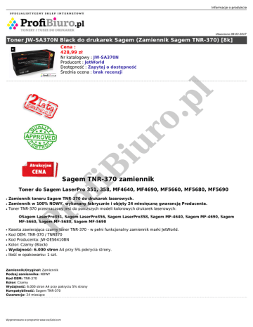 Informacje o produkcie Utworzono 08-03-2017 Toner JW-SA370N Black do drukarek Sagem (Zamiennik Sagem TNR-370) [8k] Cena : 428,99 zł iB iu r o. pl Nr katalogowy : JW-SA370N Producent : JetWorld Dostępność : Zapytaj o dostępność Średnia ocena : brak recenzji Sagem TNR-370 zamiennik ● ● Zamiennik toneru Sagem TNR-370 do drukarek laserowych. Zamiennik w 100% NOWY, wykonany fabrycznie i objęty 24 miesięczną gwarancją Producenta. Toner TNR-370 przeznaczony jest do poniższych modeli kolorowych drukarek laserowych: Pr ● of Toner do Sagem LaserPro 351, 358, MF4640, MF4690, MF5660, MF5680, MF5690 OSagem LaserPro351, Sagem LaserPro356, Sagem LaserPro358, Sagem MF-4640, Sagem MF-4690, Sagem MF-5660, Sagem MF-5680, Sagem MF-5690 ● ● ● ● ● ● Kaseta zawierająca czarny toner TNR-370 - w pełni funkcjonalny zamiennik marki JetWorld. Kod OEM: TNR-370 / TNR370 Kod Producenta: JW-OES6410BN Kolor: Czarny (Black) Wydajność: 6.000 stron A4 przy 5% pokrycia strony. Ilość w opakowaniu: 1 szt. Zamiennik/Oryginał: Zamiennik Rodzaj zamiennika: NOWY Kod OEM: TNR-370 Kolor: Czarny Wydajność: 6.000 stron A4 przy pokryciu 5% strony Kompatybilność: Sagem TNR-370 Gwarancja: 24 miesiące Wygenerowano w programie www.oscGold.com