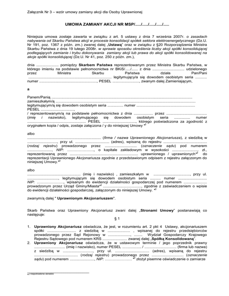 Załącznik Nr 3 – wzór umowy zamiany akcji dla Osoby Uprawnionej UMOWA ZAMIANY AKCJI NR MSP/...../...../...../...../..... Niniejsza umowa zostaje zawarta w związku z art. 5 ustawy z dnia 7 września 2007r. o zasadach nabywania od Skarbu Państwa akcji w procesie konsolidacji spółek sektora elektroenergetycznego (Dz.U. Nr 191, poz. 1367 z późn. zm.) zwanej dalej „Ustawą” oraz w związku z §20 Rozporządzenia Ministra Skarbu Państwa z dnia 19 lutego 2008r. w sprawie sposobu określenia liczby akcji spółki konsolidującej podlegających zamianie i trybu dokonywania zamiany akcji lub prawa do akcji spółki konsolidowanej na akcje spółki konsolidującej (Dz.U. Nr 41, poz. 250 z późn. zm.), dnia ..................... pomiędzy Skarbem Państwa reprezentowanym przez Ministra Skarbu Państwa, w którego imieniu na podstawie pełnomocnictwa nr BKiS/...../...... z dnia .............................. udzielonego przez Ministra Skarbu Państwa działa Pan/Pani .............................................................................. legitymujący/a się dowodem osobistym seria ........... numer ......................................................, PESEL ........................., zwanym dalej Zamieniającym, a Panem/Panią .................................................................................................................................... zamieszkałym/ą ................................................................................................................................... legitymującym/ą się dowodem osobistym seria ............... numer ....................................................... PESEL ..............................., / reprezentowanym/ą na podstawie pełnomocnictwa z dnia .................. przez ...................................... (imię i nazwisko), legitymującego się dowodem osobistym seria ............... numer ....................................................... PESEL ..............................., którego poświadczona za zgodność z ) oryginałem kopia / odpis, zostaje załączona / y do niniejszej Umowy * albo ..................................................................... (firma / nazwa Uprawnionego Akcjonariusza), z siedzibą w ............................, przy ul. ................................ (adres), wpisaną do rejestru ......................................... (rodzaj rejestru) prowadzonego przez .............................. (oznaczenie sądu) pod numerem ......................., NIP: …………………, o kapitale zakładowym w wysokości ......................... zł., ) reprezentowaną przez ................................................................ uprawnionego / uprawnionych* do reprezentacji Uprawnionego Akcjonariusza zgodnie z przedstawionym odpisem z rejestru załączonym do ) niniejszej Umowy.* albo .................................................. (imię i nazwisko) , zamieszkałym w .................................., przy ul. ............................., legitymującym się dowodem osobistym seria .......... numer ........................... NIP: …………………, wpisanym do ewidencji działalności gospodarczej pod numerem ...................... ) prowadzonym przez Urząd Gminy/Miasta* ...................................., zgodnie z zaświadczeniem o wpisie ) do ewidencji działalności gospodarczej, załączonym do niniejszej Umowy. * zwanym/ą dalej " Uprawnionym Akcjonariuszem". Skarb Państwa oraz Uprawniony Akcjonariusz zwani dalej „Stronami Umowy” postanawiają co następuje: §1 1. Uprawniony Akcjonariusz oświadcza, że jest, w rozumieniu art. 2 pkt 4 Ustawy, akcjonariuszem spółki ........................... z siedzibą w ..................... , wpisanej do rejestru przedsiębiorców prowadzonego przez Sąd Rejonowy w ....................., ........ Wydział Gospodarczy Krajowego Rejestru Sądowego pod numerem KRS ....................... zwanej dalej „Spółką Konsolidowaną”. 2. Uprawniony Akcjonariusz oświadcza, że w ustawowym terminie / jego poprzednik prawny ............................. (imię i nazwisko), numer PESEL .................. / .............................. (firma lub nazwa) z siedzibą w ............................, przy ul. ................................ (adres), wpisaną do rejestru ......................................... (rodzaj rejestru) prowadzonego przez .............................. (oznaczenie ) sądu) pod numerem ......................., NIP: ………………… * złożył pisemne oświadczenie o zamiarze _____________________________ ) niepotrzebne skreślić * zamiany wszystkich posiadanych akcji Spółki Konsolidowanej na akcje spółki ........................... z siedzibą w ..................... , wpisanej do rejestru przedsiębiorców prowadzonego przez Sąd Rejonowy w ....................., ........ Wydział Gospodarczy Krajowego Rejestru Sądowego pod numerem KRS ....................... zwanej dalej „Spółką Konsolidującą”. Oświadczenie o zamiarze zamiany wszystkich posiadanych akcji Spółki Konsolidowanej na akcje Spółki Konsolidującej stanowi załącznik do niniejszej umowy. 3. Uprawniony Akcjonariusz oświadcza, że na dzień zawarcia niniejszej umowy jest wpisany do księgi akcyjnej prowadzonej przez Zarząd Spółki Konsolidowanej jako akcjonariusz. 4. Uprawniony Akcjonariusz oświadcza, iż zamierza skorzystać z prawa do zamiany wszystkich posiadanych przez niego akcji spółki konsolidowanej na dzień zawarcia niniejszej umowy na odpowiadającą im liczbę akcji Spółki Konsolidującej, co do których w ustawowym terminie zostało złożone oświadczenie o zamiarze dokonania zamiany, o którym mowa w § 1 ust 2 niniejszej Umowy. §2 1. Strony Umowy dokonują zamiany stanowiących własność Uprawnionego Akcjonariusza ............... (słownie: ................................) akcji Spółki Konsolidowanej serii .............. o numerach od ............................