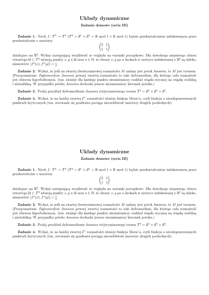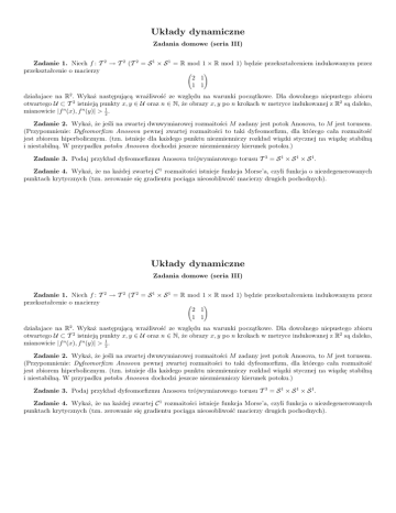 Układy dynamiczne Zadania domowe (seria III) Zadanie 1. Niech f : T 2 → T 2 (T 2 = S 1 × S 1 = R mod 1 × R mod 1) będzie przekształceniem indukowanym przez przekształcenie o macierzy ! 2 1 1 1 działajace na R2 . Wykaż następującą wrażliwość ze względu na warunki początkowe. Dla dowolnego niepustego zbioru otwartego U ⊂ T 2 istnieją punkty x, y ∈ U oraz n ∈ N, że obrazy x, y po n krokach w metryce indukowanej z R2 są daleko, mianowicie |f n (x), f n (y)| > 12 . Zadanie 2. Wykaż, że jeśli na zwartej dwuwymiarowej rozmaitości M zadany jest potok Anosova, to M jest torusem. (Przypomnienie: Dyfeomorfizm Anosova pewnej zwartej rozmaitości to taki dyfeomorfizm, dla którego cała rozmaitość jest zbiorem hiperbolicznym. (tzn. istnieje dla każdego punktu niezmienniczy rozkład wiązki stycznej na wiązkę stabilną i niestabilną. W przypadku potoku Anosova dochodzi jeszcze niezmienniczy kierunek potoku.) Zadanie 3. Podaj przykład dyfeomorfizmu Anosova trójwymiarowego torusu T 3 = S 1 × S 1 × S 1 . Zadanie 4. Wykaż, że na każdej zwartej C 1 rozmaitości istnieje funkcja Morse’a, czyli funkcja o niezdegenerowanych punktach krytycznych (tzn. zerowanie się gradientu pociąga nieosobliwość macierzy drugich pochodnych). Układy dynamiczne Zadania domowe (seria III) Zadanie 1. Niech f : T 2 → T 2 (T 2 = S 1 × S 1 = R mod 1 × R mod 1) będzie przekształceniem indukowanym przez przekształcenie o macierzy ! 2 1 1 1 działajace na R2 . Wykaż następującą wrażliwość ze względu na warunki początkowe. Dla dowolnego niepustego zbioru otwartego U ⊂ T 2 istnieją punkty x, y ∈ U oraz n ∈ N, że obrazy x, y po n krokach w metryce indukowanej z R2 są daleko, mianowicie |f n (x), f n (y)| > 12 . Zadanie 2. Wykaż, że jeśli na zwartej dwuwymiarowej rozmaitości M zadany jest potok Anosova, to M jest torusem. (Przypomnienie: Dyfeomorfizm Anosova pewnej zwartej rozmaitości to taki dyfeomorfizm, dla którego cała rozmaitość jest zbiorem hiperbolicznym. (tzn. istnieje dla każdego punktu niezmienniczy rozkład wiązki stycznej na wiązkę stabilną i niestabilną. W przypadku potoku Anosova dochodzi jeszcze niezmienniczy kierunek potoku.) Zadanie 3. Podaj przykład dyfeomorfizmu Anosova trójwymiarowego torusu T 3 = S 1 × S 1 × S 1 . Zadanie 4. Wykaż, że na każdej zwartej C 1 rozmaitości istnieje funkcja Morse’a, czyli funkcja o niezdegenerowanych punktach krytycznych (tzn. zerowanie się gradientu pociąga nieosobliwość macierzy drugich pochodnych).