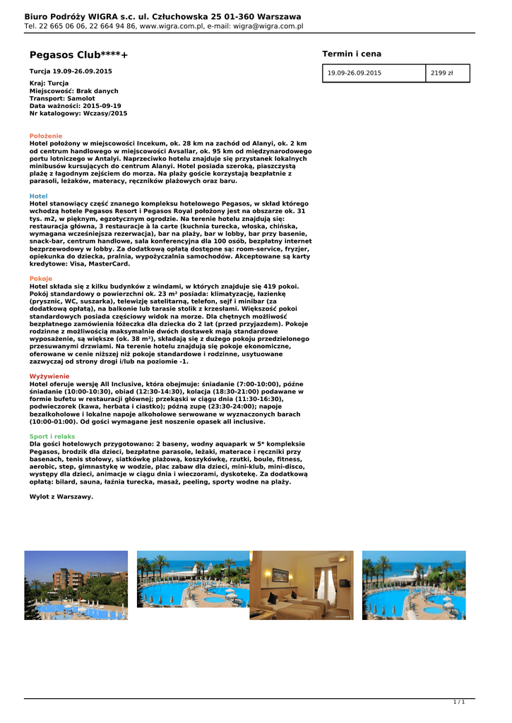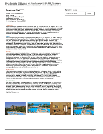 Biuro Podróży WIGRA s.c. ul. Człuchowska 25 01-360 Warszawa Tel. 22 665 06 06, 22 664 94 86, www.wigra.com.pl, e-mail: [email protected] Pegasos Club****+ Turcja 19.09-26.09.2015 Termin i cena 19.09-26.09.2015 2199 zł Kraj: Turcja Miejscowość: Brak danych Transport: Samolot Data ważności: 2015-09-19 Nr katalogowy: Wczasy/2015 Położenie Hotel położony w miejscowości Incekum, ok. 28 km na zachód od Alanyi, ok. 2 km od centrum handlowego w miejscowości Avsallar, ok. 95 km od międzynarodowego portu lotniczego w Antalyi. Naprzeciwko hotelu znajduje się przystanek lokalnych minibusów kursujących do centrum Alanyi. Hotel posiada szeroką, piaszczystą plażę z łagodnym zejściem do morza. Na plaży goście korzystają bezpłatnie z parasoli, leżaków, materacy, ręczników plażowych oraz baru. Hotel Hotel stanowiący część znanego kompleksu hotelowego Pegasos, w skład którego wchodzą hotele Pegasos Resort i Pegasos Royal położony jest na obszarze ok. 31 tys. m2, w pięknym, egzotycznym ogrodzie. Na terenie hotelu znajdują się: restauracja główna, 3 restauracje à la carte (kuchnia turecka, włoska, chińska, wymagana wcześniejsza rezerwacja), bar na plaży, bar w lobby, bar przy basenie, snack-bar, centrum handlowe, sala konferencyjna dla 100 osób, bezpłatny internet bezprzewodowy w lobby. Za dodatkową opłatą dostępne są: room-service, fryzjer, opiekunka do dziecka, pralnia, wypożyczalnia samochodów. Akceptowane są karty kredytowe: Visa, MasterCard. Pokoje Hotel składa się z kilku budynków z windami, w których znajduje się 419 pokoi. Pokój standardowy o powierzchni ok. 23 m² posiada: klimatyzację, łazienkę (prysznic, WC, suszarka), telewizję satelitarną, telefon, sejf i minibar (za dodatkową opłatą), na balkonie lub tarasie stolik z krzesłami. Większość pokoi standardowych posiada częściowy widok na morze. Dla chętnych możliwość bezpłatnego zamówienia łóżeczka dla dziecka do 2 lat (przed przyjazdem). Pokoje rodzinne z możliwością maksymalnie dwóch dostawek mają standardowe wyposażenie, są większe (ok. 38 m²), składają się z dużego pokoju przedzielonego przesuwanymi drzwiami. Na terenie hotelu znajdują się pokoje ekonomiczne, oferowane w cenie niższej niż pokoje standardowe i rodzinne, usytuowane zazwyczaj od strony drogi i/lub na poziomie -1. Wyżywienie Hotel oferuje wersję All Inclusive, która obejmuje: śniadanie (7:00-10:00), późne śniadanie (10:00-10:30), obiad (12:30-14:30), kolacja (18:30-21:00) podawane w formie bufetu w restauracji głównej; przekąski w ciągu dnia (11:30-16:30), podwieczorek (kawa, herbata i ciastko); późną zupę (23:30-24:00); napoje bezalkoholowe i lokalne napoje alkoholowe serwowane w wyznaczonych barach (10:00-01:00). Od gości wymagane jest noszenie opasek all inclusive. Sport i relaks Dla gości hotelowych przygotowano: 2 baseny, wodny aquapark w 5* kompleksie Pegasos, brodzik dla dzieci, bezpłatne parasole, leżaki, materace i ręczniki przy basenach, tenis stołowy, siatkówkę plażową, koszykówkę, rzutki, boule, fitness, aerobic, step, gimnastykę w wodzie, plac zabaw dla dzieci, mini-klub, mini-disco, występy dla dzieci, animacje w ciągu dnia i wieczorami, dyskotekę. Za dodatkową opłatą: bilard, sauna, łaźnia turecka, masaż, peeling, sporty wodne na plaży. Wylot z Warszawy. 1/1 Powered by TCPDF (www.tcpdf.org)