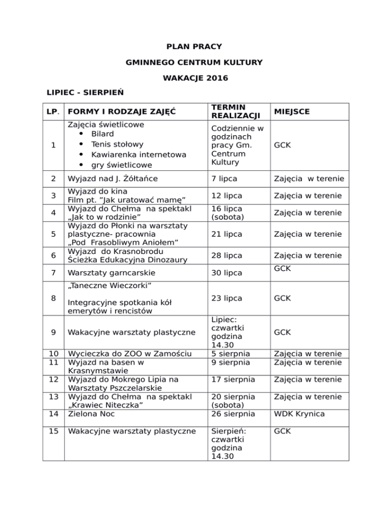 PLAN PRACY GMINNEGO CENTRUM KULTURY WAKACJE 2016