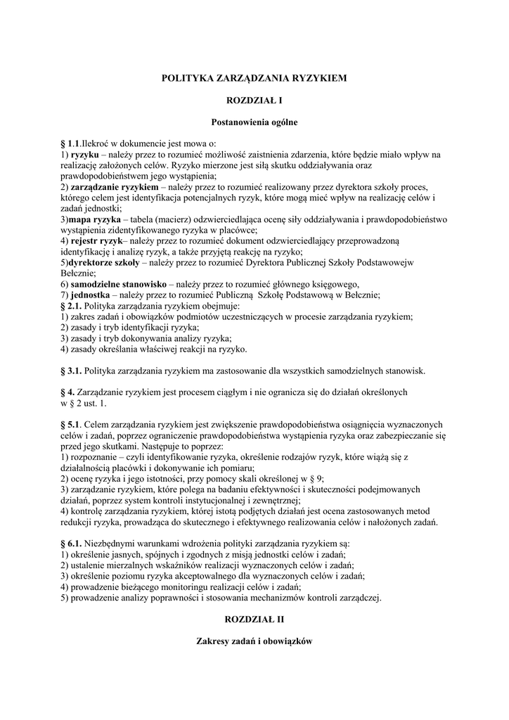POLITYKA ZARZĄDZANIA RYZYKIEM ROZDZIAŁ I Postanowienia ogólne § 1.1.Ilekroć w dokumencie jest mowa o: 1) ryzyku – należy przez to rozumieć możliwość zaistnienia zdarzenia, które będzie miało wpływ na realizację założonych celów. Ryzyko mierzone jest siłą skutku oddziaływania oraz prawdopodobieństwem jego wystąpienia; 2) zarządzanie ryzykiem – należy przez to rozumieć realizowany przez dyrektora szkoły proces, którego celem jest identyfikacja potencjalnych ryzyk, które mogą mieć wpływ na realizację celów i zadań jednostki; 3)mapa ryzyka – tabela (macierz) odzwierciedlająca ocenę siły oddziaływania i prawdopodobieństwo wystąpienia zidentyfikowanego ryzyka w placówce; 4) rejestr ryzyk– należy przez to rozumieć dokument odzwierciedlający przeprowadzoną identyfikację i analizę ryzyk, a także przyjętą reakcję na ryzyko; 5)dyrektorze szkoły – należy przez to rozumieć Dyrektora Publicznej Szkoły Podstawowejw Bełcznie; 6) samodzielne stanowisko – należy przez to rozumieć głównego księgowego, 7) jednostka – należy przez to rozumieć Publiczną Szkołę Podstawową w Bełcznie; § 2.1. Polityka zarządzania ryzykiem obejmuje: 1) zakres zadań i obowiązków podmiotów uczestniczących w procesie zarządzania ryzykiem; 2) zasady i tryb identyfikacji ryzyka; 3) zasady i tryb dokonywania analizy ryzyka; 4) zasady określania właściwej reakcji na ryzyko. § 3.1. Polityka zarządzania ryzykiem ma zastosowanie dla wszystkich samodzielnych stanowisk. § 4. Zarządzanie ryzykiem jest procesem ciągłym i nie ogranicza się do działań określonych w § 2 ust. 1. § 5.1. Celem zarządzania ryzykiem jest zwiększenie prawdopodobieństwa osiągnięcia wyznaczonych celów i zadań, poprzez ograniczenie prawdopodobieństwa wystąpienia ryzyka oraz zabezpieczanie się przed jego skutkami. Następuje to poprzez: 1) rozpoznanie – czyli identyfikowanie ryzyka, określenie rodzajów ryzyk, które wiążą się z działalnością placówki i dokonywanie ich pomiaru; 2) ocenę ryzyka i jego istotności, przy pomocy skali określonej w § 9; 3) zarządzanie ryzykiem, które polega na badaniu efektywności i skuteczności podejmowanych działań, poprzez system kontroli instytucjonalnej i zewnętrznej; 4) kontrolę zarządzania ryzykiem, której istotą podjętych działań jest ocena zastosowanych metod redukcji ryzyka, prowadząca do skutecznego i efektywnego realizowania celów i nałożonych zadań. § 6.1. Niezbędnymi warunkami wdrożenia polityki zarządzania ryzykiem są: 1) określenie jasnych, spójnych i zgodnych z misją jednostki celów i zadań; 2) ustalenie mierzalnych wskaźników realizacji wyznaczonych celów i zadań; 3) określenie poziomu ryzyka akceptowalnego dla wyznaczonych celów i zadań; 4) prowadzenie bieżącego monitoringu realizacji celów i zadań; 5) prowadzenie analizy poprawności i stosowania mechanizmów kontroli zarządczej. ROZDZIAŁ II Zakresy zadań i obowiązków § 7.1. Za realizację polityki zarządzania ryzykiem odpowiada Dyrektor szkoły poprzez: 1) kształtowanie i wdrażanie polityki zarządzania ryzykiem; 2) nadzór i monitorowanie skuteczności procesu zarządzania ryzykiem; 3) wyznaczanie poziomu akceptowalnego dla każdego ryzyka; 4) podejmowanie decyzji dotyczących sposobu reakcji na poszczególne ryzyka. 2. Pracownicy na samodzielnych stanowiskach odpowiadają za zarządzanie ryzykiem poprzez: 1) identyfikację ryzyk związanych z realizacją przydzielonych zadań; 2) wskazywanie właścicieli zidentyfikowanych ryzyk; 3) przeprowadzanie analizy zidentyfikowanego ryzyka; 4) proponowanie sposobu postępowania w odniesieniu do poszczególnych ryzyk; 5) wdrażanie działań zaradczych w stosunku do zidentyfikowanego ryzyka. 3. Pracownicy wymienieni w ust.2 są zobowiązani do współpracy z dyrektorem szkoły. ROZDZIAŁ III Identyfikacja ryzyka § 8.1. Identyfikacja ryzyk prowadzona jest na poziomie jednostki i na poziomie poszczególnych samodzielnych stanowisk pracy. 2. Proces identyfikacji ryzyka odbywa się raz w ciągu roku kalendarzowego, nie później niż w ostatnim dniu roboczym listopada. 3. W procesie identyfikacji ryzyka uwzględnia się czynniki sprzyjające wystąpieniu ryzyk według obszarów wrażliwych, określonych w załączniku nr 1 do Polityki Zarządzania Ryzykiem. 4. W procesie identyfikacji ryzyka uwzględnia się czynniki je kształtujące. Ze względu na ich źródło ryzyka dzielą się na: 1) zewnętrzne – rodzaj ryzyka determinowanego przez czynniki zewnętrzne; 2) wewnętrzne – ryzyko to obejmuje działania wewnętrzne placówki i może być zarządzane wewnątrz jednostki. 5. Każde zidentyfikowane ryzyko ujmuje się w rejestrze, stanowiącym załącznik nr 2 do Polityki Zarządzania Ryzykiem. 6. Dla każdego zidentyfikowanego ryzyka ustala się jego właściciela. 7. Każdy pracownik ma prawo i obowiązek zgłaszania swojemu bezpośredniemu przełożonemu ryzyk zidentyfikowanych podczas wykonywania przydzielonych zadań. ROZDZIAŁ IV Analiza ryzyka § 9.1. Każde ryzyko podlega analizie pod kątem jego istotności na osiąganie celów i zadań. Istotność ryzyka jest iloczynem skali prawdopodobieństwa jego wystąpienia i wartości oszacowanych potencjalnych skutków. 2. Każde ryzyko jest oceniane pod względem prawdopodobieństwa jego wystąpienia (p) i skutku oddziaływania (s). 3. W celu dokonania oceny ryzyka wykorzystuje się Mapę Ryzyka, która stanowi macierz prawdopodobieństwo - skutek.- załącznik nr 3 do Polityki Zarządzania Ryzykiem. 4. Mapa ryzyka definiuje ryzyka na : 1) niskie o wartości 4 i mniejszej; 2) średnie o wartości powyżej 4 i mniejszej niż 15; 3) wysokie – o wartości powyżej 15. 5. Przy ocenie prawdopodobnych skutków wystąpienia ryzyka przyjmuje się skalę punktową od 1 do 5, gdzie; 1) 1 – oznacza skutek nieznaczny, 2) 2 – oznacza skutek mały, 3) 3 – oznacza skutek średni, 4) 4 – oznacza skutek poważ