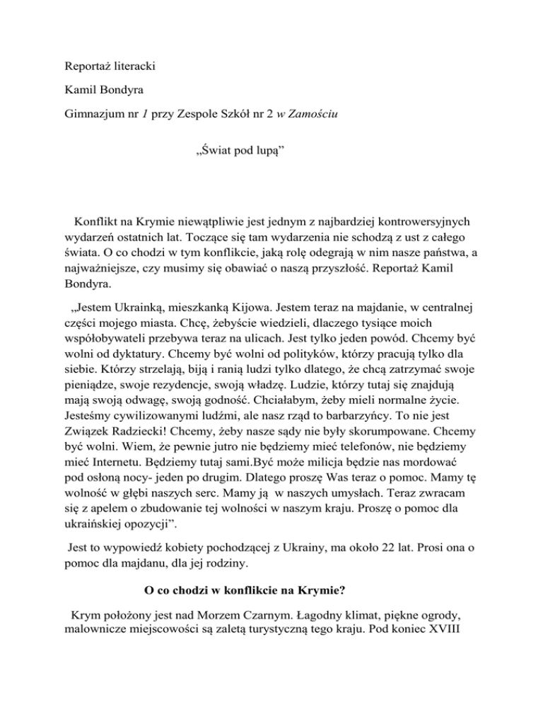 Reportaż literacki Kamil Bondyra Gimnazjum nr 1 przy Zespole Szkół nr 2 w Zamościu „Świat pod lupą” Konflikt na Krymie niewątpliwie jest jednym z najbardziej kontrowersyjnych wydarzeń ostatnich lat. Toczące się tam wydarzenia nie schodzą z ust z całego świata. O co chodzi w tym konflikcie, jaką rolę odegrają w nim nasze państwa, a najważniejsze, czy musimy się obawiać o naszą przyszłość. Reportaż Kamil Bondyra. „Jestem Ukrainką, mieszkanką Kijowa. Jestem teraz na majdanie, w centralnej części mojego miasta. Chcę, żebyście wiedzieli, dlaczego tysiące moich współobywateli przebywa teraz na ulicach. Jest tylko jeden powód. Chcemy być wolni od dyktatury. Chcemy być wolni od polityków, którzy pracują tylko dla siebie. Którzy strzelają, biją i ranią ludzi tylko dlatego, że chcą zatrzymać swoje pieniądze, swoje rezydencje, swoją władzę. Ludzie, którzy tutaj się znajdują mają swoją odwagę, swoją godność. Chciałabym, żeby mieli normalne życie. Jesteśmy cywilizowanymi ludźmi, ale nasz rząd to barbarzyńcy. To nie jest Związek Radziecki! Chcemy, żeby nasze sądy nie były skorumpowane. Chcemy być wolni. Wiem, że pewnie jutro nie będziemy mieć telefonów, nie będziemy mieć Internetu. Będziemy tutaj sami.Być może milicja będzie nas mordować pod osłoną nocy- jeden po drugim. Dlatego proszę Was teraz o pomoc. Mamy tę wolność w głębi naszych serc. Mamy ją w naszych umysłach. Teraz zwracam się z apelem o zbudowanie tej wolności w naszym kraju. Proszę o pomoc dla ukraińskiej opozycji”. Jest to wypowiedź kobiety pochodzącej z Ukrainy, ma około 22 lat. Prosi ona o pomoc dla majdanu, dla jej rodziny. O co chodzi w konflikcie na Krymie? Krym położony jest nad Morzem Czarnym. Łagodny klimat, piękne ogrody, malownicze miejscowości są zaletą turystyczną tego kraju. Pod koniec XVIII wieku w wyniku wygranej wojny z Turcją trafił w ręce Rosji. Należy nadmienić, że Krym stał się najbardziej prestiżowym regionem rosyjskim. Dokładano wszelkich starań, aby Krym zamieszkiwali wyłącznie Rosjanie. Za czasów rządów Józefa Stalina stopniowo wysiedlano z Krymu potomków Tatarów, a na ich miejsce sprowadzano Rosjan. W 1954 roku Ukraina przyjęła półwysep. Otrzymała go od Związku Radzieckiego w prezencie z okazji trzysetnej rocznicy zawarcia ugody perejasławskiej, na mocy której została niegdyś poddana władzy Rosji. Nikita Chruszczow nie myślał o potencjalnych konsekwencjach swoich działań. Ukraina była jedną z republik wchodzącą w skład ZSRR. Nikt nie przewidywał, że Krym się rozpadnie. W 1991 roku półwysep przyłączono do Ukrainy, w wyniku podziału granic poszczególnych republik Związku Socjalistycznych Republik Radzieckich. Krym został przyłączony wtedy do Ukrainy. Jednak 60 procent ludności stanowili rodowici Rosjanie. Decyzja ta nie spotkała się z ciepłym przyjęciem. Rosyjscy mieszkańcy Krymu chcieli włączenia tego terenu z powrotem do Rosji lub pozostać ludnością niezależną. Wkrótce teren Półwyspu Krymskiego stał się republiką autonomiczną. Pozostawali w wielu względach pod zwierzchnictwem Ukrainy, ale pod rządami Rosji. Na Krymie stacjonuje Flota Czarnomorska. Na mocy umowy zawartej przez Wiktora Janukowycza pozostanie ona do roku 2042. Po rozpadzie ZSRR ukraiński rząd starał się, by wszystkie okręty wchodzące w skład floty przeszły w jego ręce. Na skutek sprzeciwu Rosji trzeba było posiłkować się kompromisem – tylko część z nich przekazano Ukrainie. Dla Rosji Krym stanowi znakomitą bazę wypadową dla wojska rosyjskiego. Innym problemem są stanowiącym spór są złoża gazów . Rosja nie chce się zgodzić na podpisanie umowy z międzynarodowym konsorcjum w sprawie wykorzystywania gazów przez inne kraje. Dla Rosji stanowi to problem. Boją się, że Ukraińcy będą całkowicie niezależni od Moskwy. Znamy już stanowisko Ukrainy w tej sprawie. Dowiedzmy się teraz, co o tym sądzi strona agresorów. Michaił Leontiew, rosyjski, pro kremlowski publicysta, dziennikarz telewizyjny, a od niedawna wiceprezes koncernu Rosnieft udzielił niedawno wywiadu dla miesięcznika” Newsweek”, w którym mówi jak postrzega wydarzenia, które dzieją się na Krymie. Oto najciekawsze fragmenty. Newsweek: Rosja będzie krytykowana przez świat, znajdzie się w izolacji. Michaił Leontiew: I tak jest w izolacji. Nam już wszystko jedno. Czasem zresztą dobrze jest być w izolacji. Jak siedzisz w toalecie i załatwiasz swoje sprawy, to chyba lepiej, jak drzwi są zamknięte, tak? Jak będą otwarte, to jeszcze ktoś wejdzie i nie tylko będzie oglądał, a jeszcze zrobi ci krzywdę, kiedy siedzisz ze spuszczonymi spodniami? Dlatego lepiej czasem się odseparować od krążących po świecie głupich idei. Od oszustów. Izolacja jest dobrym pomysłem jednak tylko na krótką metę. Z biegiem czasu Rosja poczuje zgubne skutki swej decyzji. Wtedy przedstawiciele władzy zmienią pogląd na tę sprawę. Oto inna wypowiedź : Newsweek: Patrząc na wydarzenia na Krymie, nietrudno sobie wyobrazić, że byle incydent i tak sprowokuje wojnę. Michaił Leontiew: Kijów może taki incydent łatwo sprowokować. Już podburza krymskich Tatarów. Wszyscy powinni zrozumieć, że incydent może się zdarzyć, ale to nie Rosja będzie jego inicjatorem. I rządząca w Kijowie swołocz powinna wiedzieć, czym to się skończy. Jeśli kijowscy towarzysze coś sprowokują, to skończy się to dla nich tragicznie. Na początku stracą całą wschodnią i południową Ukrainę. Myślicie, że ktoś będzie walczył z rosyjską armią w takim Doniecku? Część ludzi ucieknie, ale większość pobiegnie do tego, kto będzie im płacił pensje. W przytoczonym komentarzu jest wiele racji. Rosja ma przewagę nad ludźmi z Ukrainy.Aby mieć szanse na wygraną ,rząd pod żadnym pozorem nie może dać się sprowokować. Krym musi prowadzić ostrożną i bardzo p